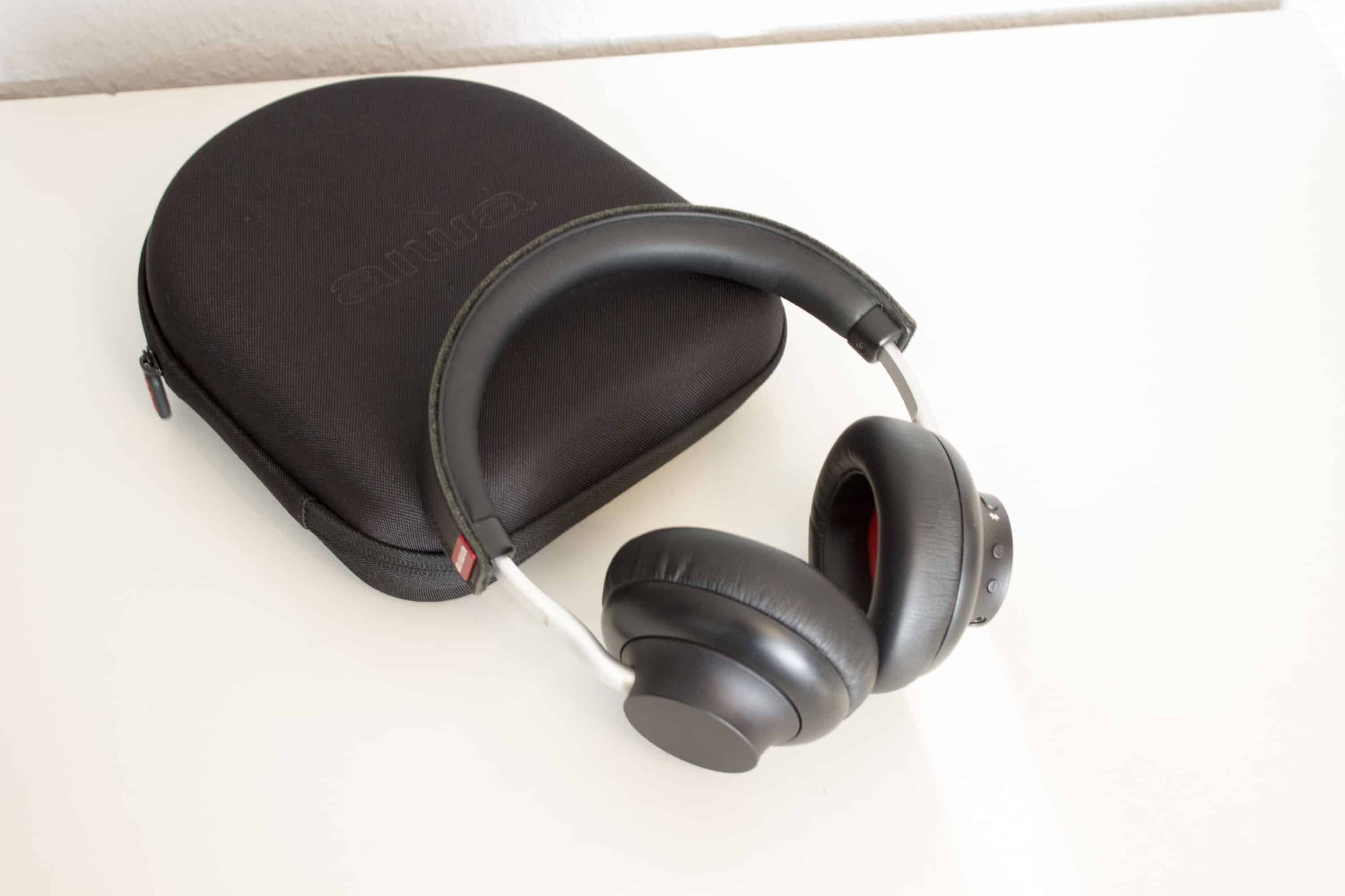 There’s not that much in that fancy box. First we see a hardcover bag with the rest in it. Besides the headphones themselves there is also a MicroUSB cable, a 3.5mm jack cable and the obligatory paperwork.