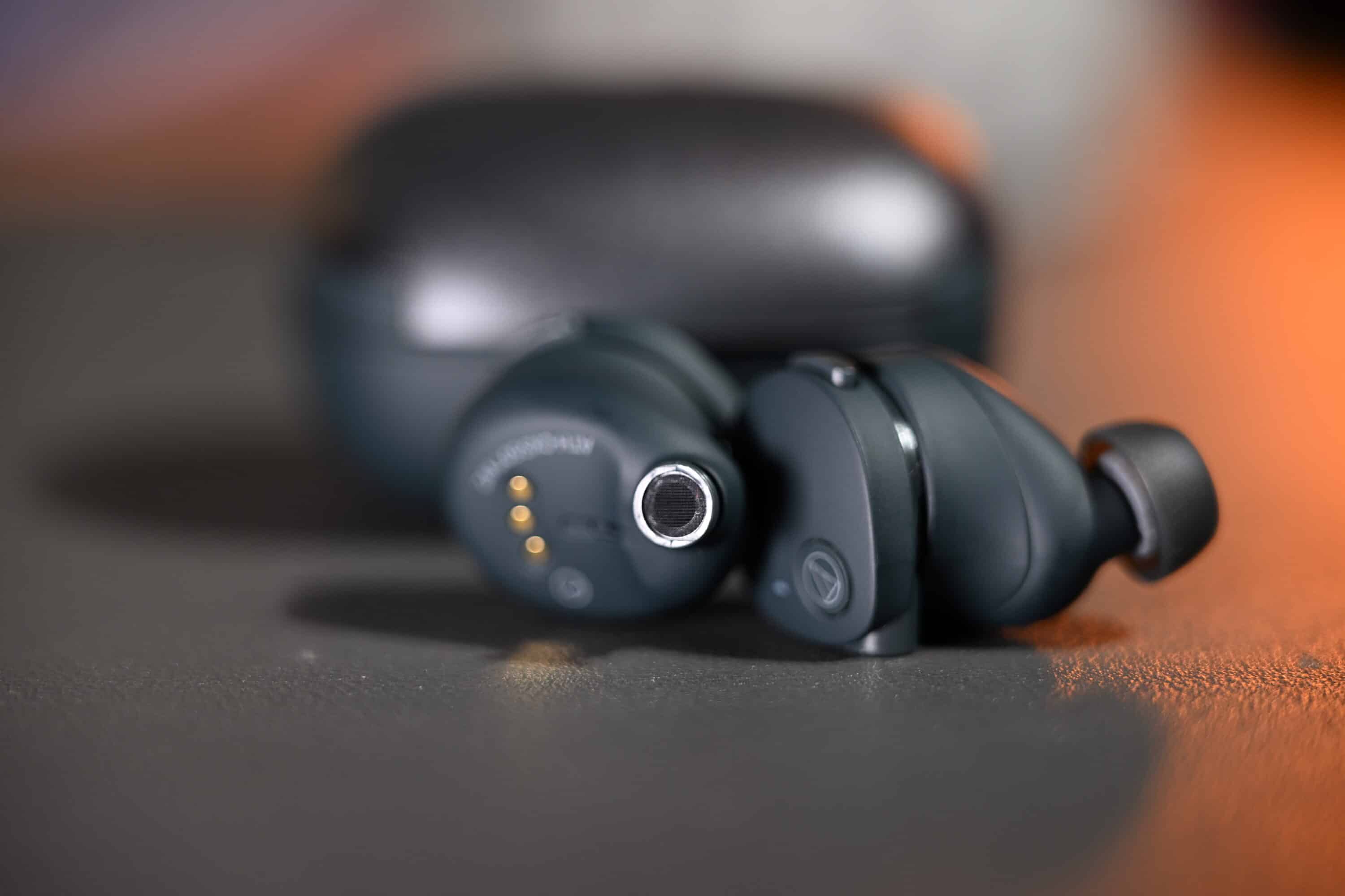 The ATH-CKS50TW2 are controlled via physical multifunction buttons on each earbud instead of touch surfaces. These are located on the top of the earbuds. This ensures reliable and very precise operation – even with wet hands or gloves. I really like the operating concept, as it minimizes input errors.