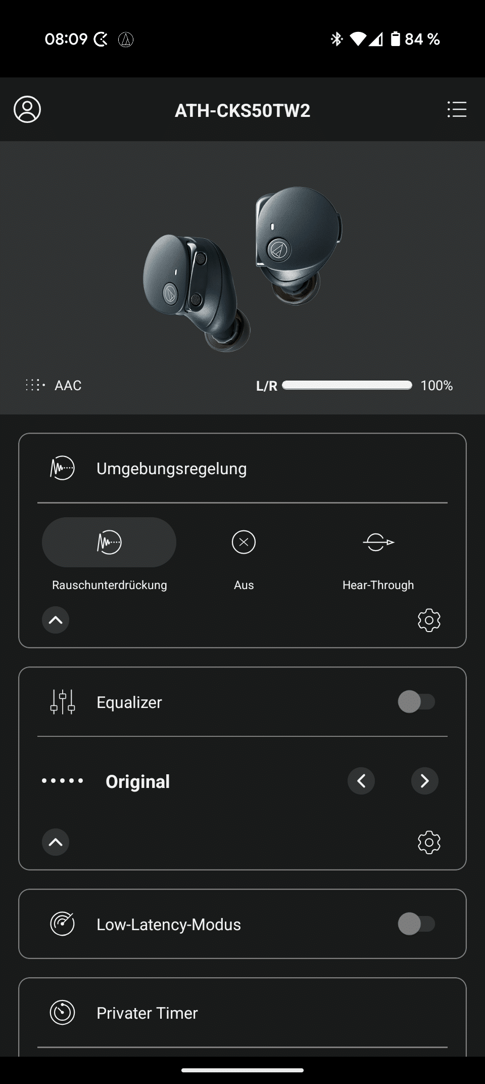 The associated “A-T Connect” app impresses with a clear interface, several equalizer presets, a 5-band equalizer and extras such as soundscapes (natural sounds, white noise). No account is required, all settings can be made without registration.