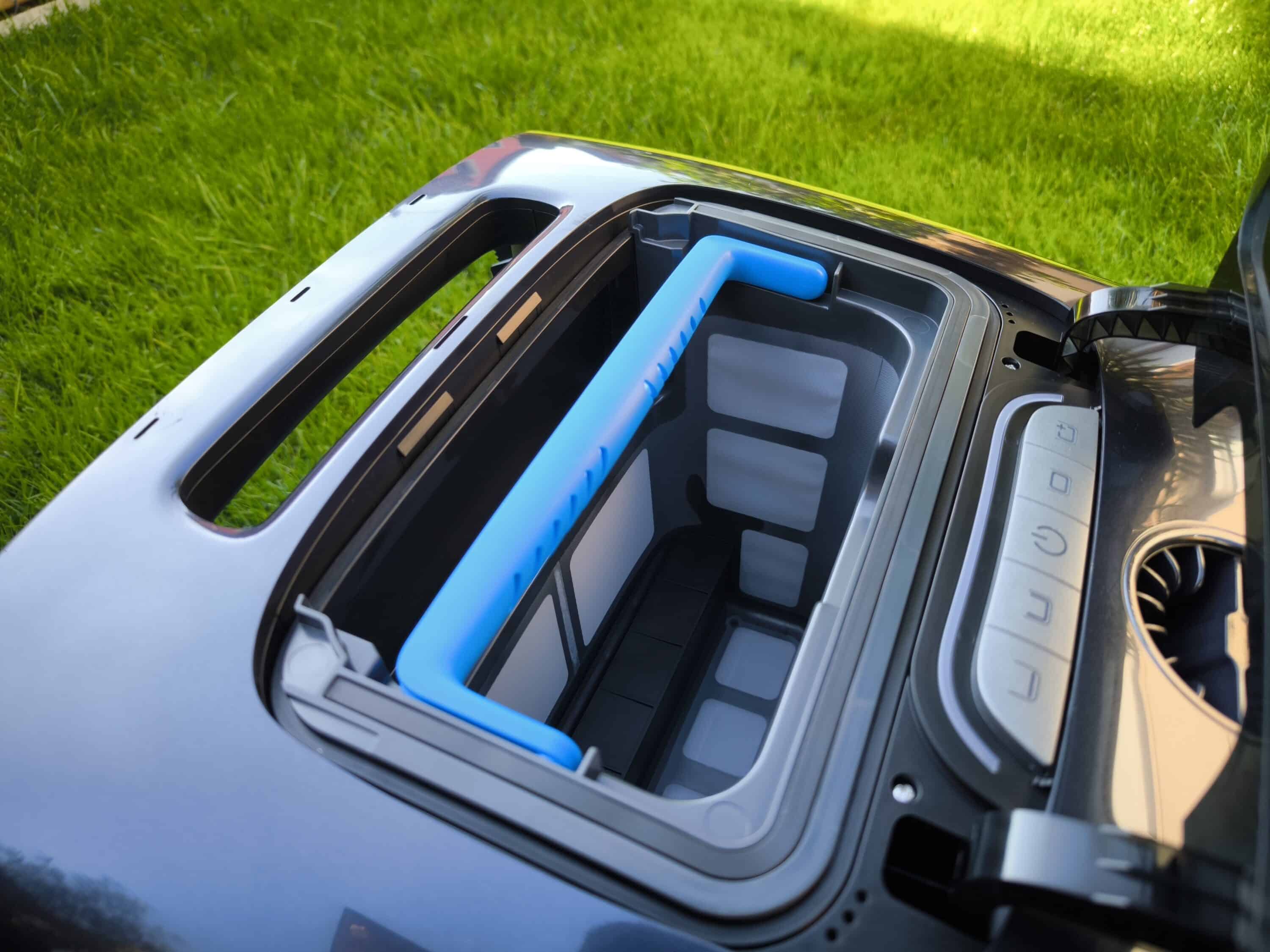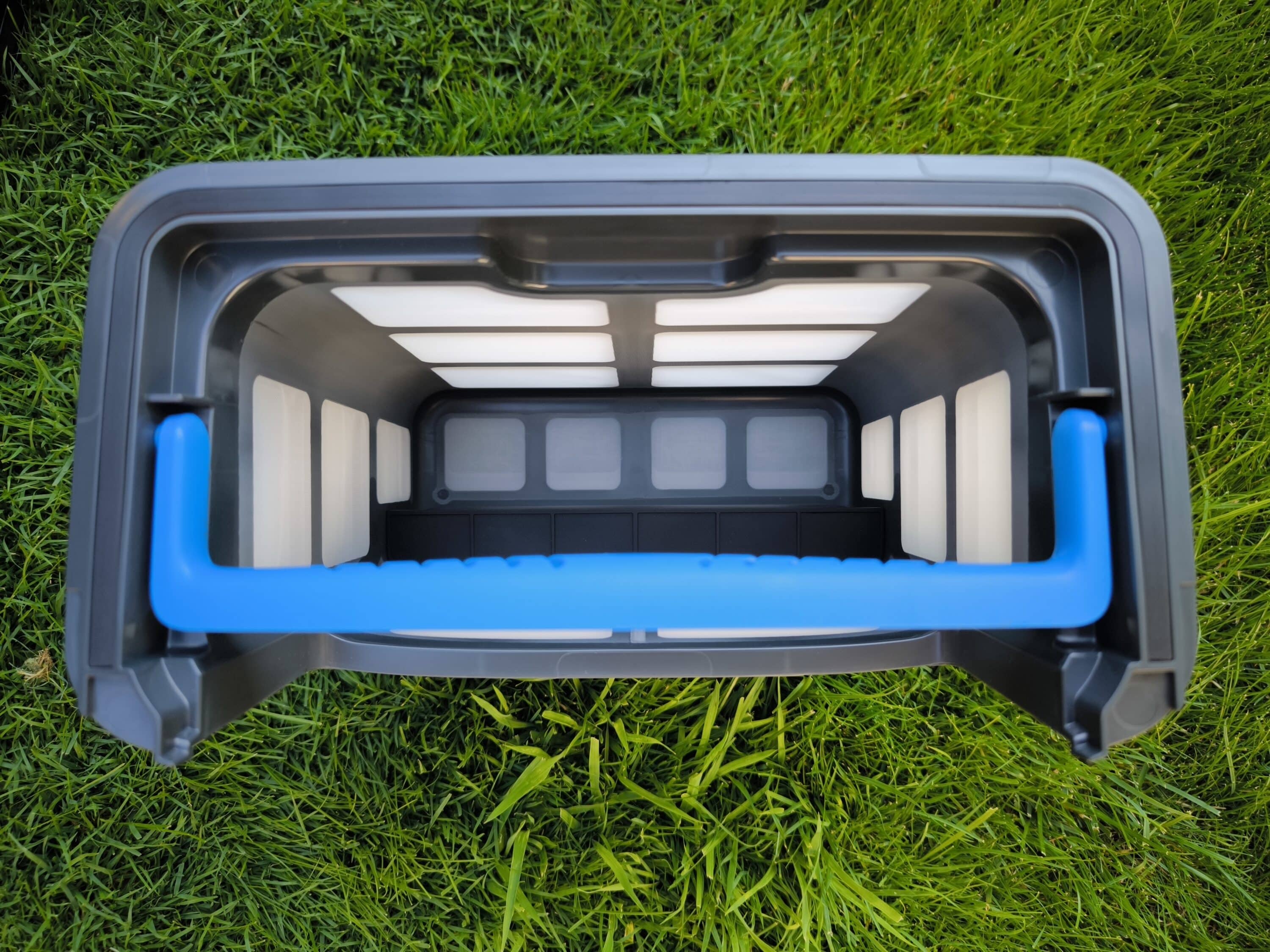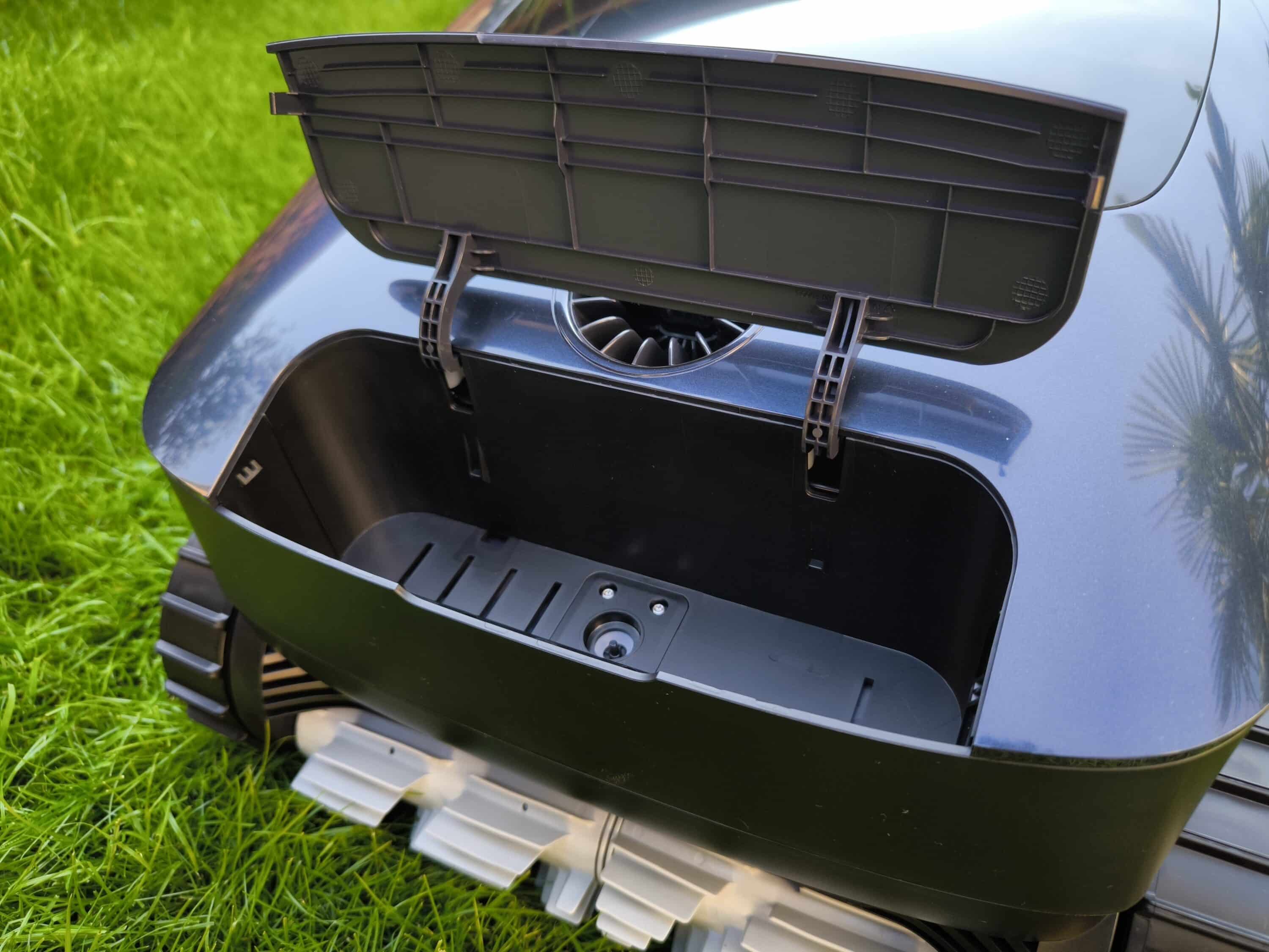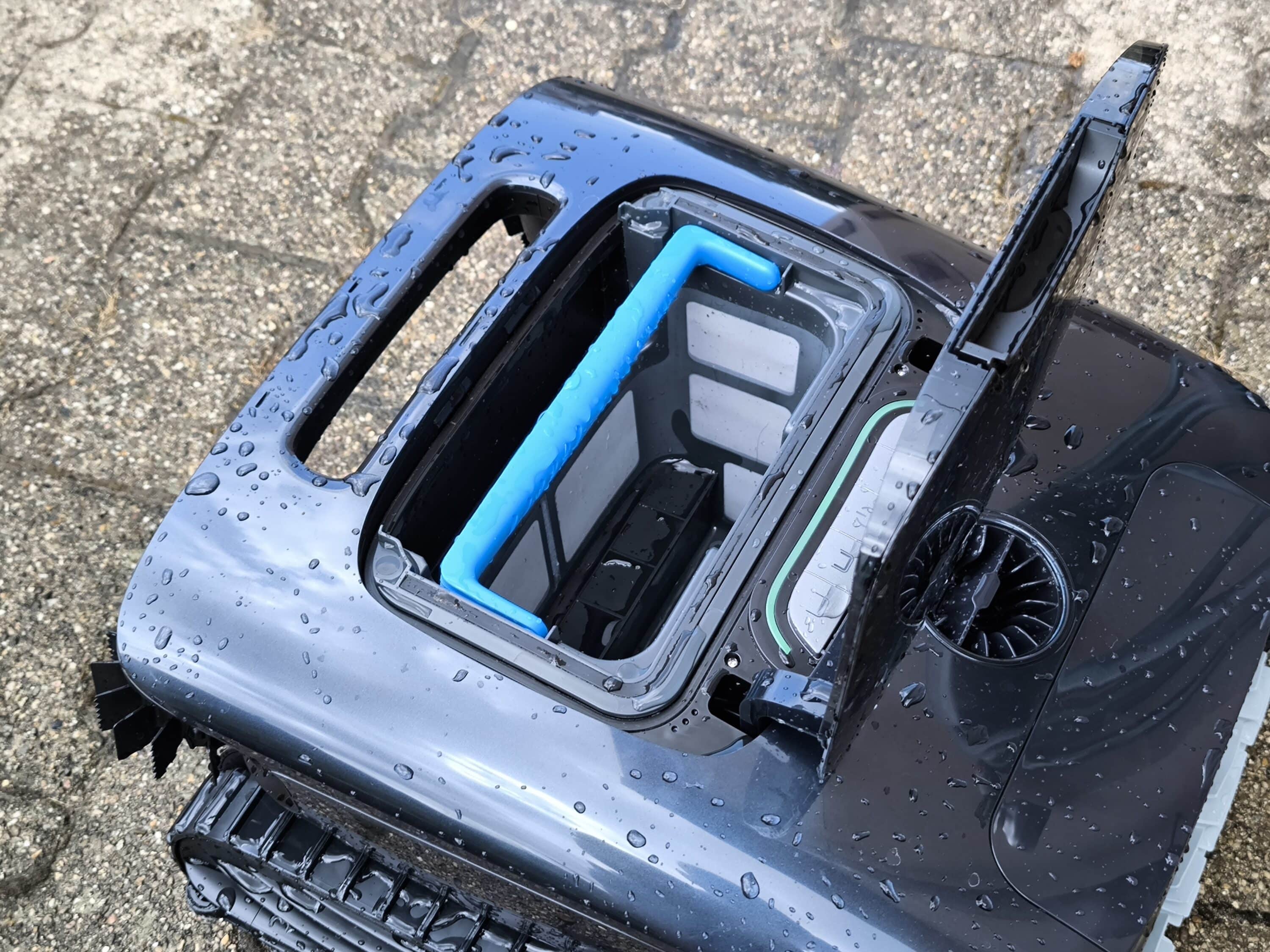 The filter basket is located under the dark cover on the head side and holds around 0.3 liters more than the Pro model. To open the filter basket lid, there is a pressure switch at the height of the carrying handle. This is used to unlock the lid, allowing it to be lifted. Now the double basket is revealed, as it is a double filter with different finenesses. While the 4-liter filter basket works with a filter density of 150 µm + 250 µm, the 3.7-liter thinner basket also has a filter density of 250 µm. A special anti-blocking system also prevents the annoying problem of clogged filters. Furthermore, the use of the double basket ensures both improved efficiency and even finer filtration. Grains of sand and other tiny particles are captured particularly thoroughly. The AIPER Scuba X1 already works in a similar way (our test).