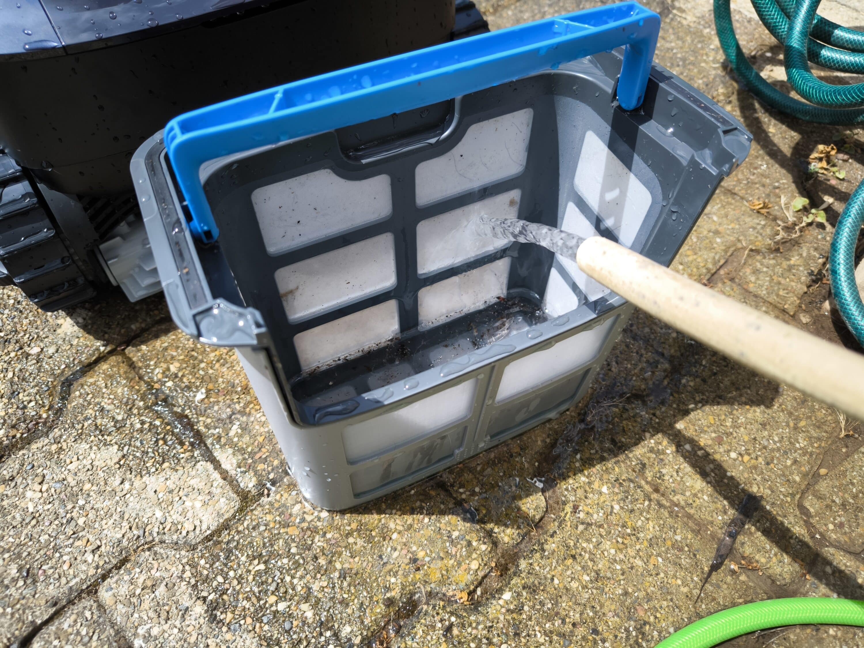 The first step in cleaning is to open the housing cover using the pressure switch. The double basket can then be easily removed using the blue handle and rinsed out with the garden hose. The fine particles are sometimes a little more stubborn, so it is best to clean the inside and outside. Finally, the filter basket is put back into the Beatbot AquaSense 2 Ultra, its handle folded in and the housing cover closed.