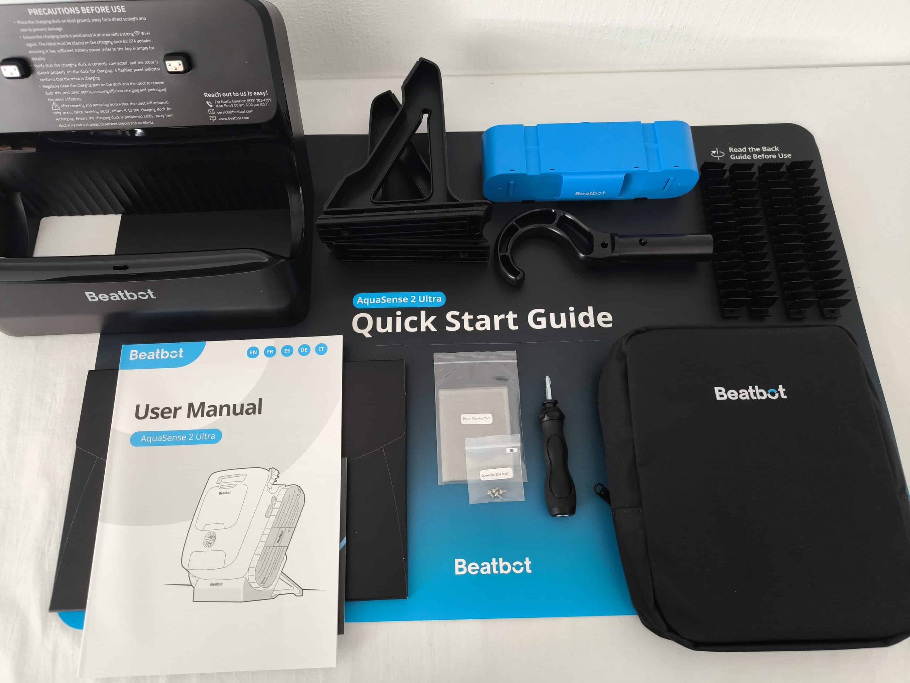 The Beatbot AquaSense 2 Ultra is supplied in two packages. The first thing that catches the eye when opening the main box is the quick start guide, which is spread across the entire surface. Once set aside, an envelope containing the other documents, such as the operating instructions, is also revealed. Another step down, the carefully packaged AquaSense 2 Ultra is revealed.