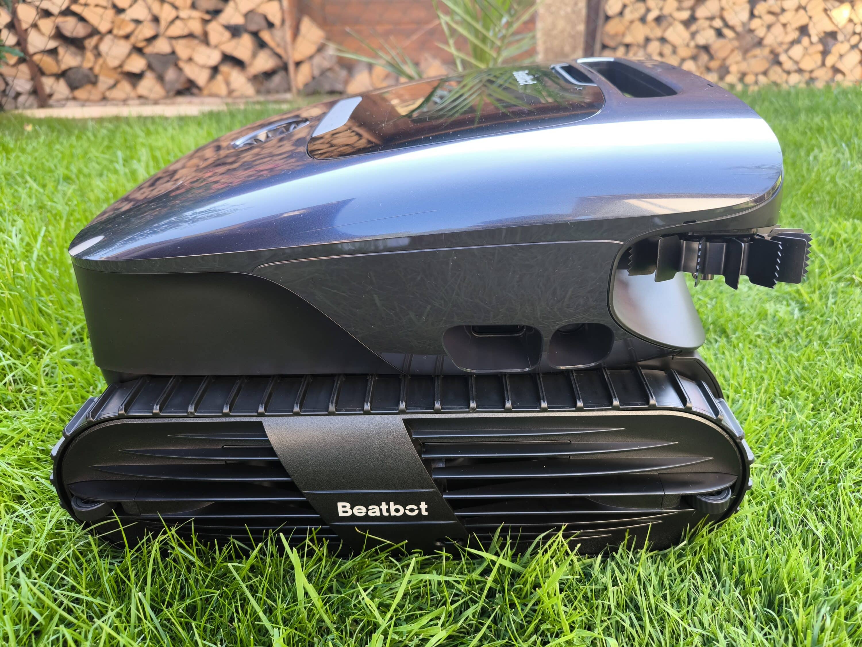 The Beatbot AquaSense 2 Ultra makes a clearly defined and modern impression at first glance. Its design impresses with its simplicity, soft contours and a futuristic touch, which is given in particular by the pronounced side brushes on the front. Essentially, the basic concept with the caterpillar tracks and the four large roller brushes, two on each side, has remained unchanged from the previous series. As far as the color scheme is concerned, it makes quite an impression visually and really sets itself apart from other pool robots in this segment. This is mainly due to the predominantly dark surface, which reflects in the sun and is reminiscent of the metallic look of new cars. In fact, the manufacturer even took inspiration from the automotive industry when developing the pool robot and gave it an IMR coating. This makes the Ultra even more resistant to scratches and UV rays and more resistant to abrasion.
