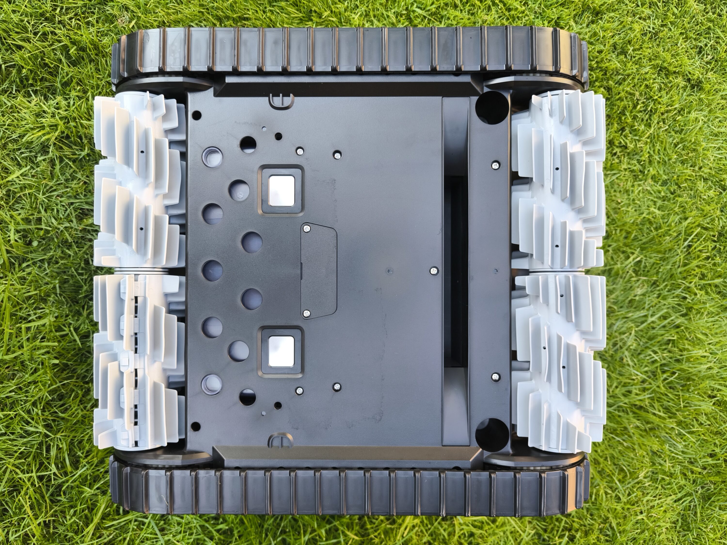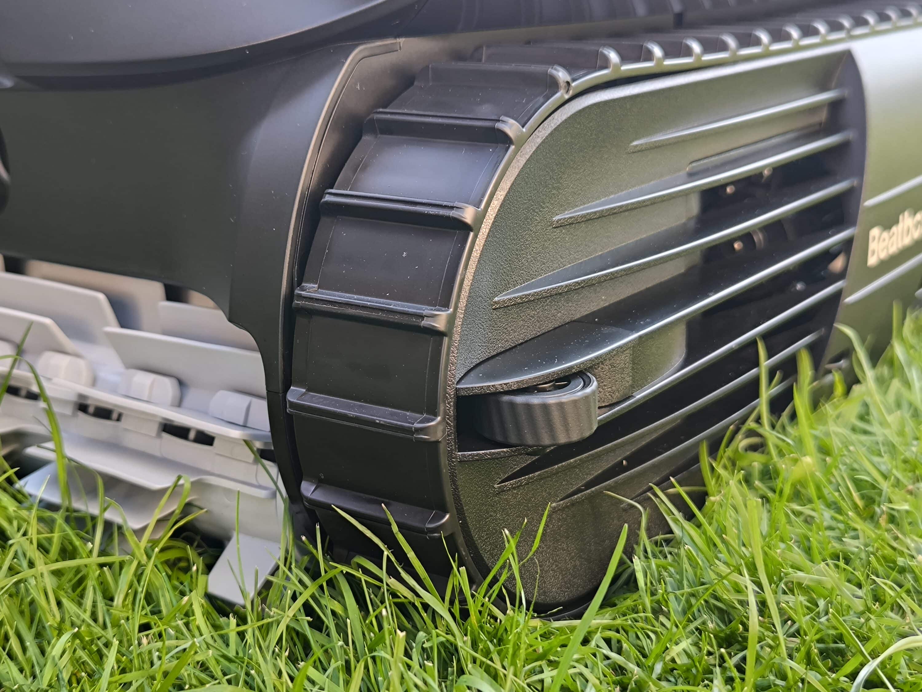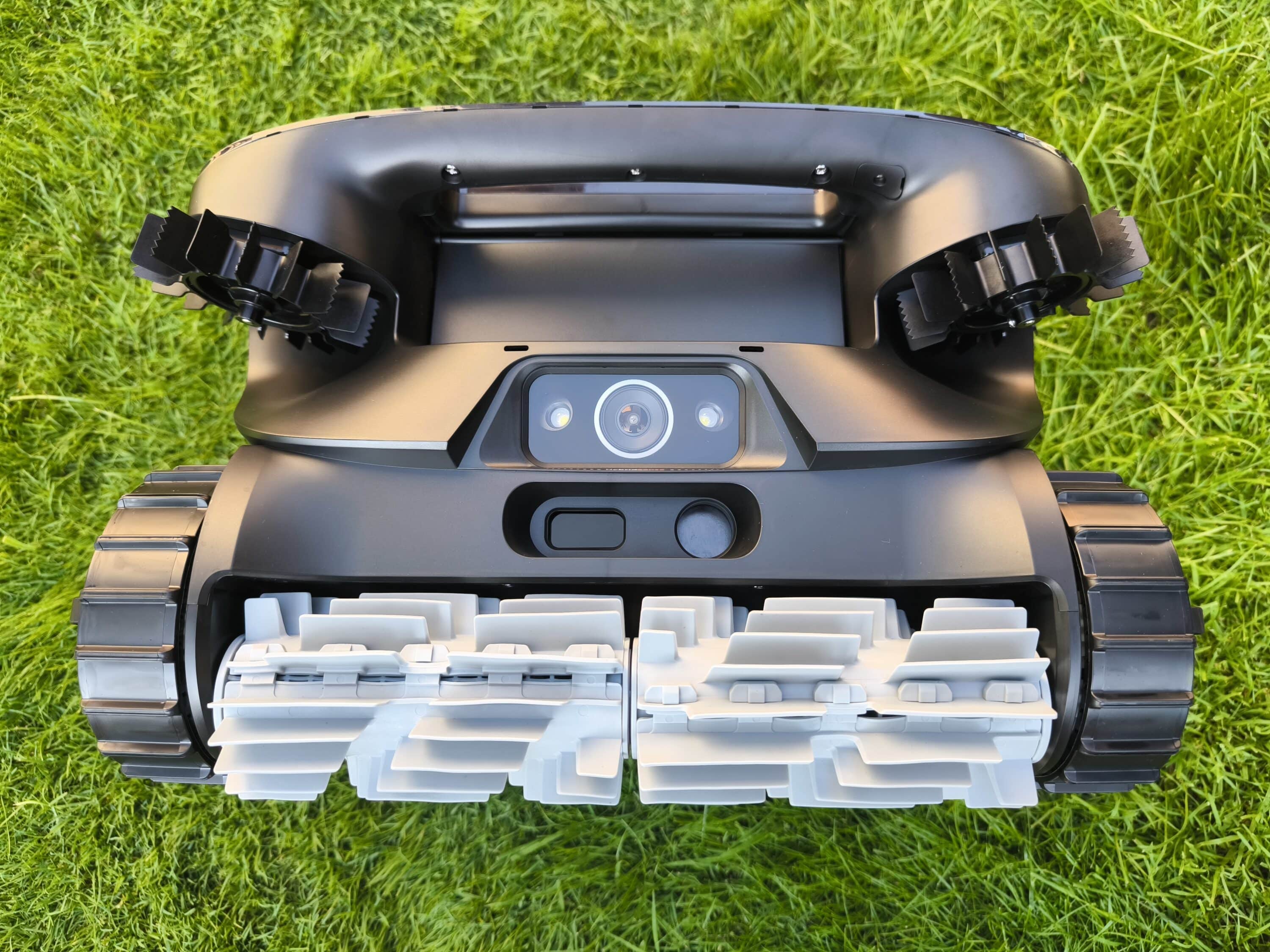 The numerous sensors on the front immediately catch the eye. There are not only two additional lights under the skimmer flap, but also the AI vision sensor. A TOF sensor and two ultrasonic sensors are also used one level below. The same applies to the right-hand side, where ultrasonic sensors and an infrared-based ToF sensor are also integrated. These are used to scan the side of the pool robot, while the front of the device naturally captures the Beatbot AquaSense 2 Ultra’s direct field of vision. Surprisingly, there are even two ultrasonic sensors on the bottom side, which are used to scan the surface. One detail that the Beatbot AquaSense (our test) has so far lacked is probably the six side guide wheels on the Ultra model. Their task is not only to protect the housing from wear and tear, but they also play a decisive role in wall guidance and obstacle avoidance. Last but not least, there are also loudspeakers on board, which the pool robot uses to make announcements.