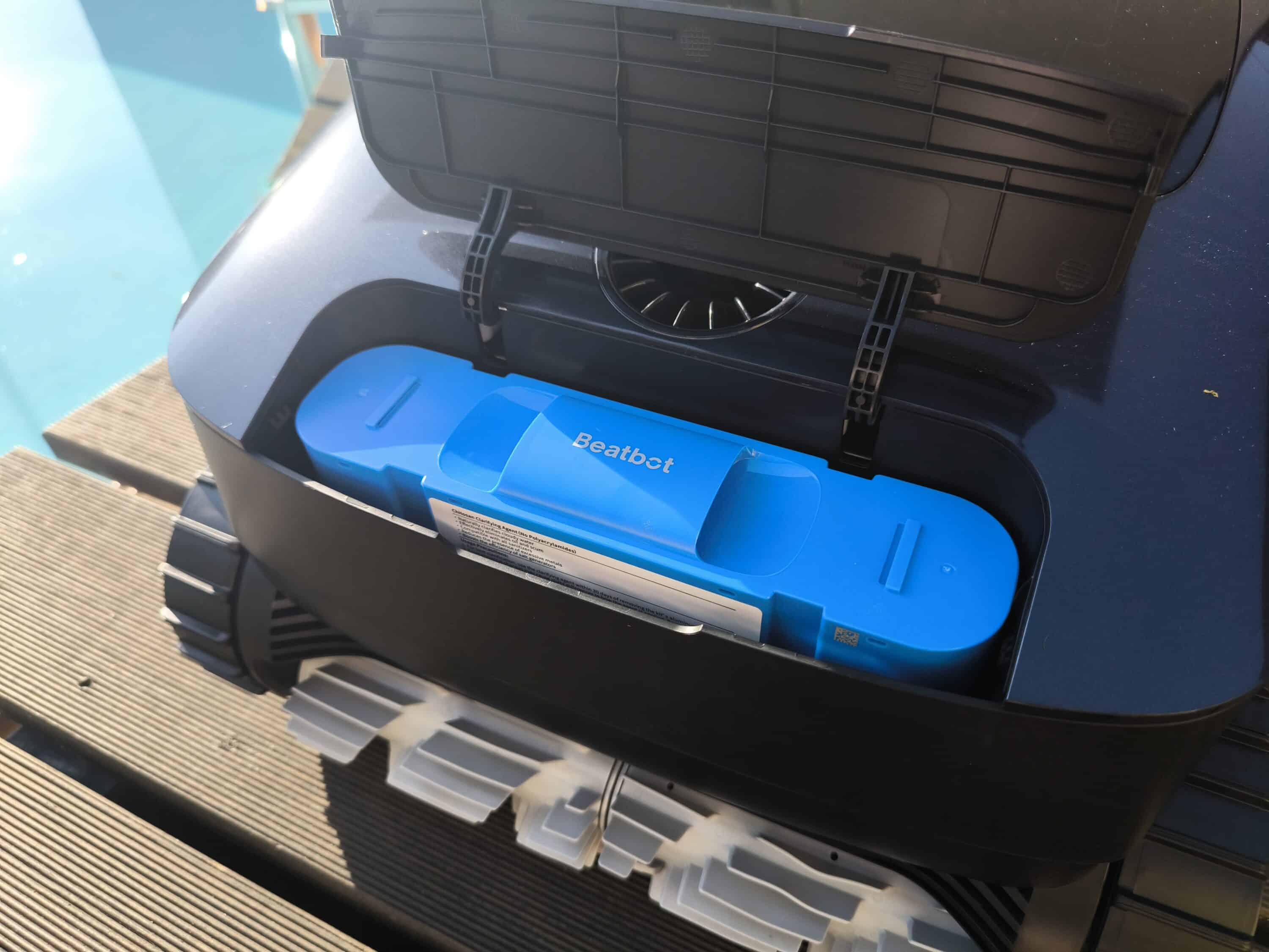 As an innovation, already known from the Beatbot iSkim Ultra (our test) and AquaSense Pro of the first generation, a separate compartment for clarifier has been added. Thanks to its production from recycled crab shells, this clarifier is gentle on the skin and therefore free from harmful chemicals. Nevertheless, dirt, oils and residues can be removed more quickly and easily than with standard clarifying agents. The corresponding compartment is located on the back of the pool robot, while the use of the clarifier can be conveniently controlled via the Beatbot app or alternatively by pressing and holding the mode button for three seconds.