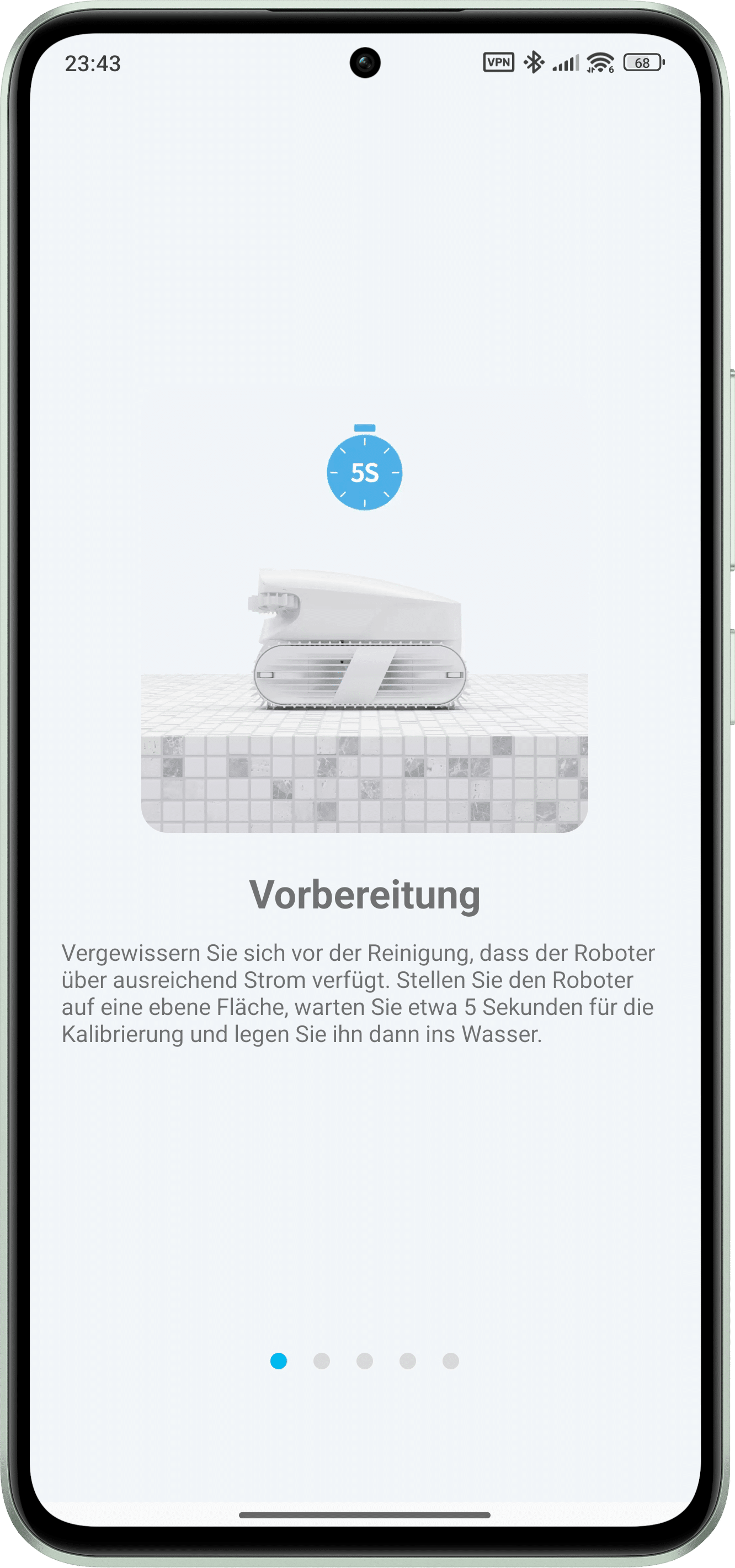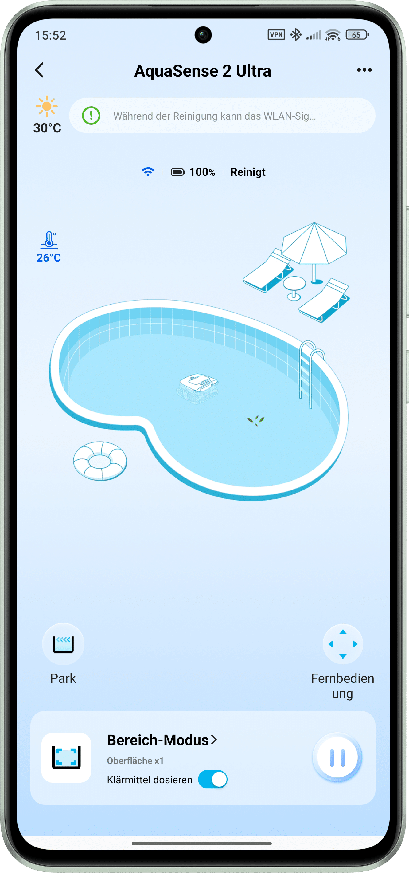 With a full battery, it’s now time to go to the pool. First select the desired control mode. Then wait about five seconds on a flat surface for calibration before starting the cleaning process. If necessary, the clarifier can also be used or dosed directly. This eliminates the need to take it in and out and the agent can be left in until it is completely used up.