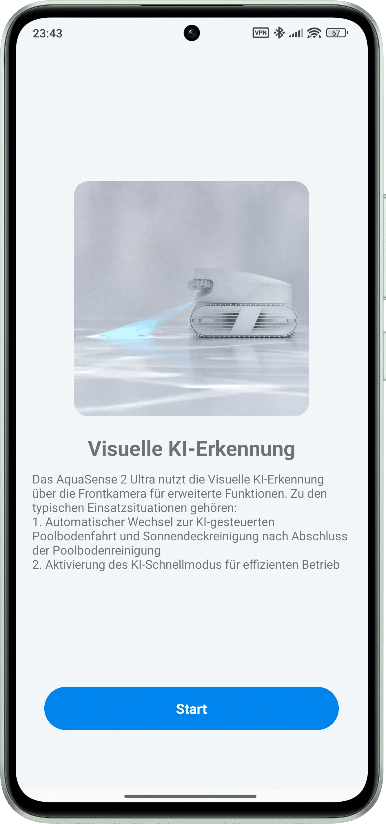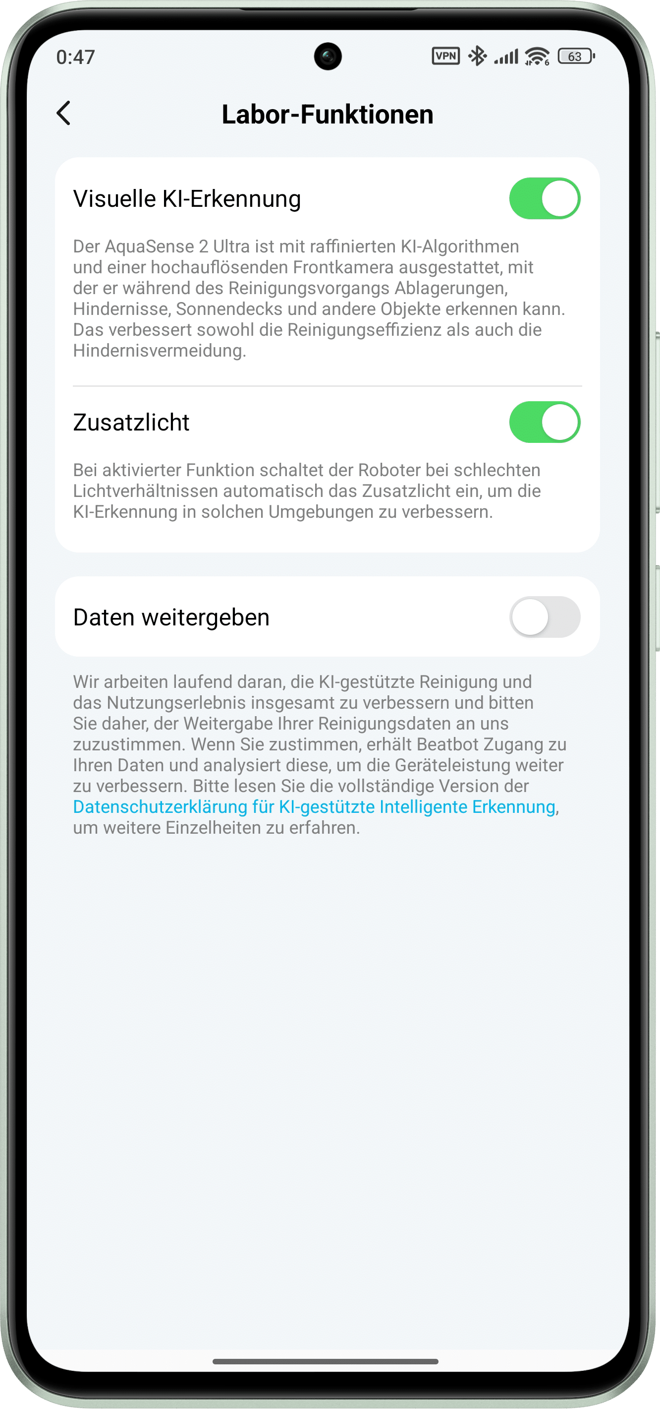Once the Beatbot AquaSense 2 Ultra has been paired, a short introduction is followed by the start dashboard. This can be used to control the various cleaning modes or to create an individual mode according to your own requirements. A detour to the laboratory functions is also recommended. Here you should check the boxes for “Additional light” and “Visual AI detection”. Despite the beta status of these functions, a so-called AI quick mode is activated. Instead of cleaning the entire pool, the pool robot will then only clean the dirty areas that have been detected and marked thanks to the camera and AI. This means the pool is ready for bathing fun more quickly. And thanks to the built-in thermostat, the Beatbot AquaSense 2 Ultra displays the current water temperature as soon as it is on the water.