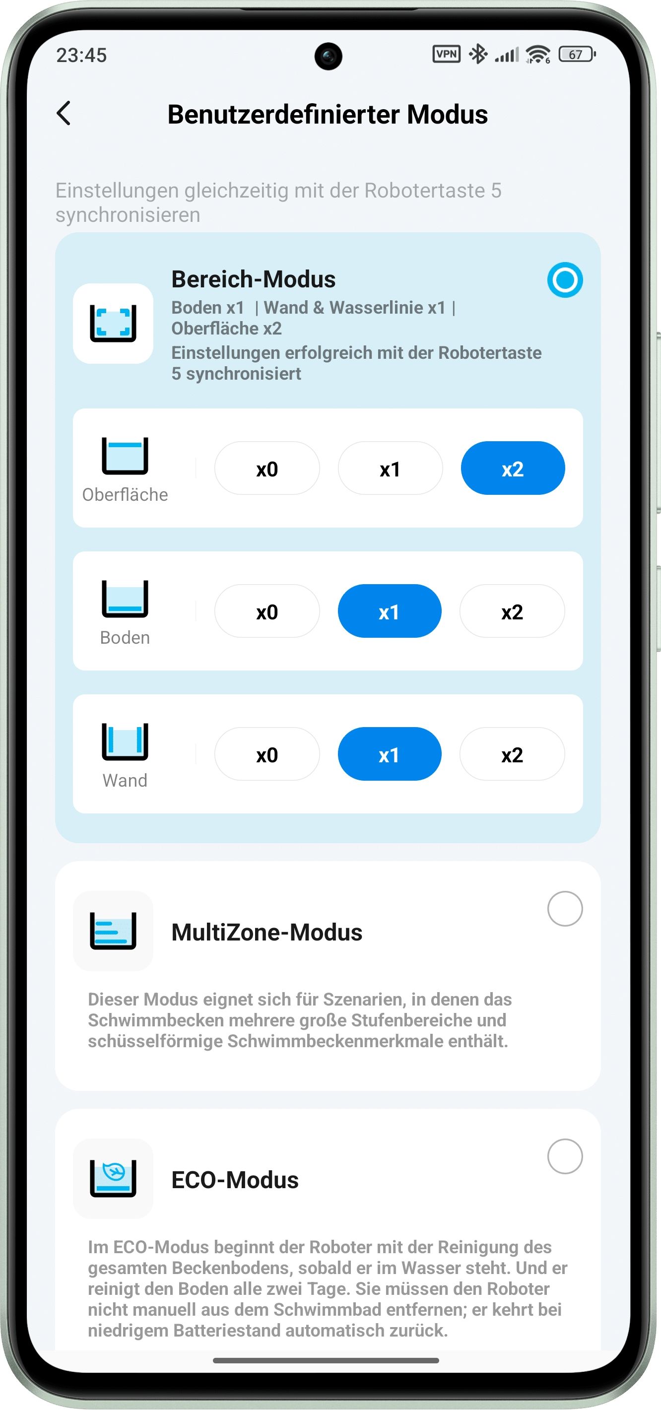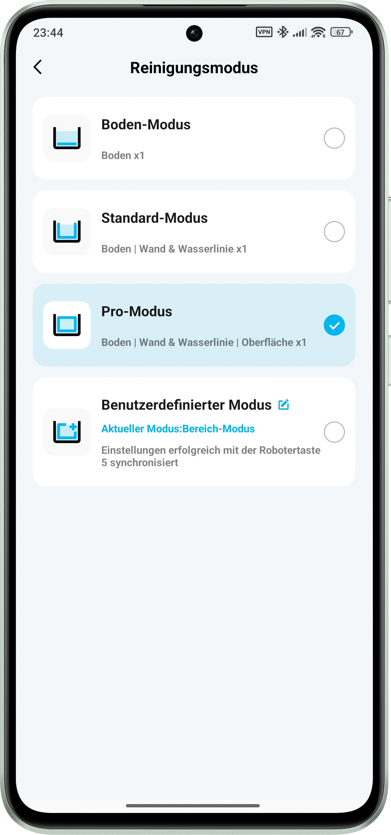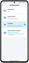 As far as the basic controls are concerned, all controls are located on the top of the pool robot. From here, the “Floor”, “Standard”, “Pro” and “Custom” modes can be selected individually. These are essentially divided into different processes, ranging from cleaning the floor, walls and waterline to the surface. Particularly practical: the user-defined mode can be specifically adapted via the app and is then synchronized via this button.