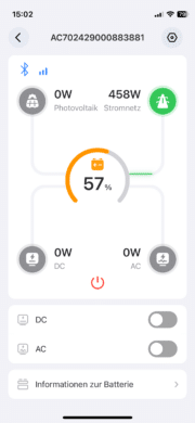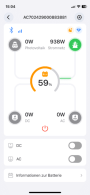 So if you’re not in too much of a hurry, you should turn the power down to the lowest of the three levels. There is a choice of three levels (290W, 450W, 850W). It’s a shame that this is not possible directly on the appliance itself. The app can also be used to increase the power of the power station. The maximum output power then rises above 1000 watts without the energy storage unit automatically switching itself off for self-protection.