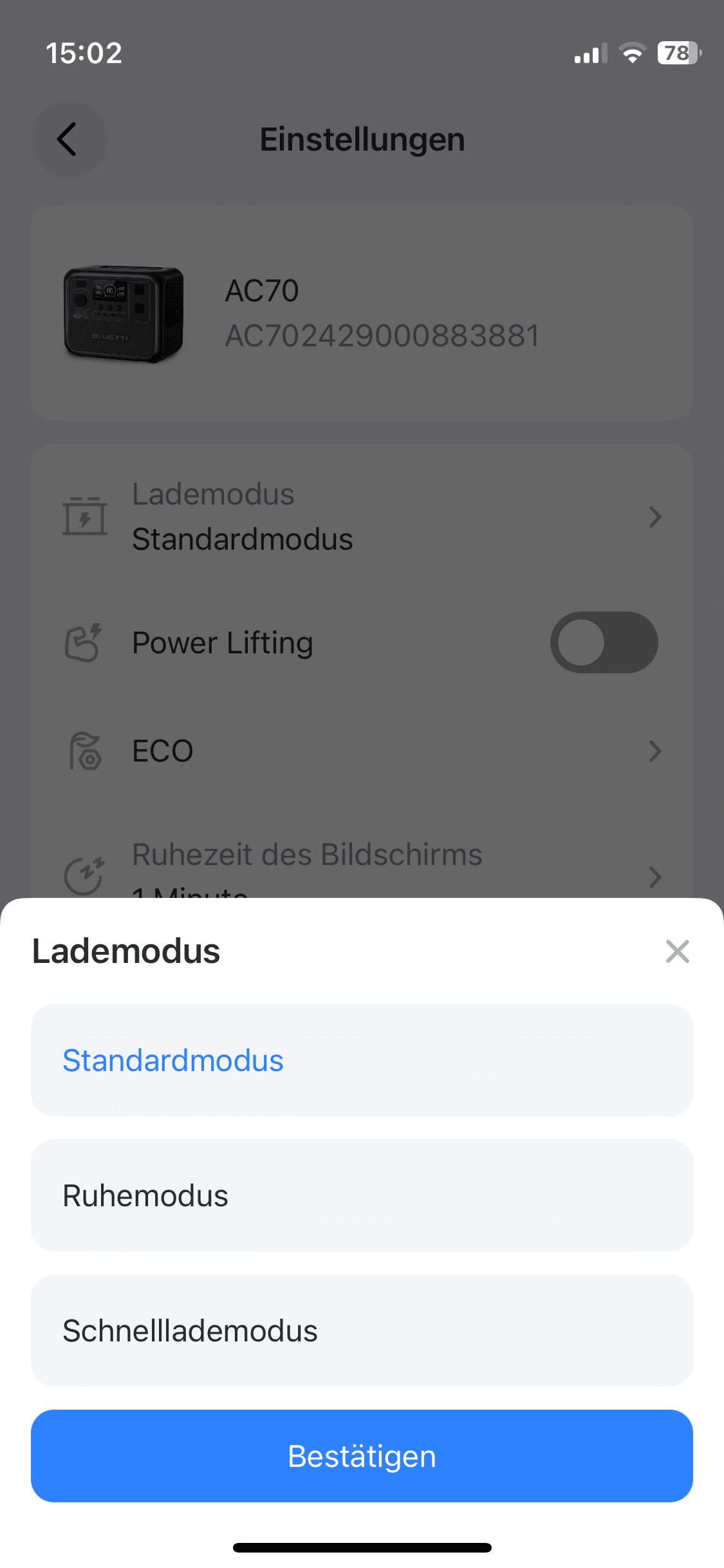 BLUETTI’s own app is available for fine-tuning, remote control and monitoring. This connects to the power station via Bluetooth. The software then offers some important customization options that you should keep in mind. For example, the charging power can be regulated. The lower the charging power, the more gentle the charging process is on the battery cells.