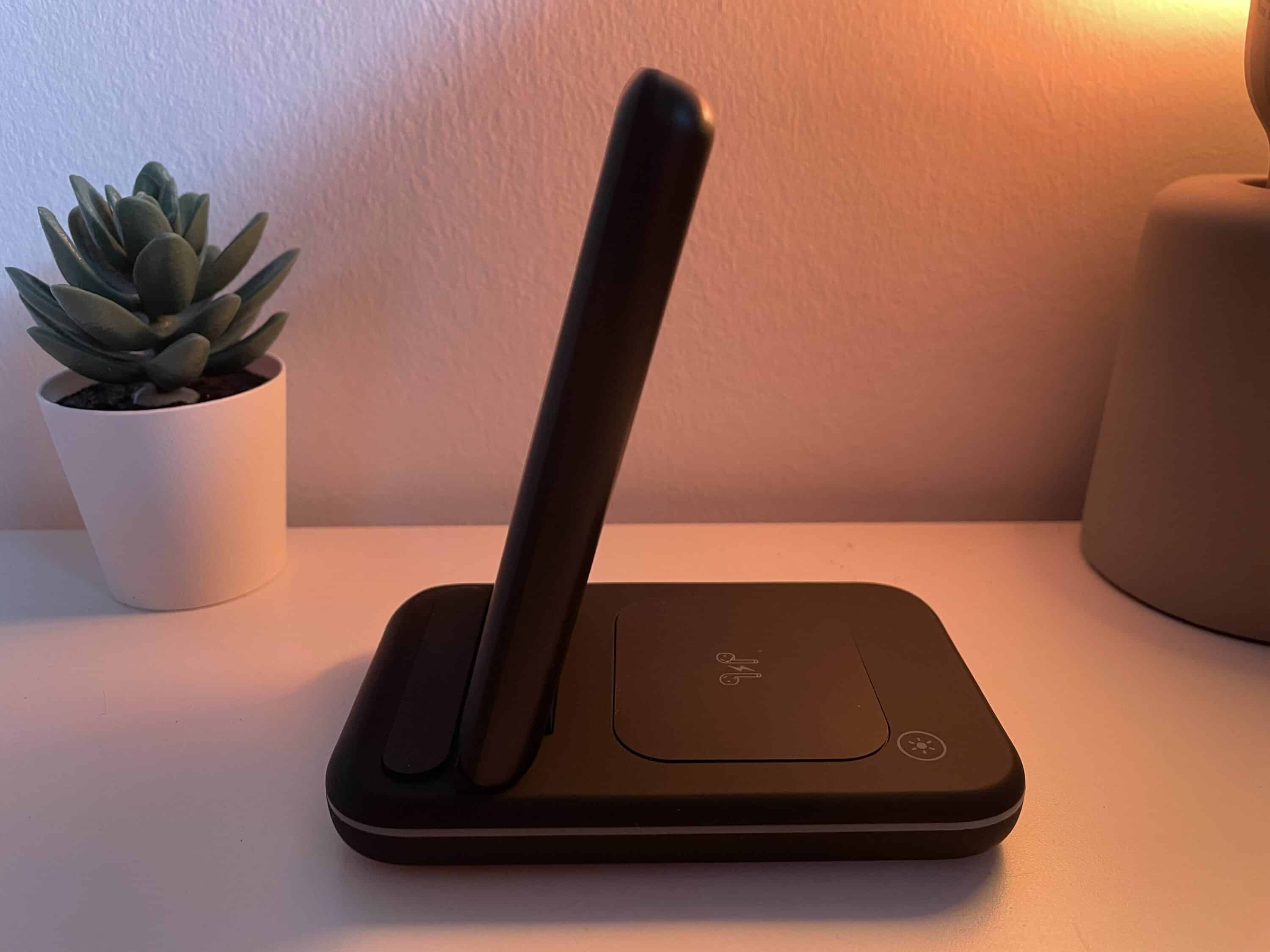 The LED bar shows the user the status of the station. If it lights up green, it signals to the user that the station is supplied with power. If it lights up blue, on the other hand, it indicates that at least one device is currently charging. There is also a touch button on the base that can be used to switch off the LED lighting if required.