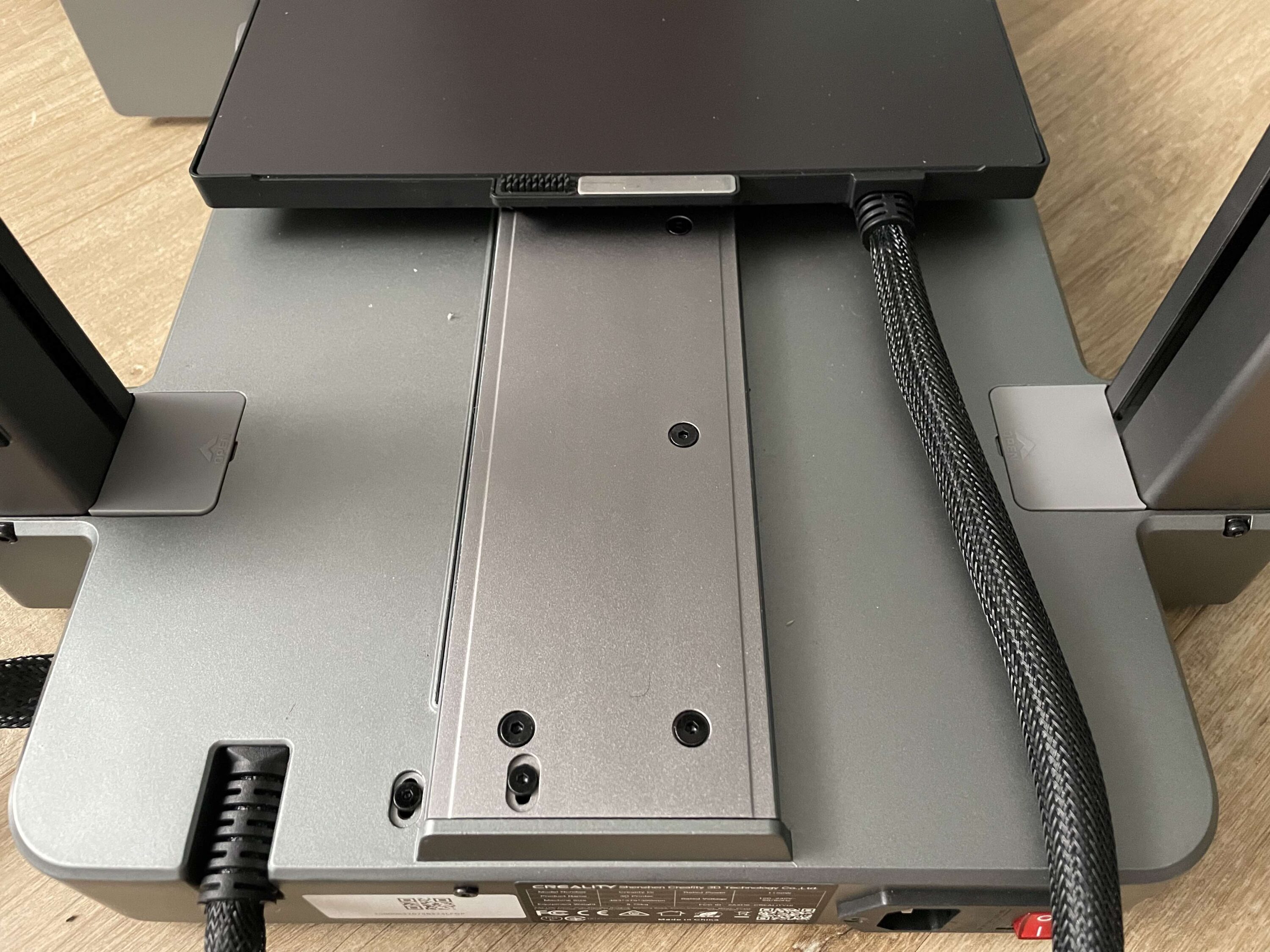 The installation of the Creality Hi is pleasingly quick. You can install the frame and print head on the sturdy base in just a few simple steps. The simple slot construction is particularly helpful here. This means that the frame is held in place even before you have tightened the screws. Once the frame has been positioned correctly, all you have to do is secure it with the enclosed screws. Continue on the back of the printer.