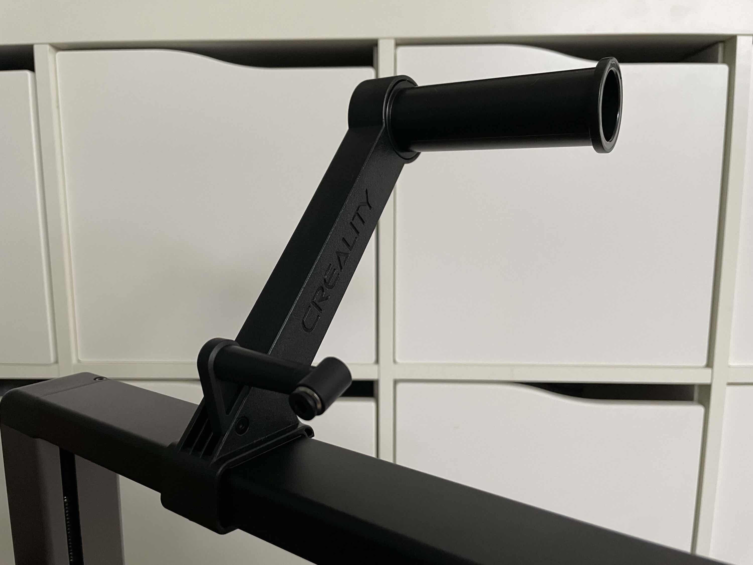 After a few more small steps, you can assemble the coil holder and connect it to the upper crossbar of the printer. However, this is optional in the “combo version”. Finally, the 3D printer draws its filament from the Creality CFS. You connect this to the printer using one of the two enclosed cables. Now you need to connect the two elements with the white tube so that the filament arrives where it belongs.