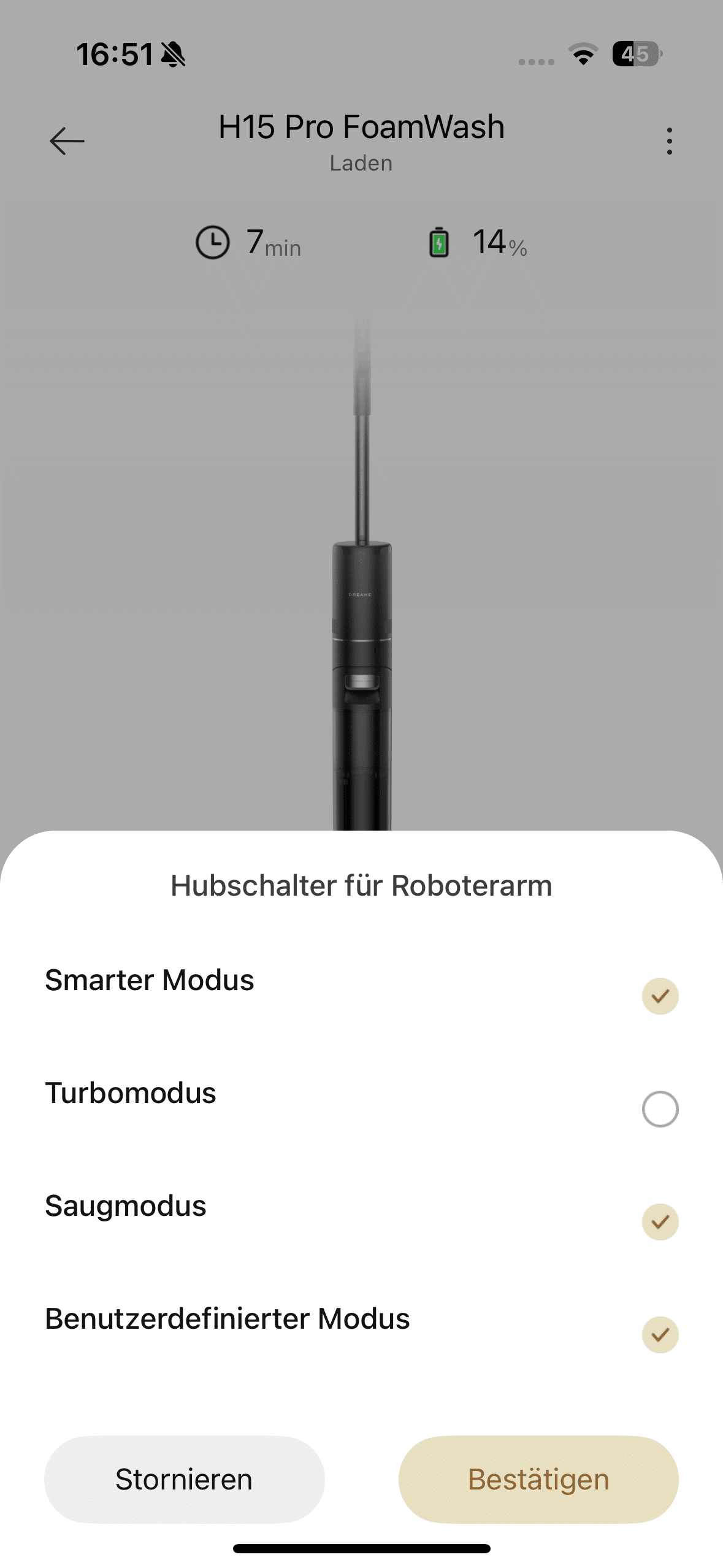 The H15 Pro FoamWash even showed no mercy with animal hair. These cannot even get tangled up in the roller, as Dreame has installed a special metal comb that quickly combs hair residues and similar out of the roller. I worked almost exclusively in Smart mode. Here, the appliance adjusts the power to the results of the built-in dirt sensor.