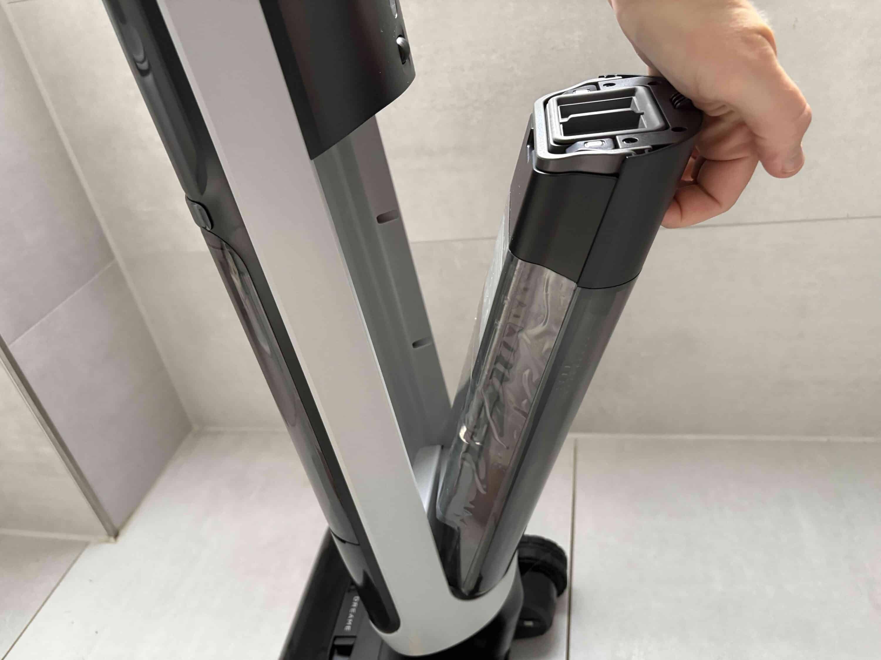When the vacuum cleaner is lying down, the maximum filling volume is reduced to 400 ml to prevent spillage. The fresh water tank, which holds 800 ml, is also located in the main section. This is rather atypical for vacuum cleaners with a flat design. After all, many now rely on water tanks in the cleaning unit.