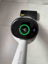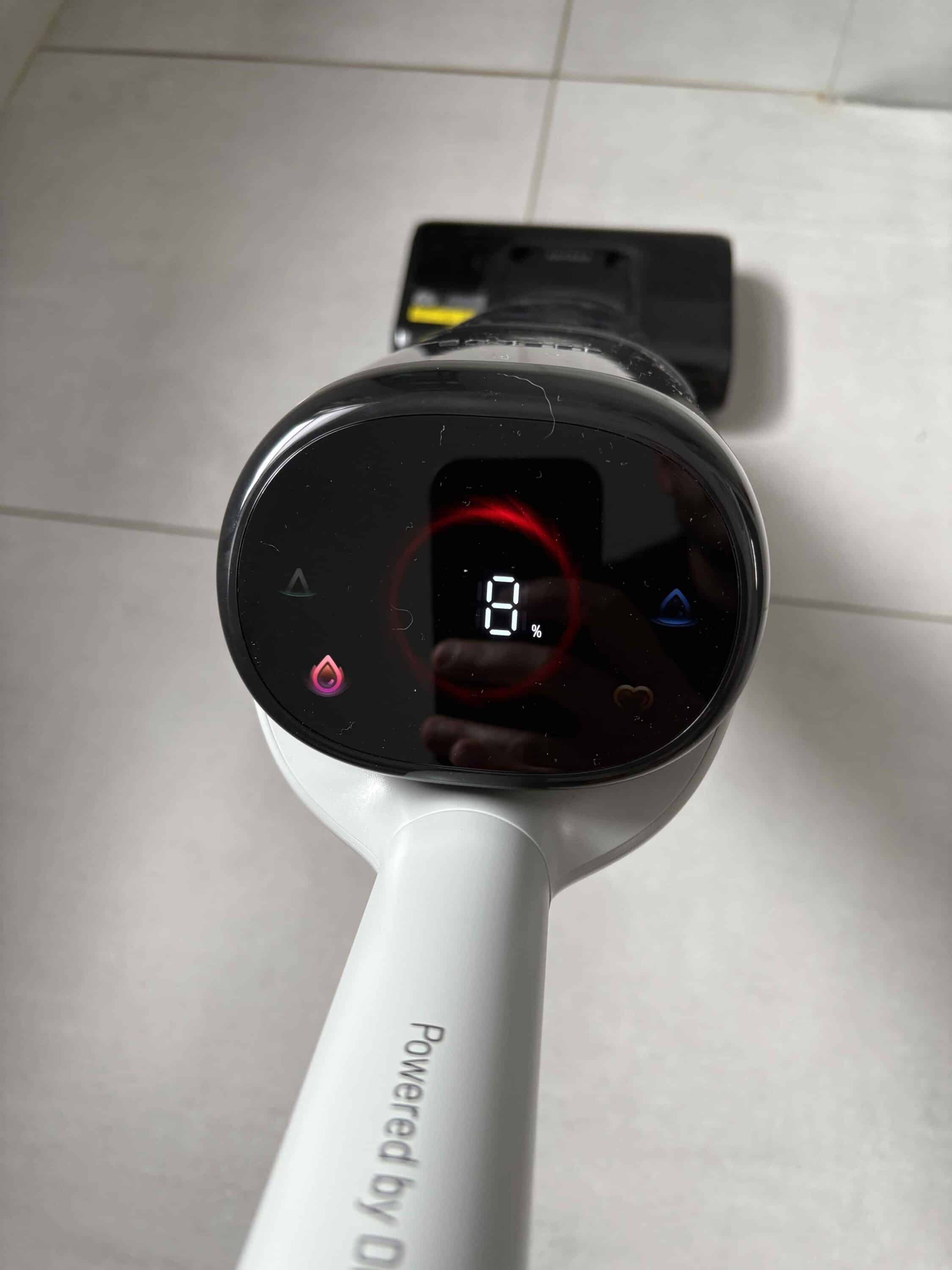 The handle ends in the main unit. Here we first see a smart display that shows the remaining battery capacity, the current degree of dirt on the floor and the current cleaning mode. The two water tanks are also located in the main section. The dirty water tank holds 650 ml.