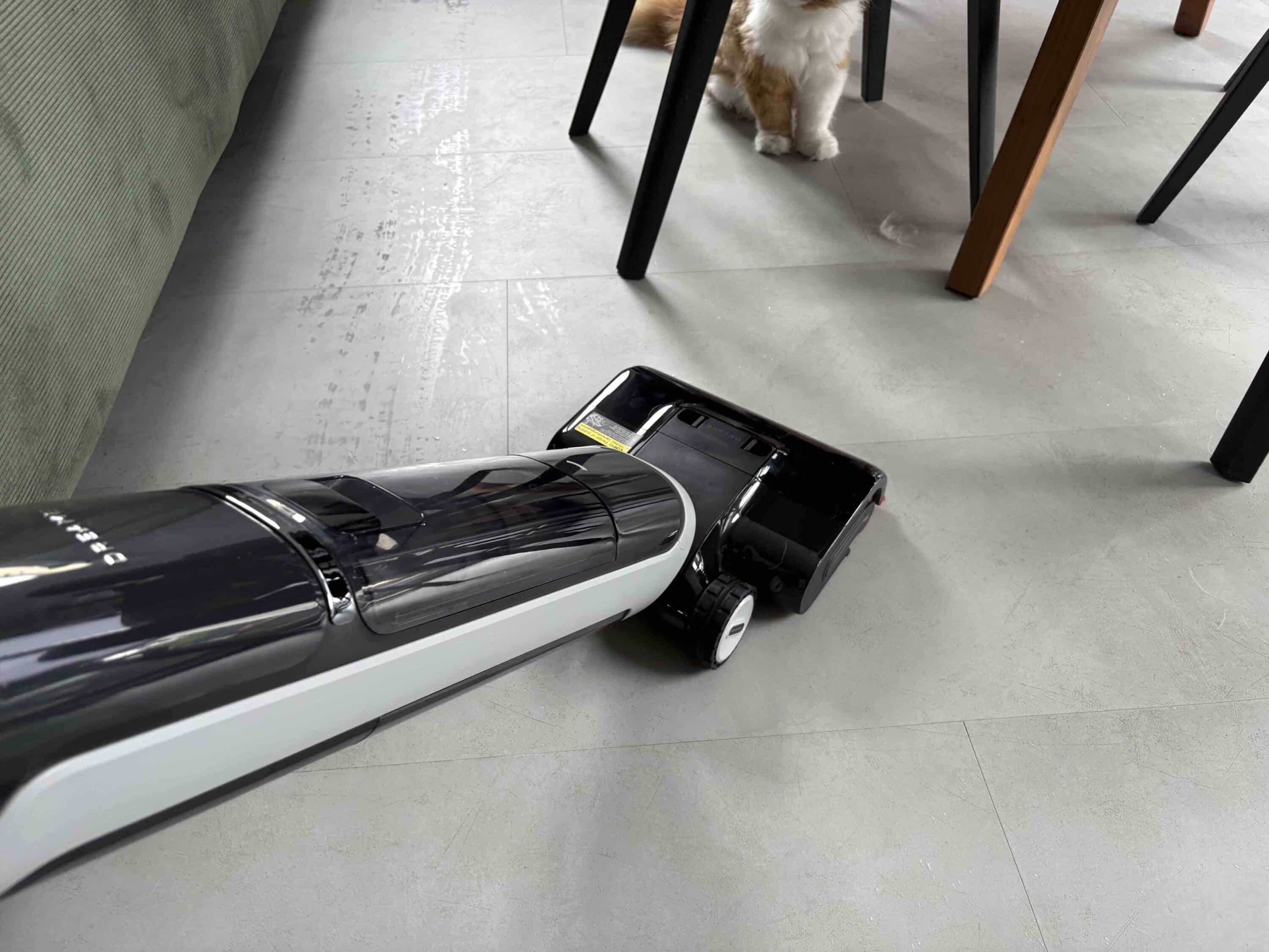 Grease stains that have already set are also a piece of cake in hot water mode. Cleaning along furniture edges or skirting boards is also outstanding. This is where the GapFree robot arm really pays off. It always performed reliably in the test and automatically shut down when I pulled the vacuum cleaner backwards.