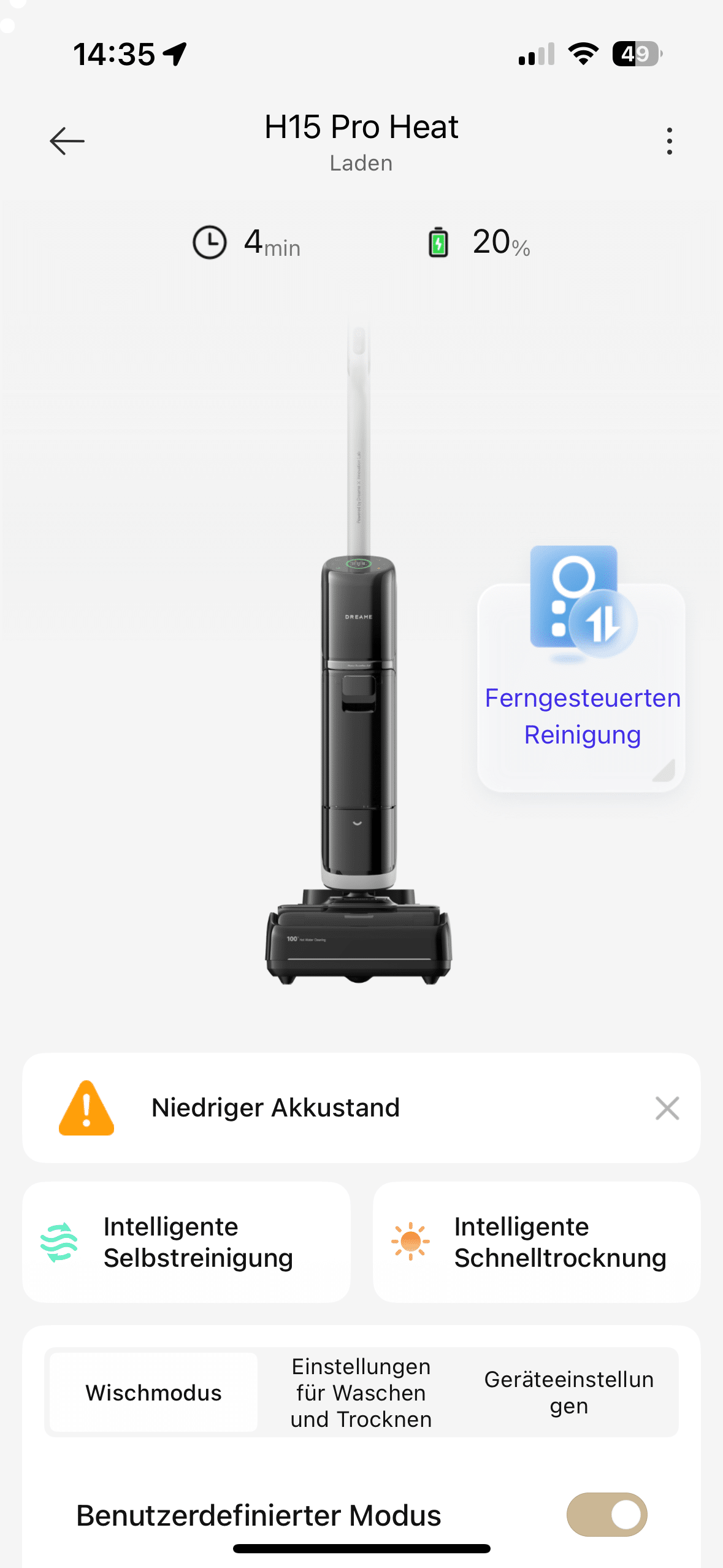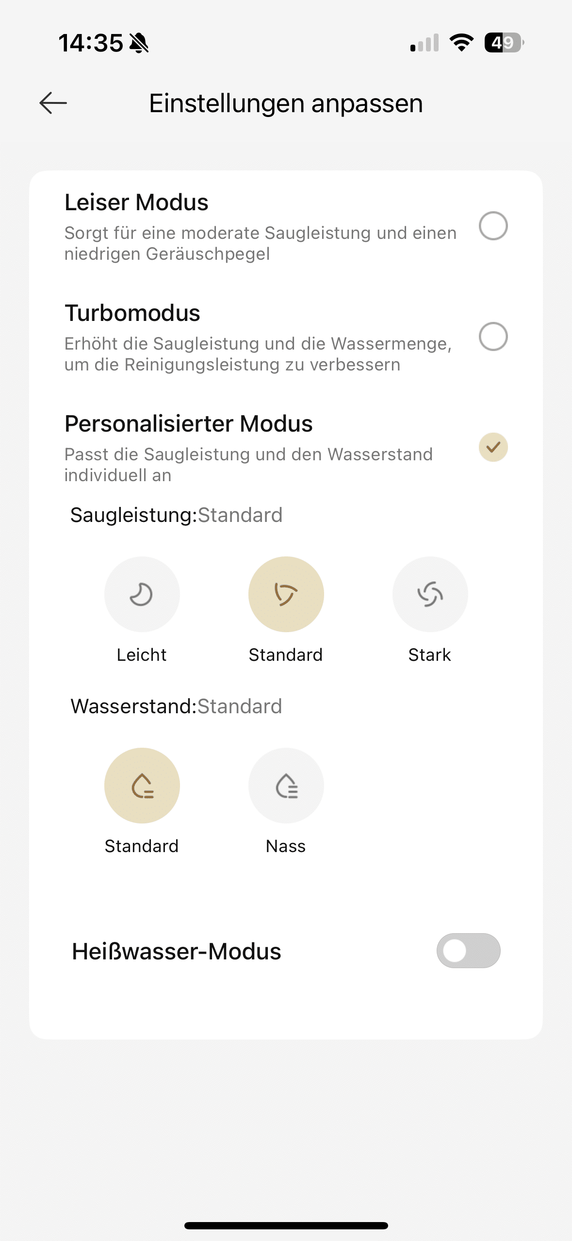 You can then use the Dreame app to set your own personal preferences and use them in individual mode on the vacuum cleaner. But the most exciting feature is certainly the hot water mode. Here you can clean your floors with water heated up to 85°C, leaving greasy or dried-on stains and bacteria no chance. The temperature can be adjusted to three different levels.