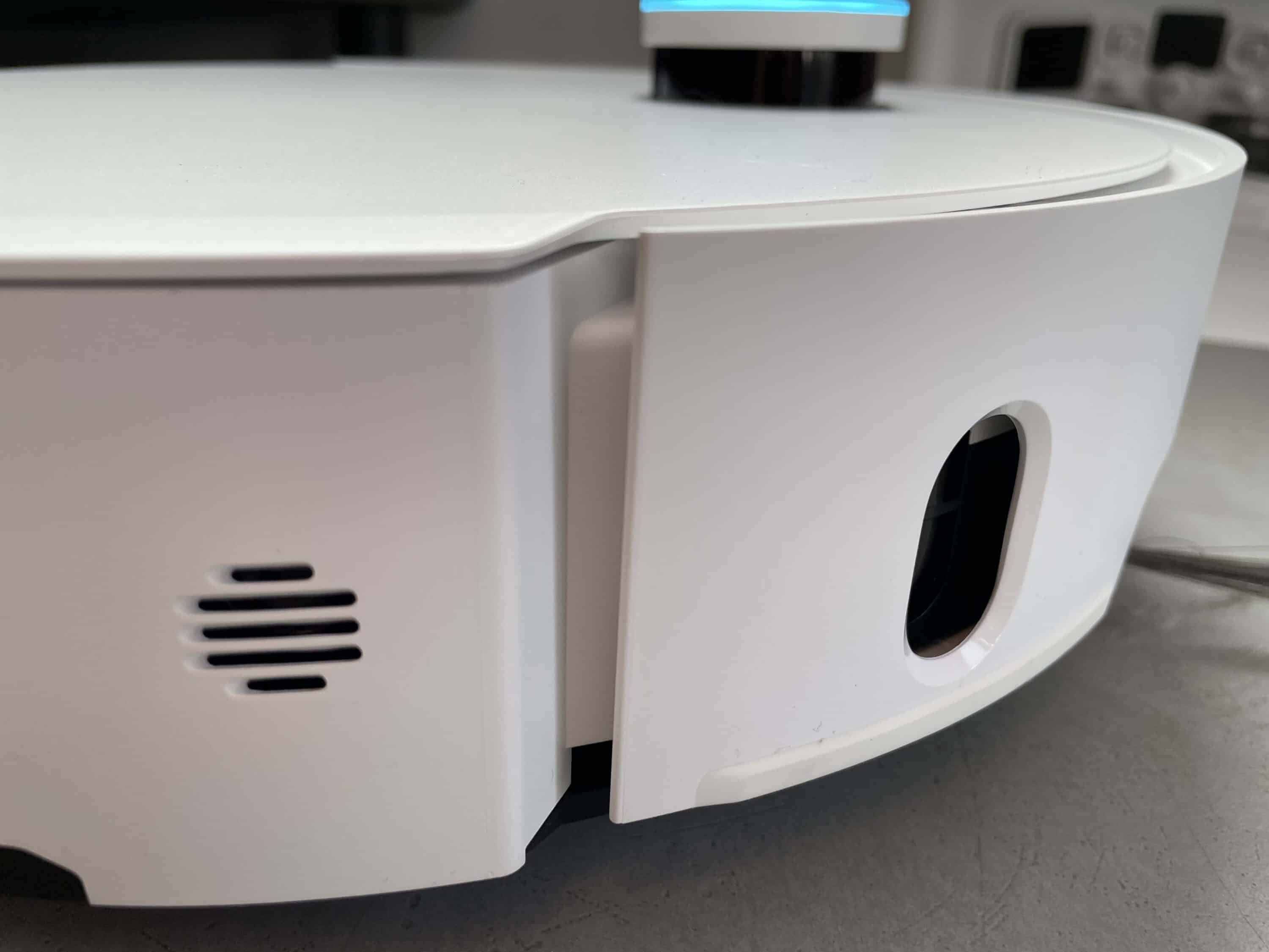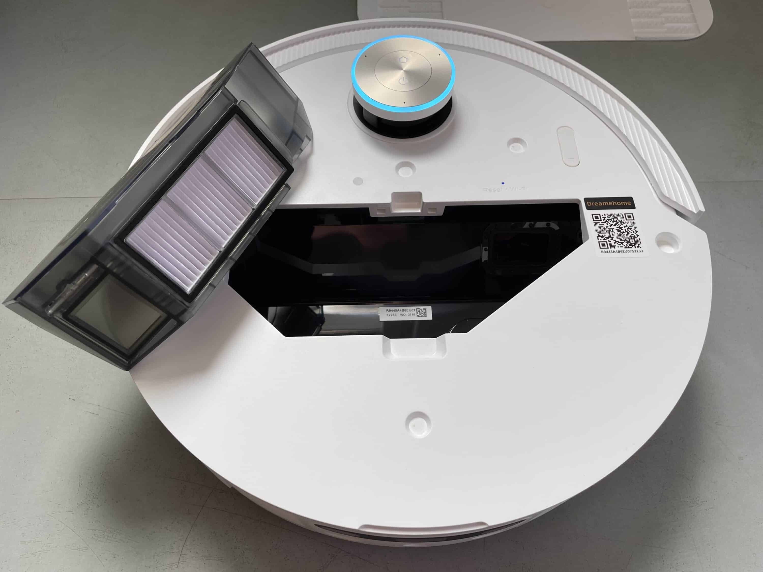 The magnetically attached lid houses the 395 ml dust container. This corresponds to the dust container of the Dreame X50. It also houses the WiFi LED, which is also used as a reset button. There is also a printed QR code here, which you can use to conveniently add the smart household helper as a new device in the Dreame app. The obstacle detection technology is located on the front.