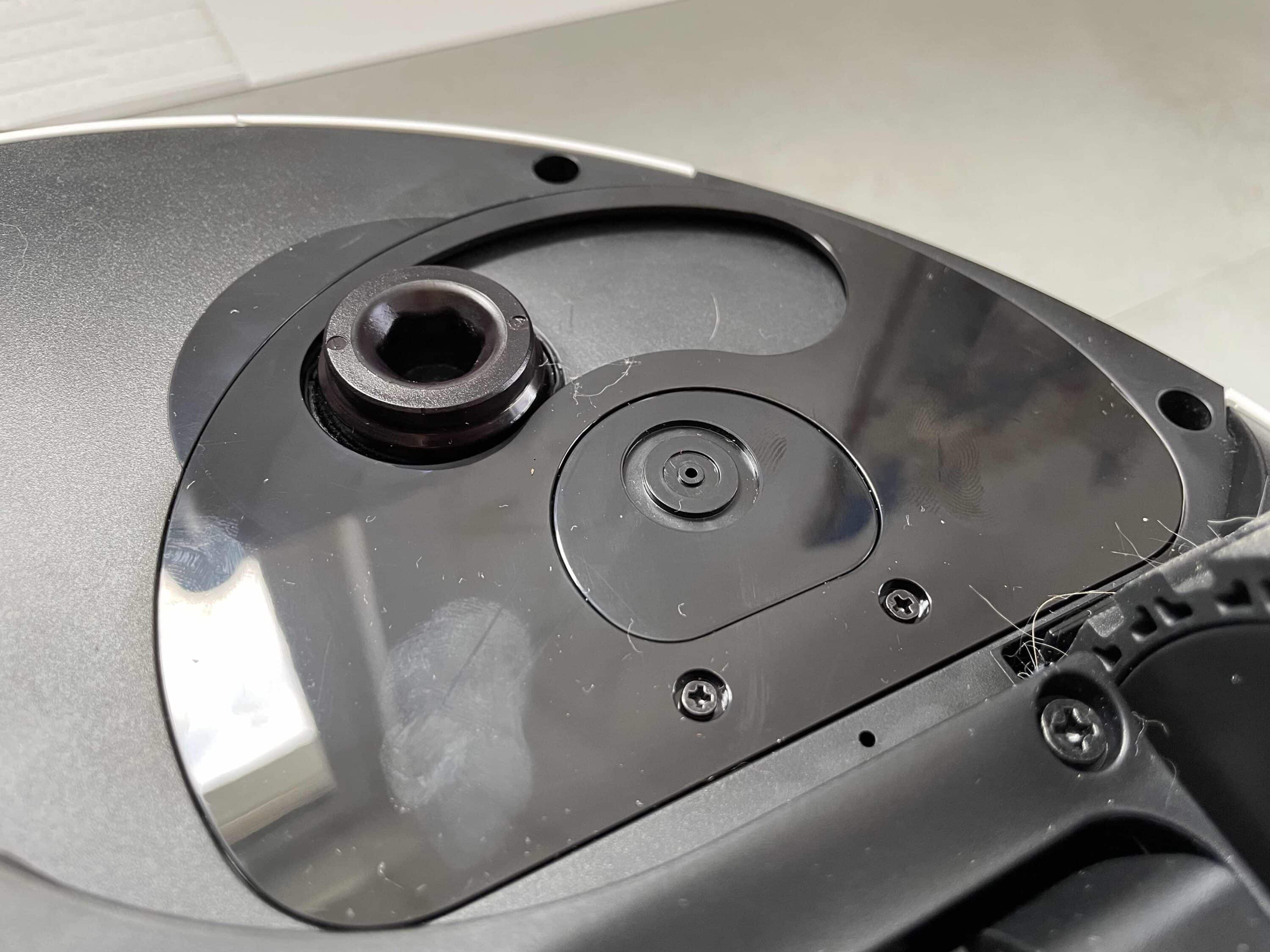 This section, highlighted in black, is made up of RGB cameras, two cross lasers and an LED light. At the back we find the charging contacts, which are used to charge the battery in the cleaning station. The suction opening, through which the robot’s dust container is extracted, is also located here. There is also a distance sensor on the side of the household helper, which enables precise movements along skirting boards and furniture.