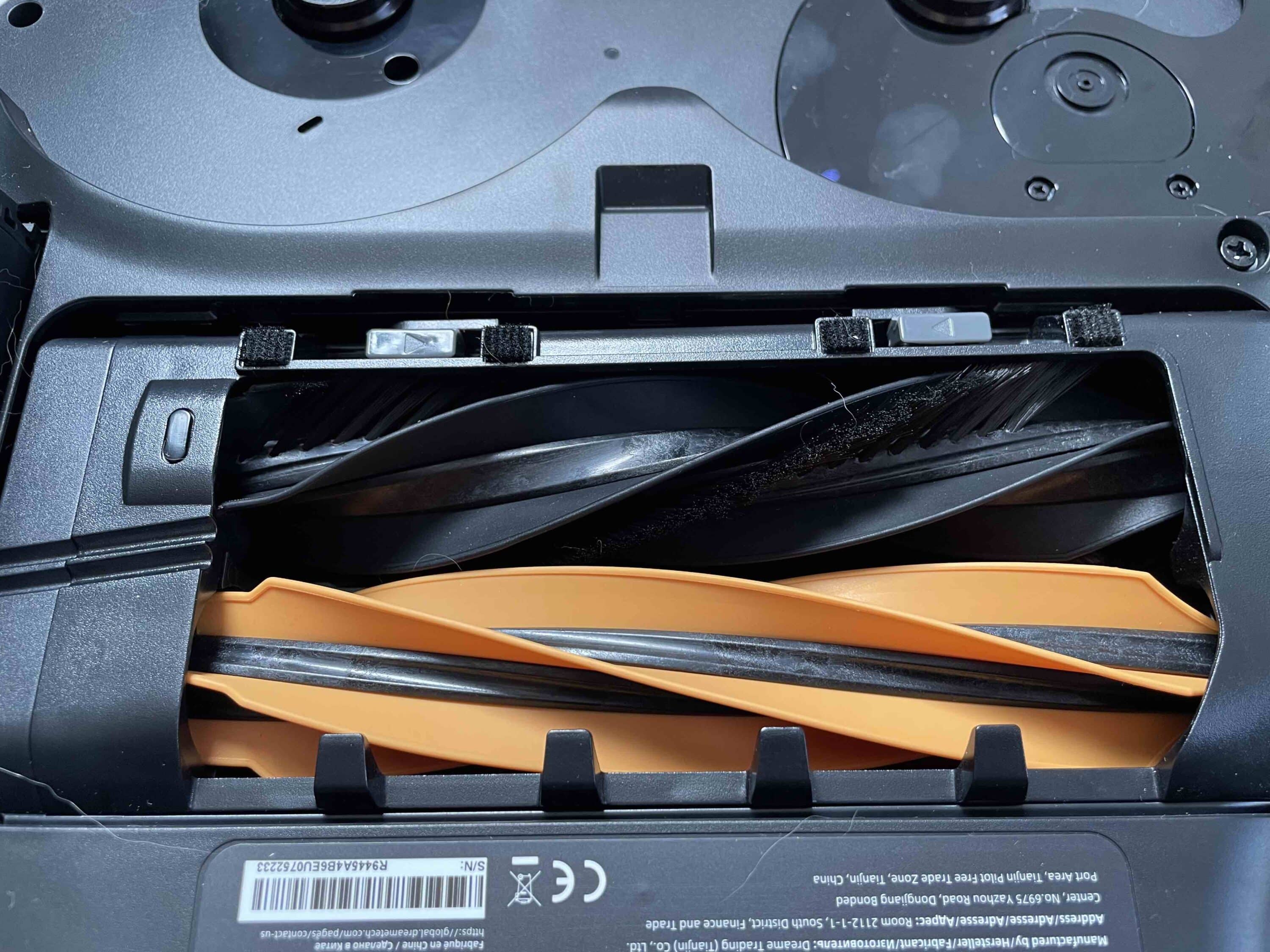 This is supposed to pull the Robo over obstacles without further ado. The rest looks familiar again. There are two liftable mops, one of which can be extended to clean along skirting boards and furniture. The side brush can also be extended and raised. The equipment is rounded off by the main brush, which consists of a fully rubberized brush and a brush with a combination of rubber and bristles.
