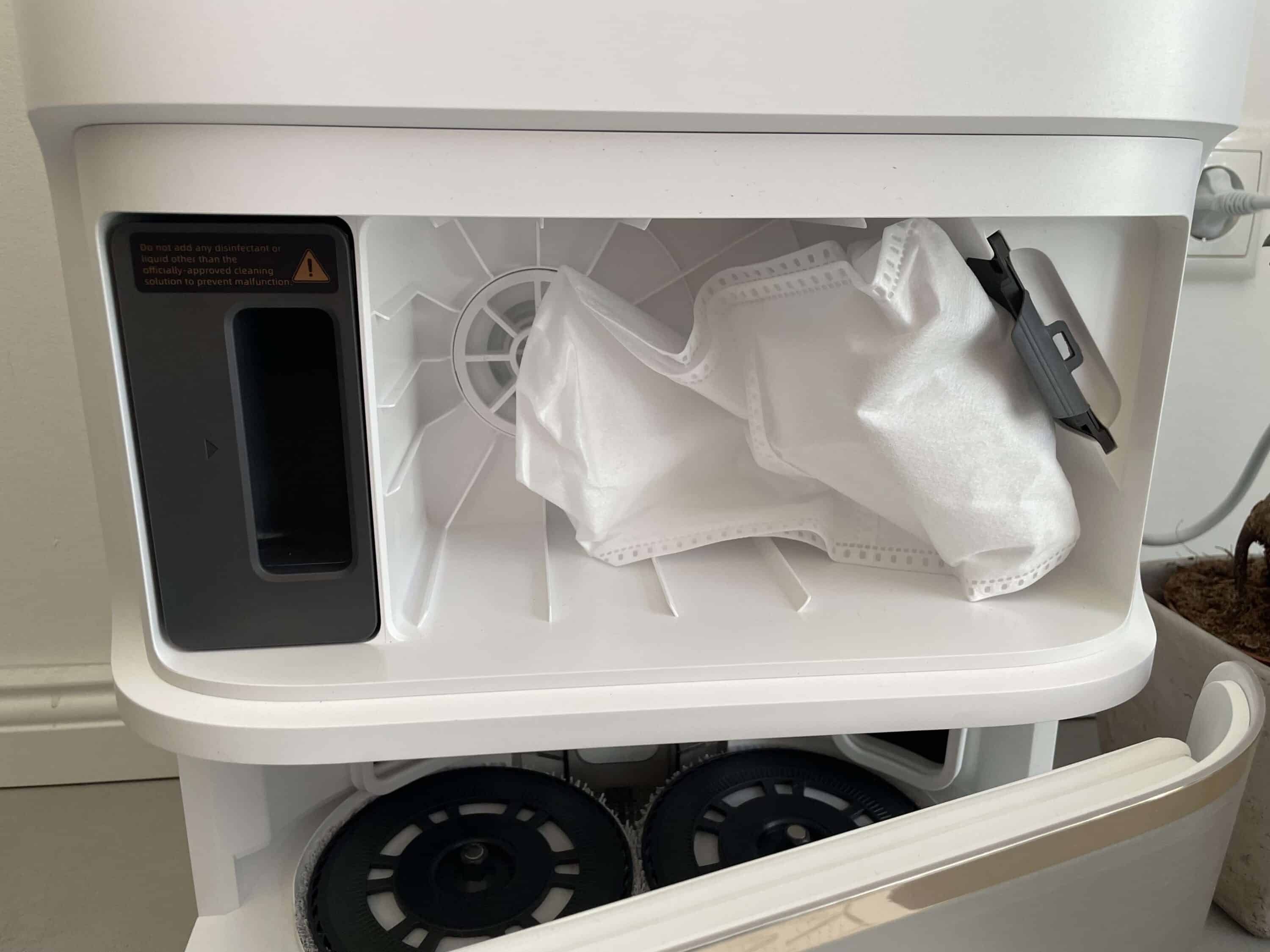 There is also a refillable cassette here, which you use to add the cleaning agent that the station automatically adds to the fresh water. In the lower area is the parking lot for the Robo, where it is not only charged. This is also where the Robo’s internal water tank is filled with fresh water and some cleaning solution.