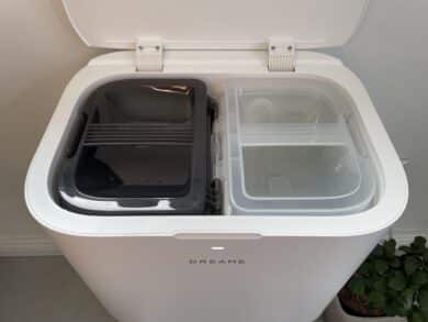 If you don’t feel like refilling manually, you can also buy and retrofit the Dreame water connection kit (€ 199.00 *). After each cleaning cycle, the robot’s dust container is vacuumed and the dirt is transferred to the dust bag via a chute. The gold-colored cover on the front gives you access to the 3,200 ml dust bag, which should last around 100 days with average use.