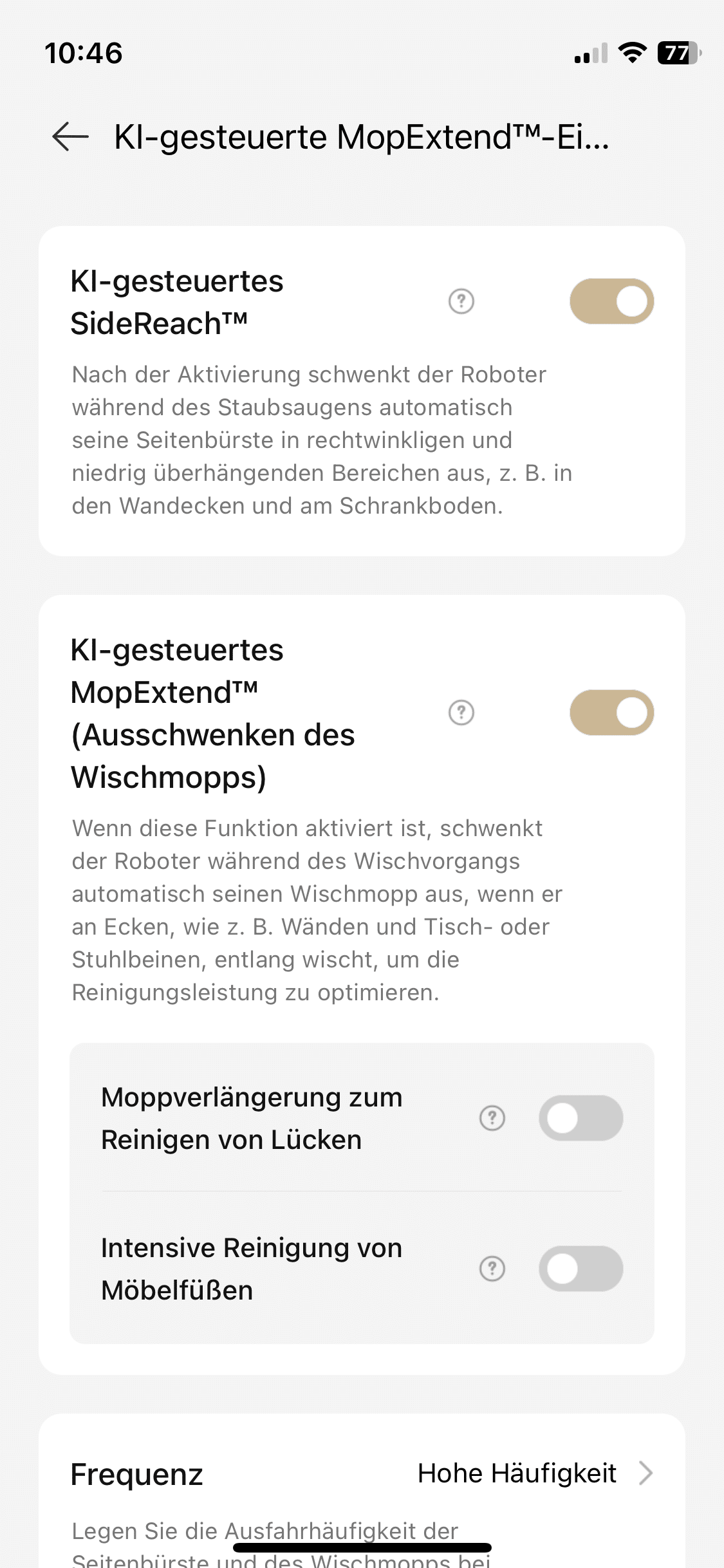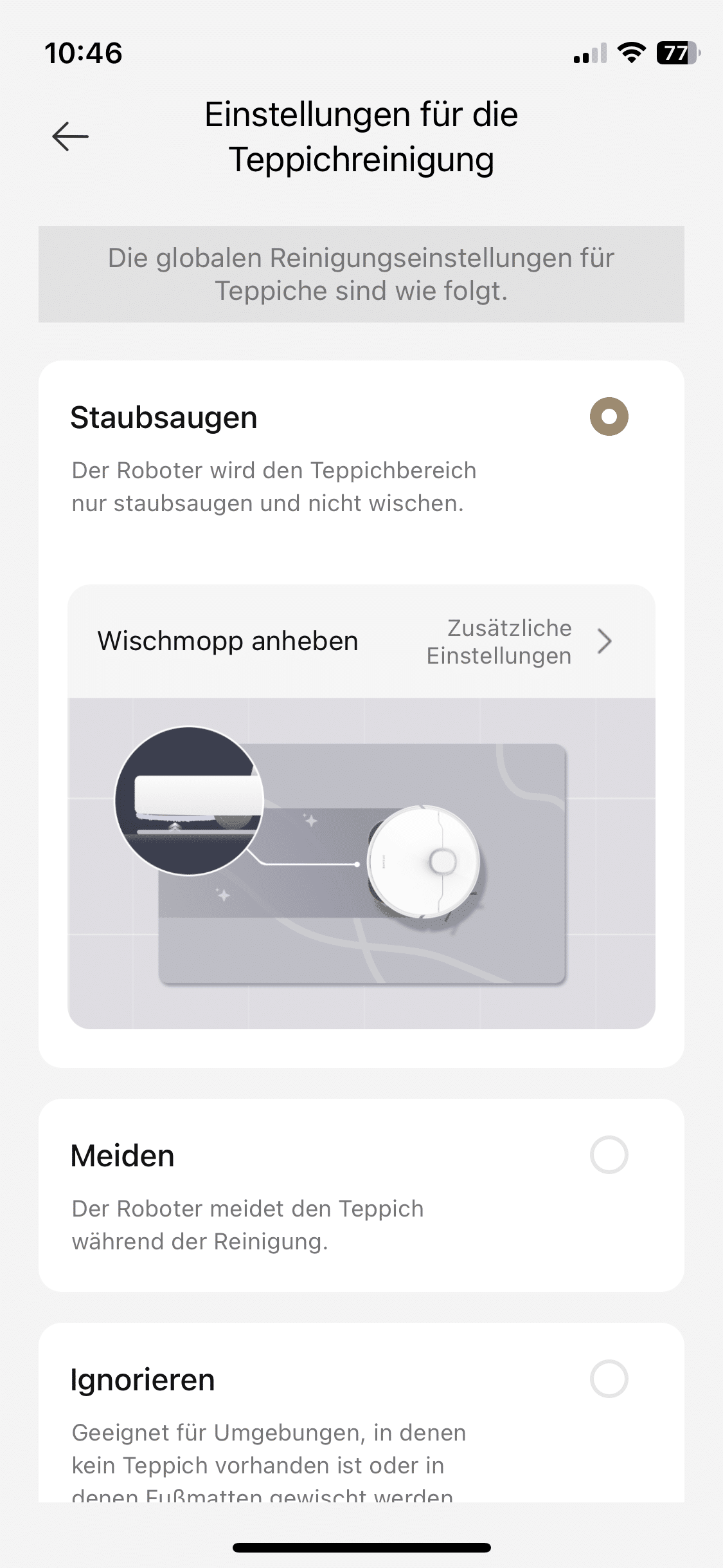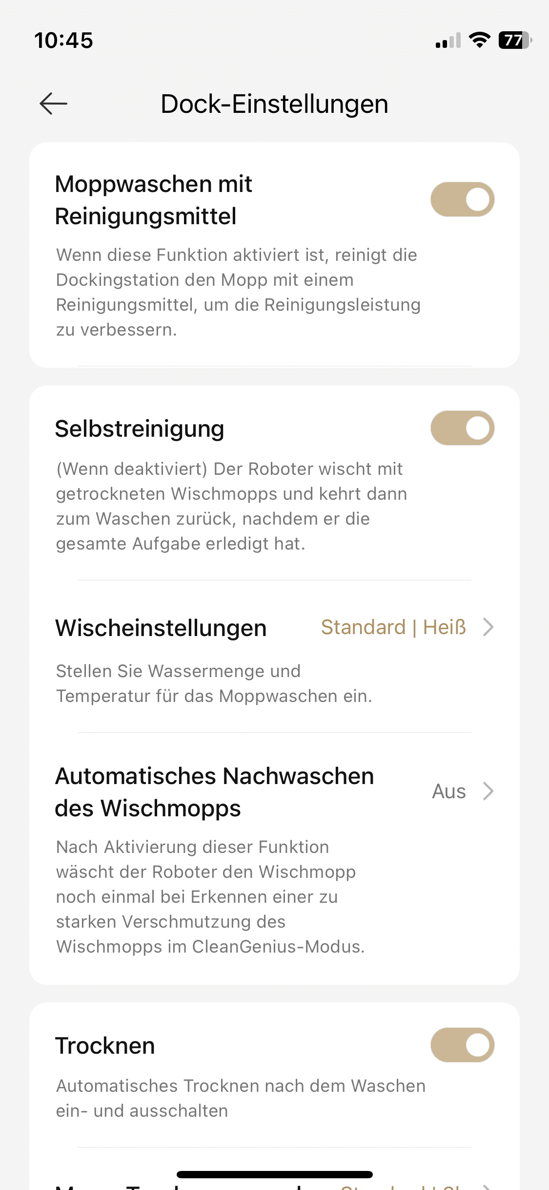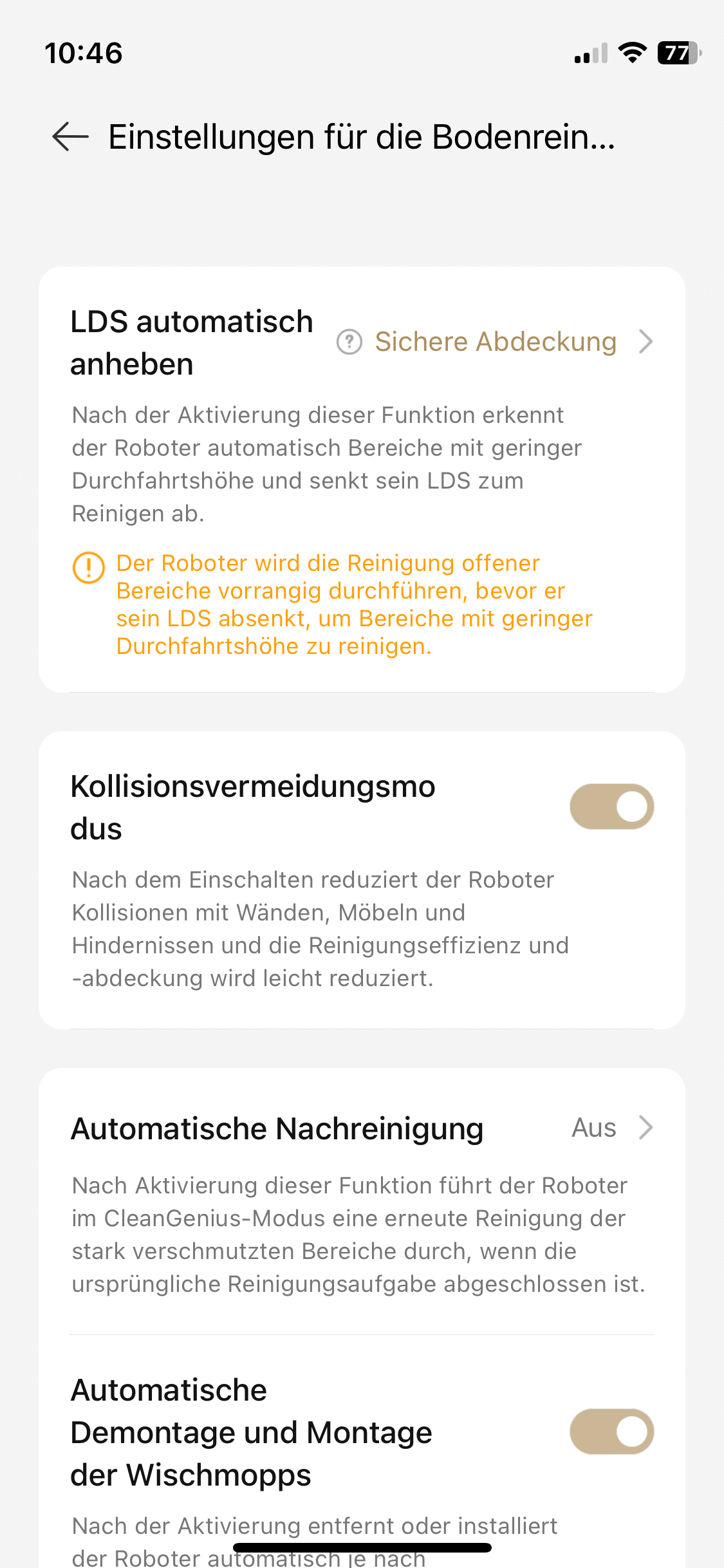 And that’s not all. You can also define no-go zones or invisible walls in the map. The setting options are varied, but thanks to the deliberate design of the software, they won’t overwhelm even newcomers. For example, you can adjust the cleaning parameters such as suction power and mopping performance. You can also specify how the smart household helper should behave in certain situations. The best example is the behavior when driving over carpets. You can also set some parameters for the all-in-one station.