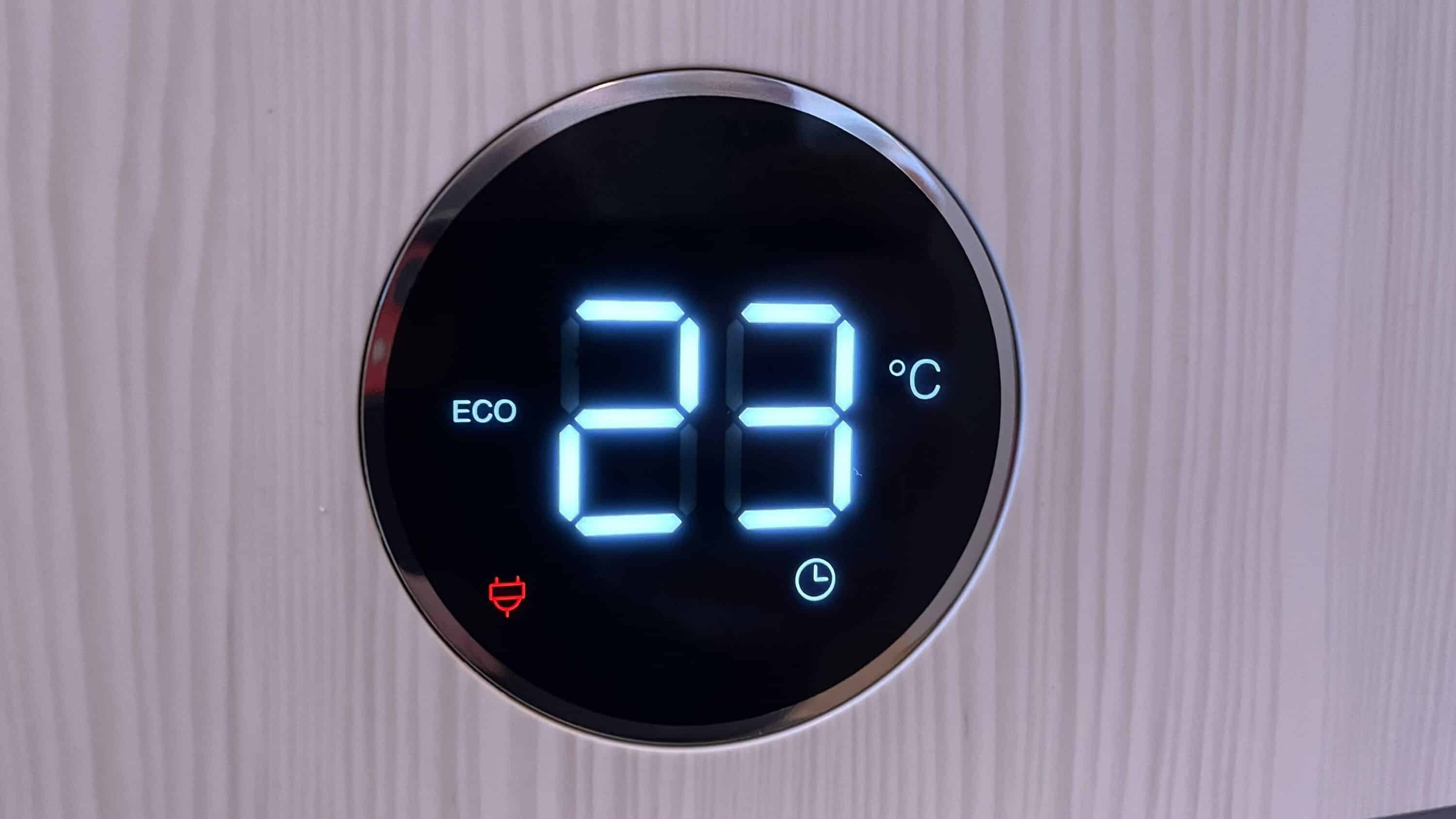 But it’s not just the look that’s right here. The build quality is also at a really high level. It doesn’t crack or creak at any point, which is anything but a matter of course in this price range. The control and operating unit on the electric wall heater is a 2.4-inch circular display. Here you can read important parameters such as the current room temperature. Thanks to the large white digits, this is easy even from a distance.