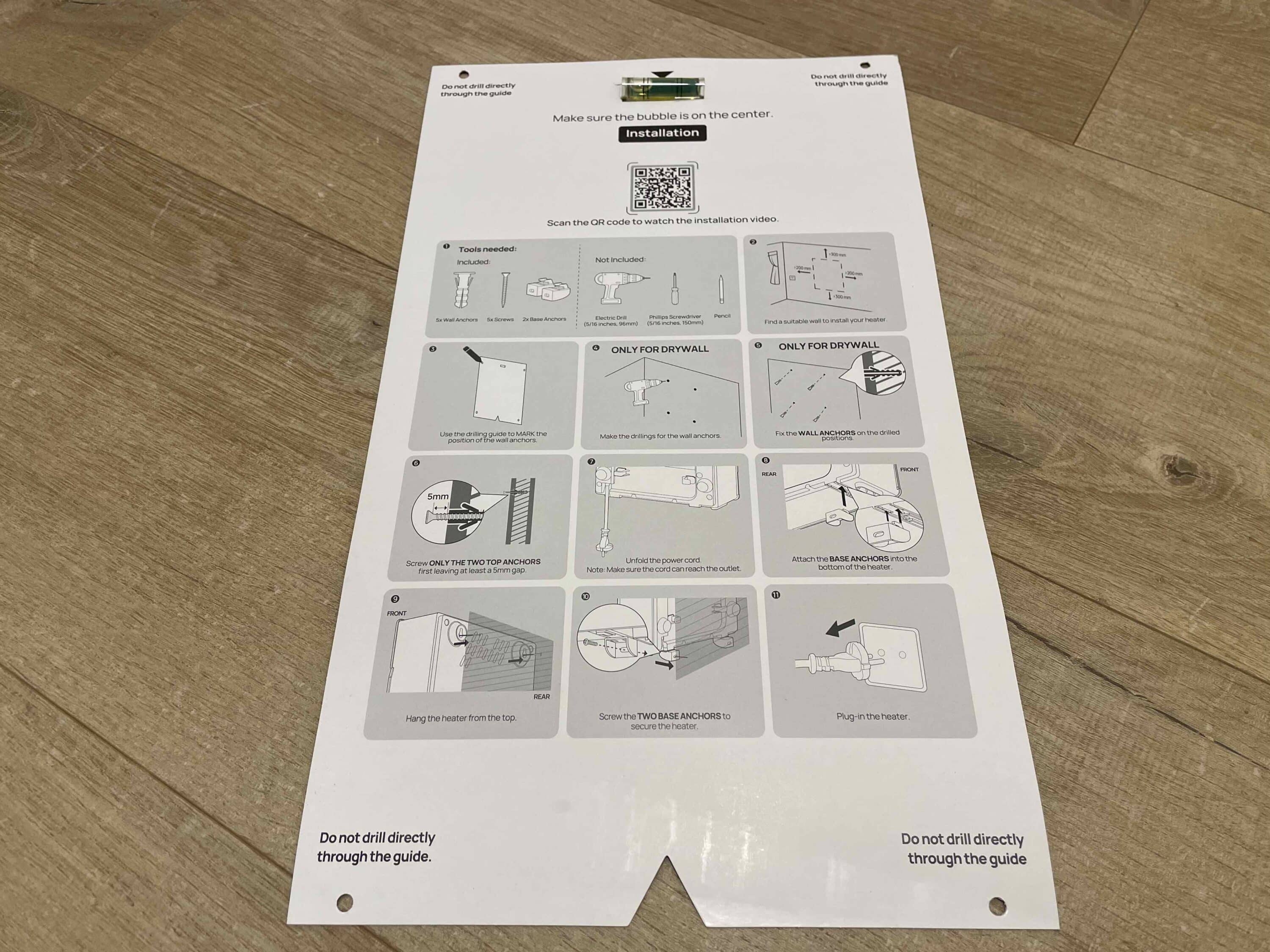 Especially as DREO provides assistance during installation. Not only is there a practical drilling template included, which not only specifies the drilling positions. It also has an integrated spirit level. Very practical! Once a total of four screws have been fitted into the wall, the appliance can be hung up and the power cable plugged into the socket. The heater can now be operated. The enclosed remote control is also used for this.