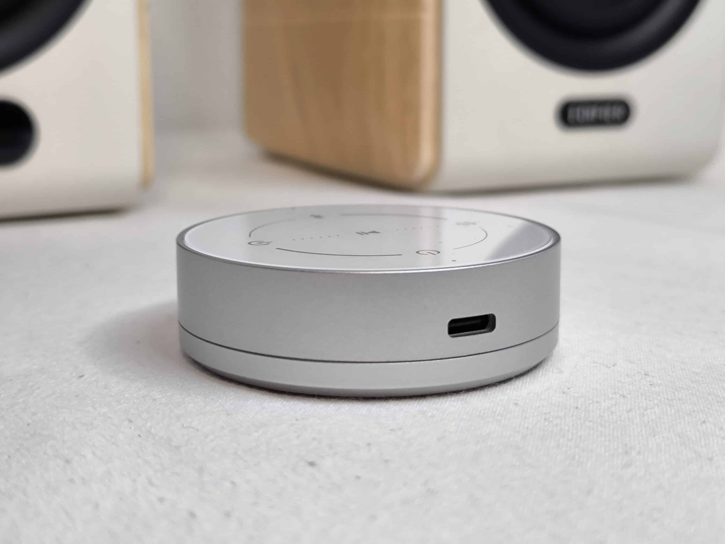 As all the controls are located on the back of the speaker and are difficult to reach depending on the positioning, operation via a remote control is more convenient. Unlike conventional remote controls, this one does not rely on batteries or a CR2032 cell, but can be recharged via USB-C. When not in use, it goes into an energy-saving mode and switches back on automatically when it is entered or lifted. In principle, this makes sense, but it should be noted that there is a delay before inputs are made from energy-saving mode. It may well take three seconds for the signal to be transmitted. However, there is no delay when the remote control is active.