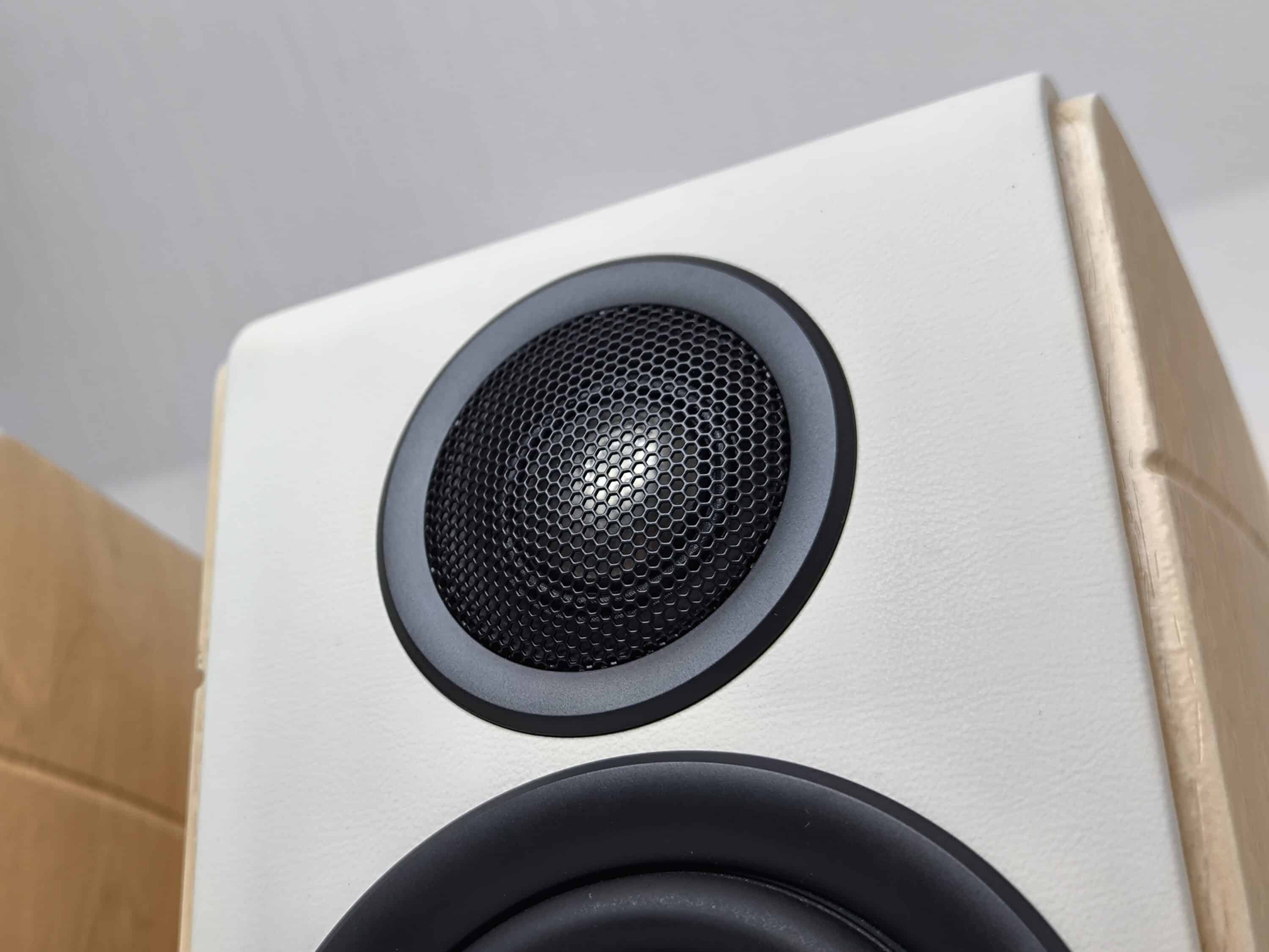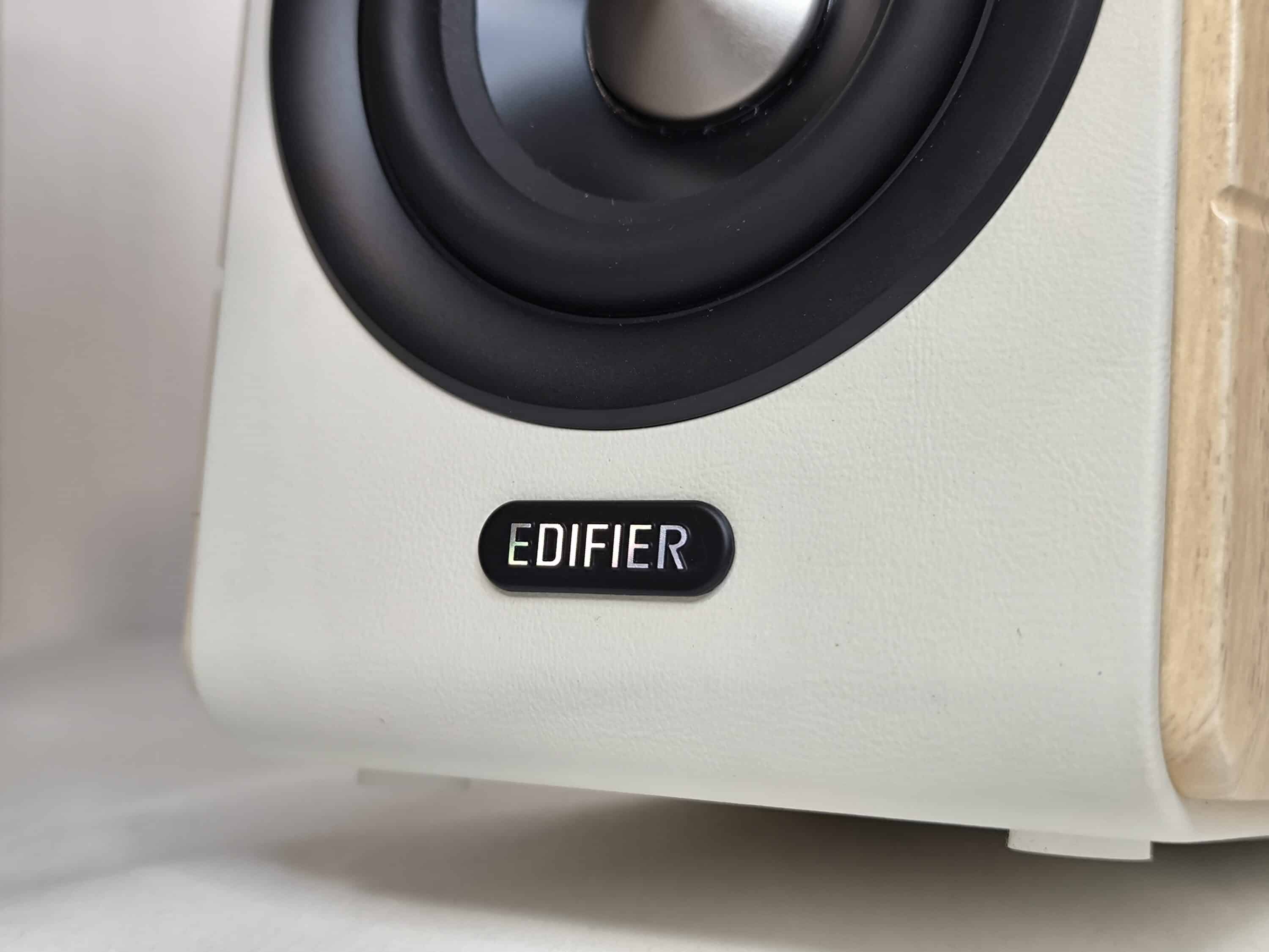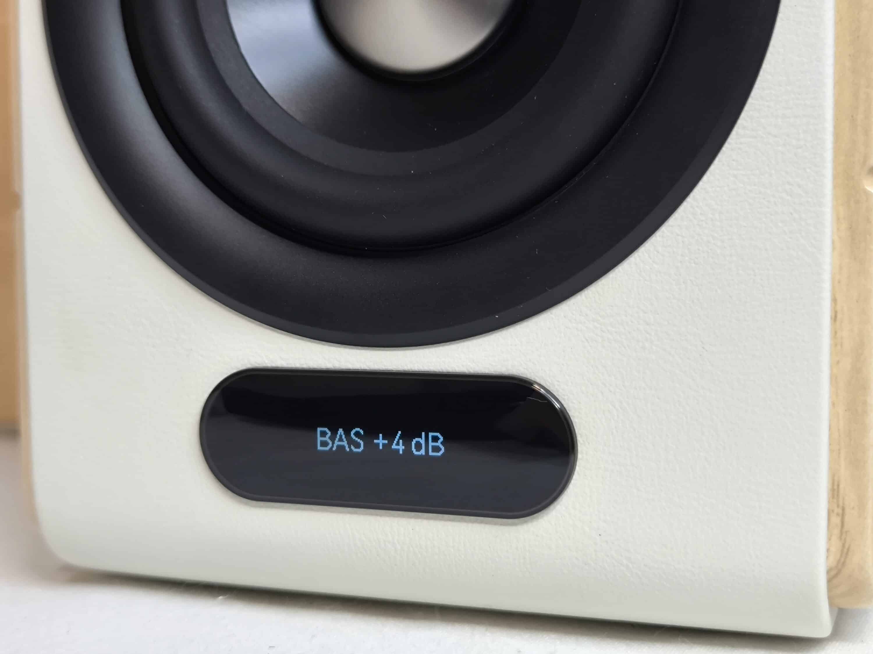 All other cornerstones, however, are very well coordinated. The small tweeter with a diameter of approx. 3.2 cm is located at the top of the front and the woofer with a diameter of approx. 9.5 cm is located underneath. The open design is probably the most striking feature, as the black cone and the white surface of the speakers blend cleverly into one another. A small OLED display with automatic dimming function is located underneath the membrane on the side of the active speaker. The passive speaker, on the other hand, has the EDIFIER logo in the same place. All controls, connections and a bass reflex port are located on the rear of the speaker pair as usual.