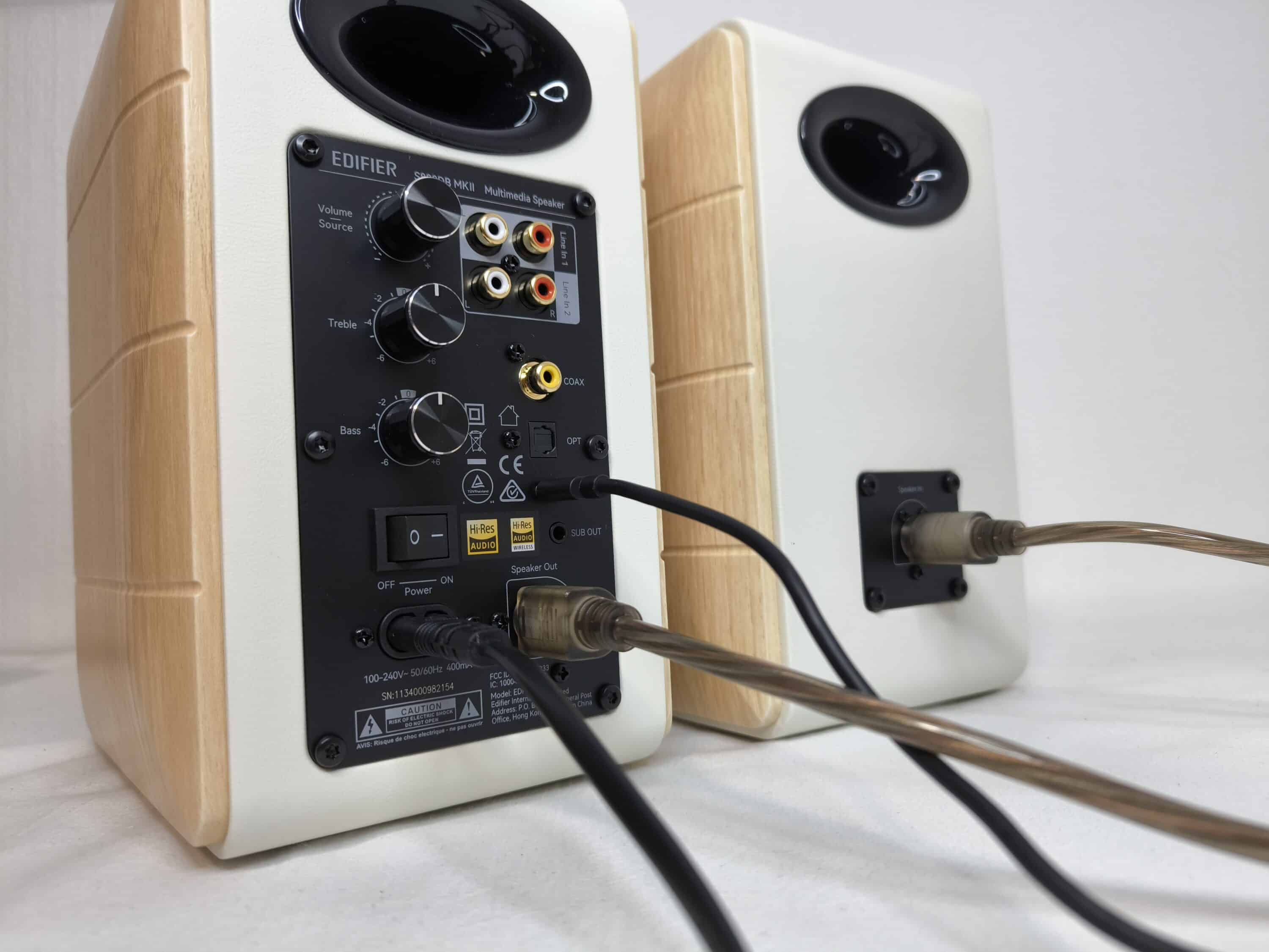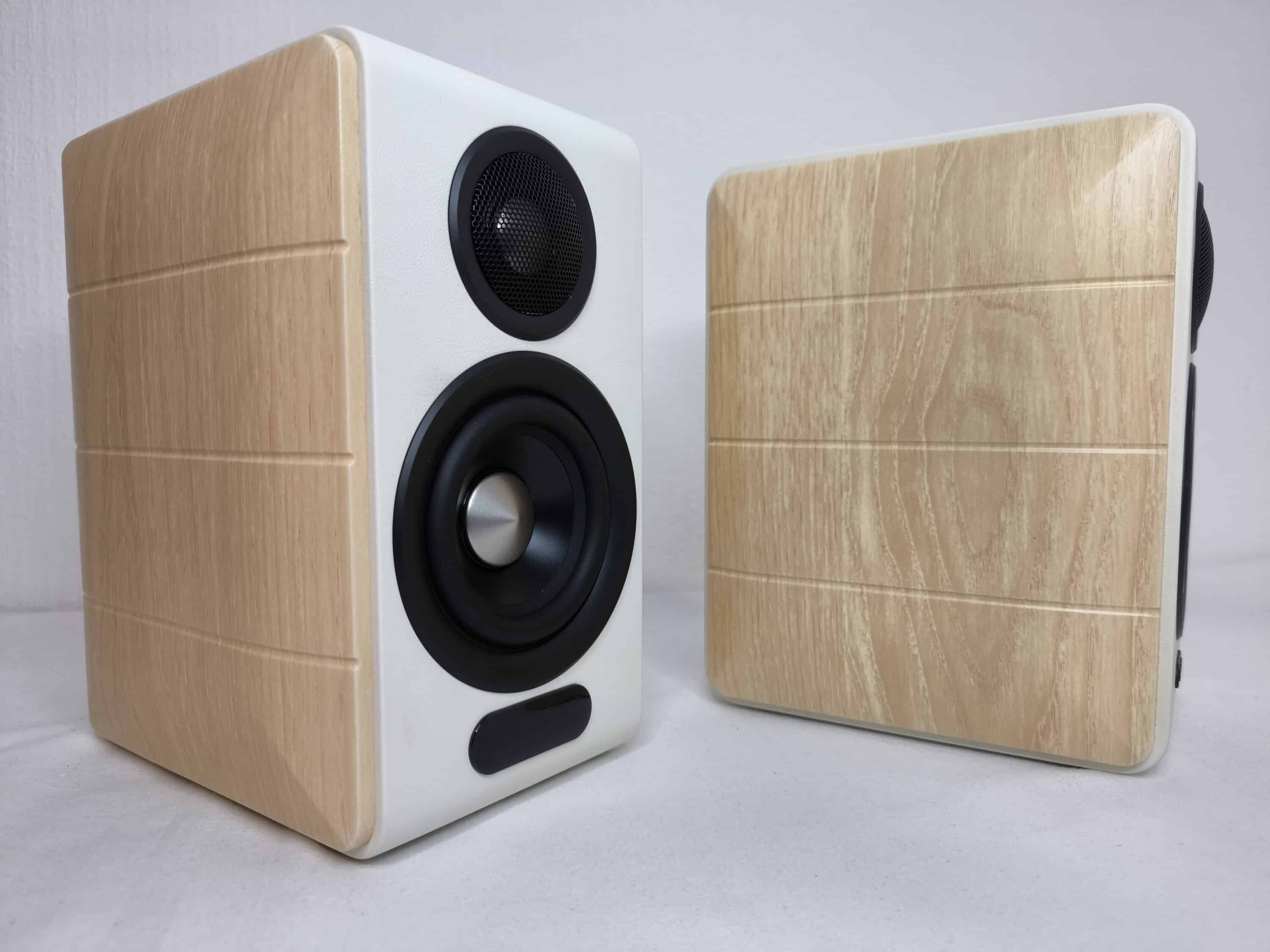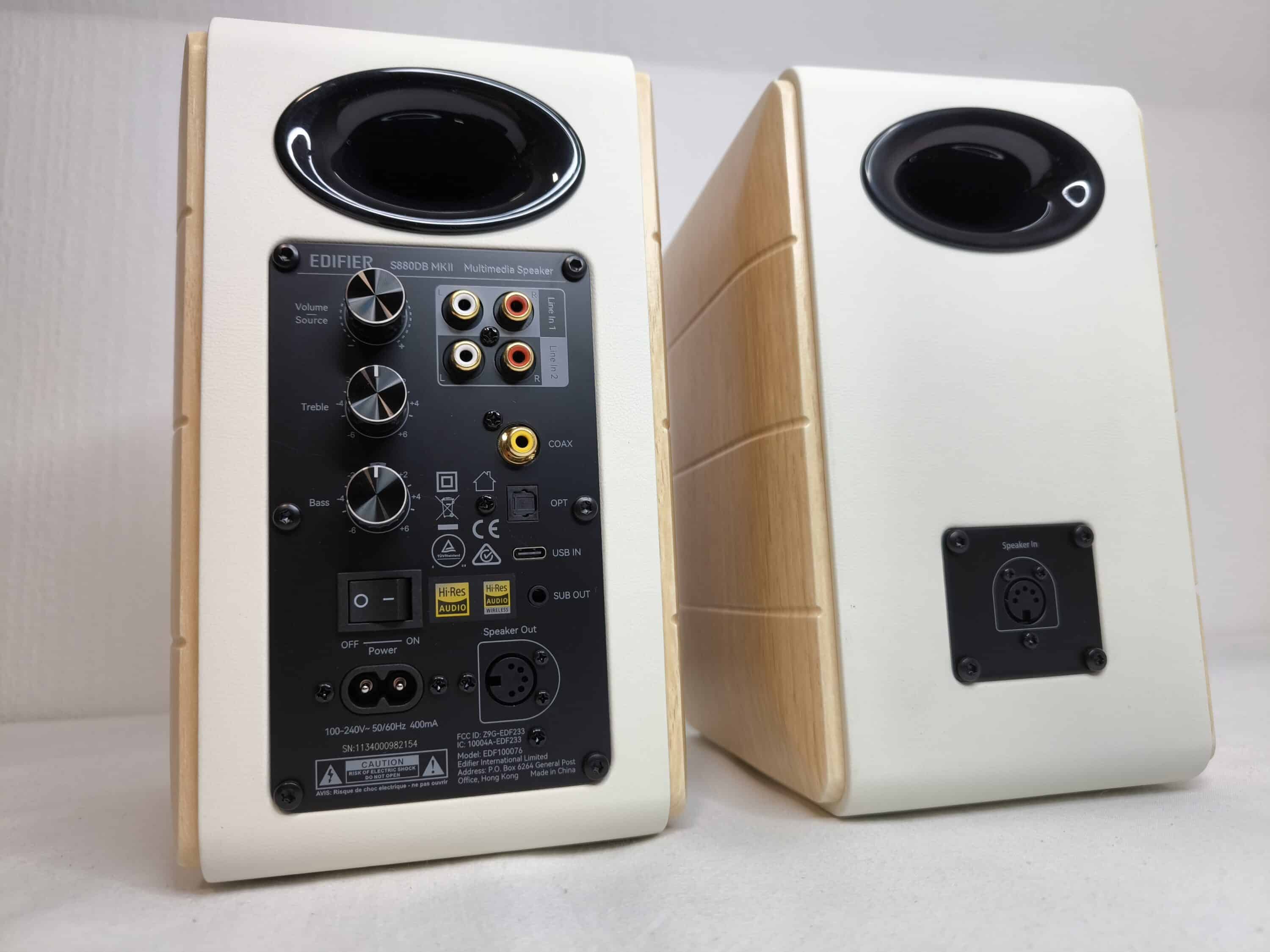 Visually, the two speakers of the Edifier S880DB MKII have a timeless design. The speakers have a wooden look on the sides and a white finish on the other parts. This makes them ideal for the desk at home, but their design also makes them easy to integrate into the living room. The Edifier S880DB MKII is probably not the right model for gamers or people who value bling-bling. You won’t find RGB lighting here.