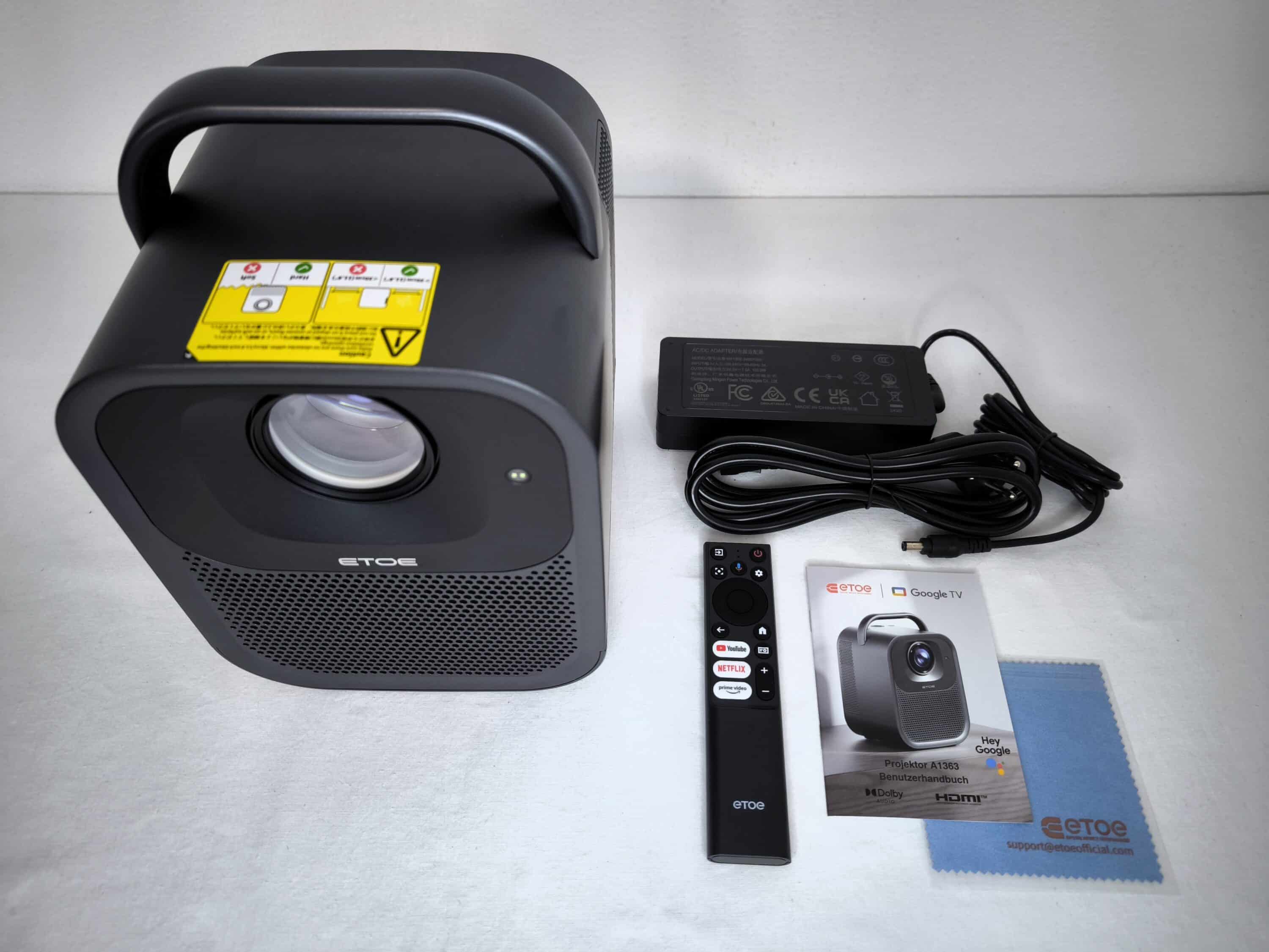 The ETOE Seal Pro projector comes well packaged. In addition to the projector itself, the scope of delivery also includes the remote control and the 180 watt power supply unit. The operating instructions and a cleaning cloth for the lens round off the package nicely. Two AAA batteries, which are not included, are required to operate the remote control.