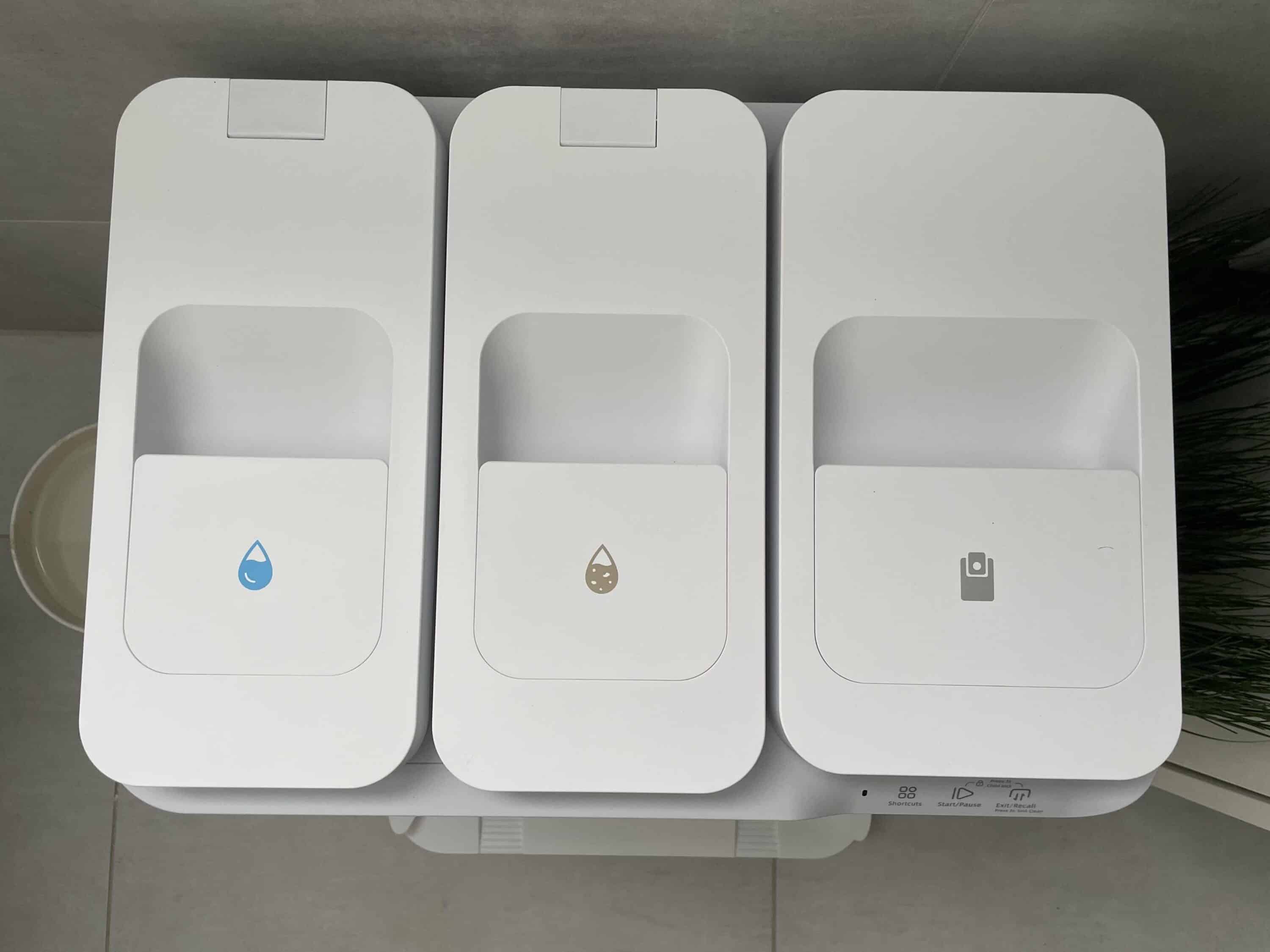 The general design of the RS20 Pro station reminds me of the Roborock S series. In particular, the three-part bin system is very similar to a Roborock S8 Pro Ultra (review). Since EZVIZ, like Roborock, places the dust container next to and not under the two water tanks, the station looks more like a cube and is not quite as high as many competitor models.