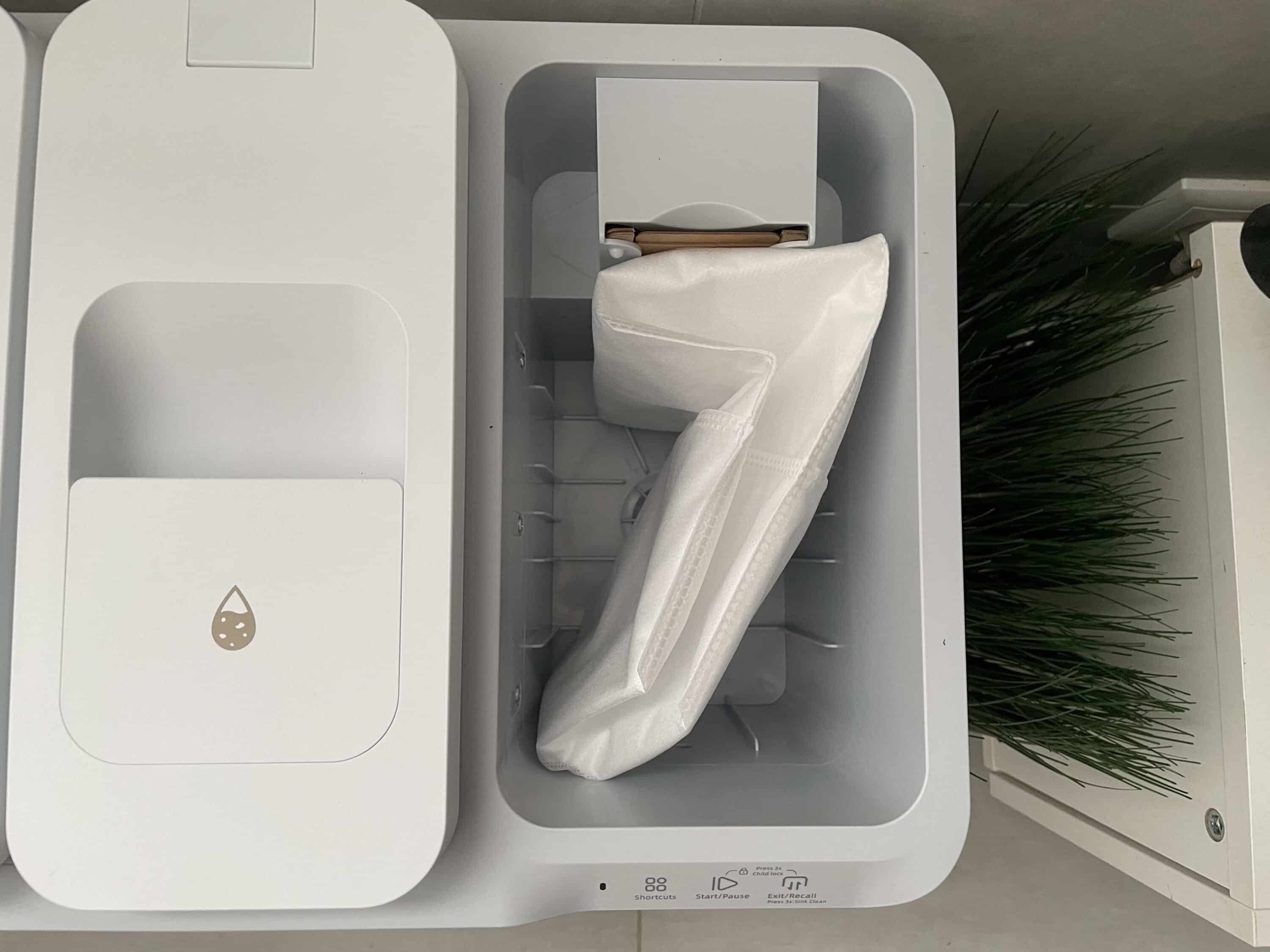 The base of the EZVIZ RS20 Pro is a genuine all-in-one station that offers various features. Firstly, there is an automatic dust emptying function. Here, the dirt collected in the small 350 ml dust container is sucked up by the station and ends up in the 5 liter dust bag.