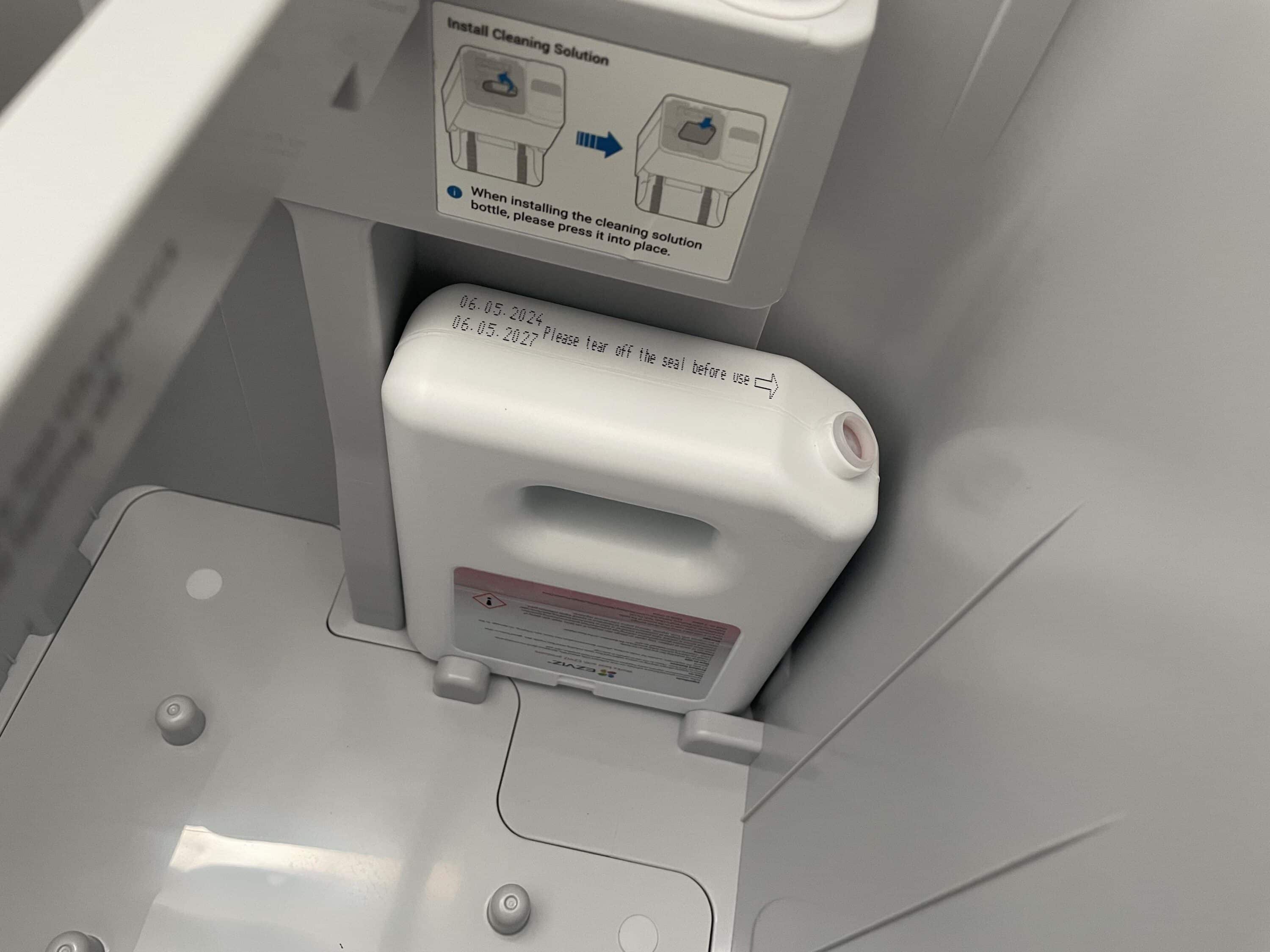 The cleaning solution included in the scope of delivery can be used directly under the water tanks. With its matt white housing, the station perfectly matches the robot hoover itself. The EZVIZ logo is emblazoned on the front. In the upper area, on the other hand, there is a small control unit that can be used to operate the smart household helper in a rudimentary way.