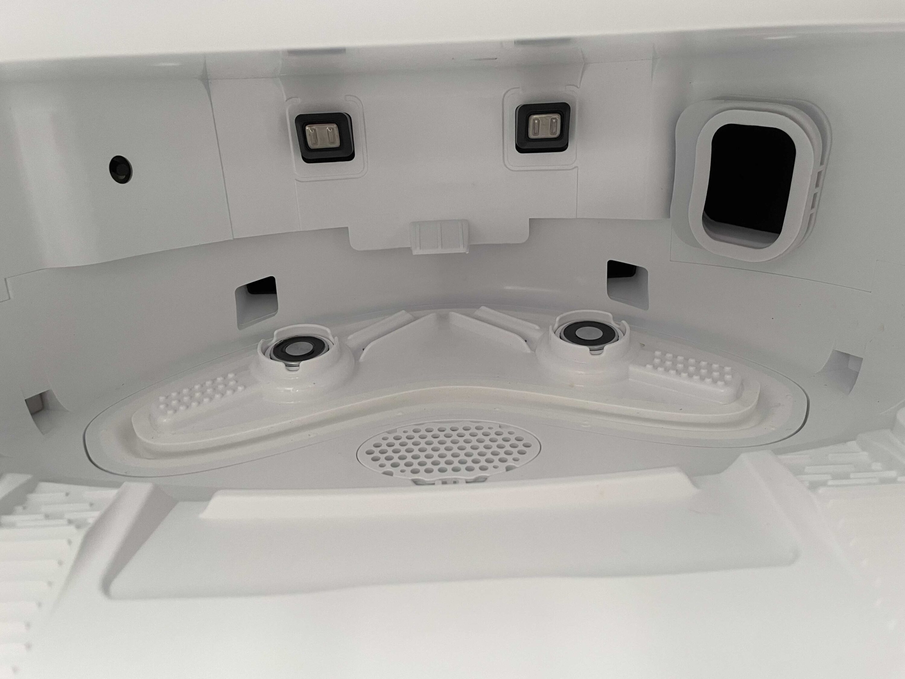 This is where the dust container is located, among other things. The camera unit and sensor strip are located at the front of the robot. This is used for obstacle detection. Further sensors are located on the left and right, which are used to measure the distance to walls. Ventilation slots, an extraction shaft and the charging contacts are located at the rear.