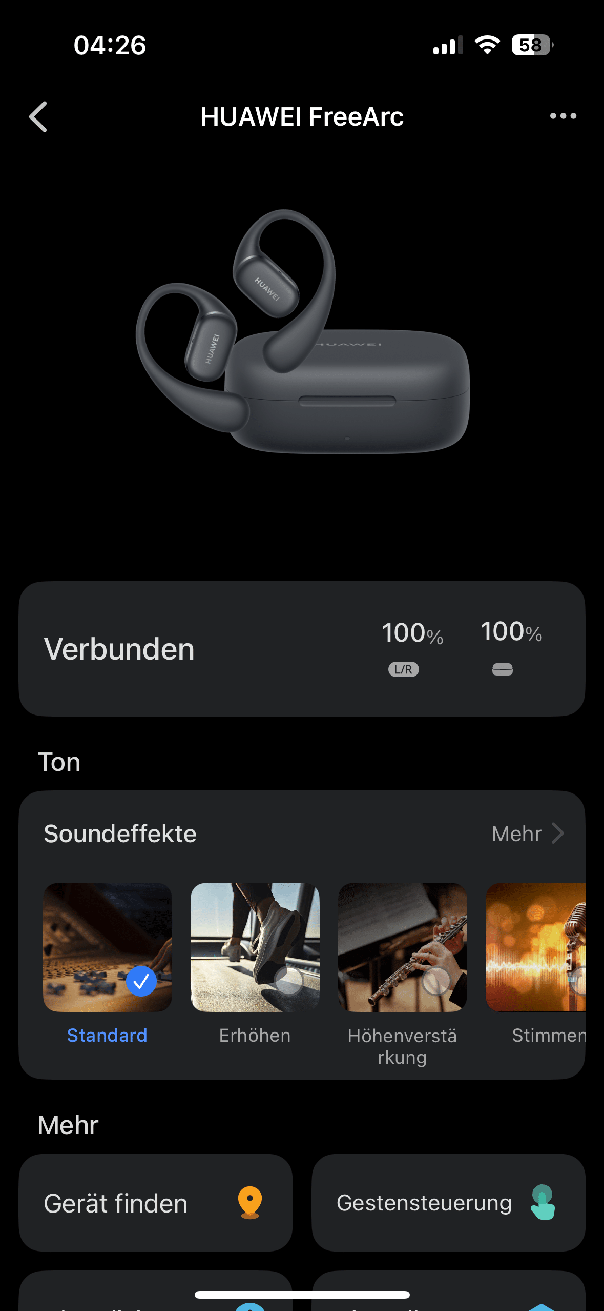 However, the HUAWEI FreeArc’s biggest sonic weakness is in the highs and upper mids, which is why instrumentalization and vocals are noticeably in the background. So if you prefer to listen to rock, metal or certain pop music, you will have to make adjustments here using the equalizer. Fortunately, the EQ preset “Treble boost” already delivers significantly better results here.