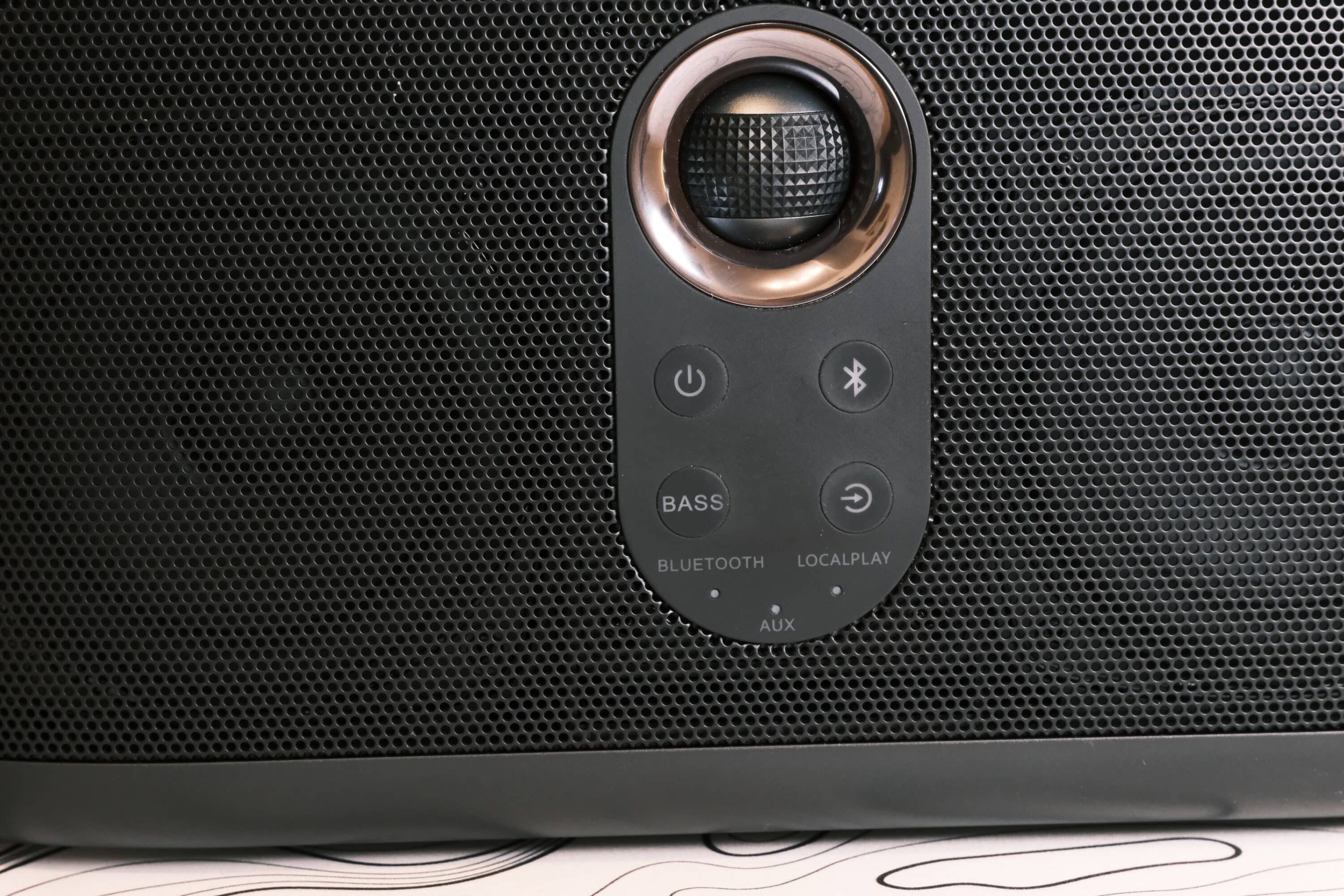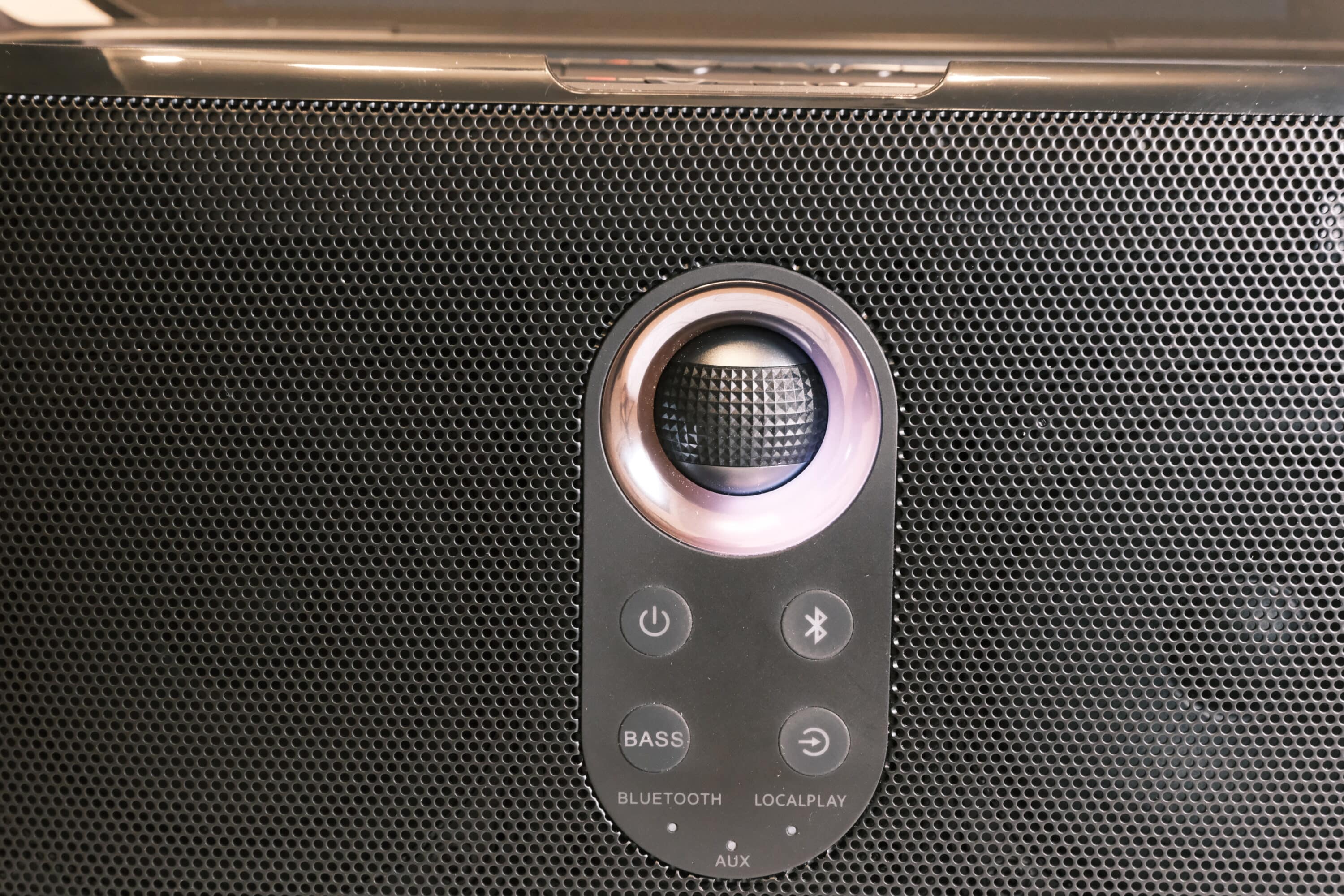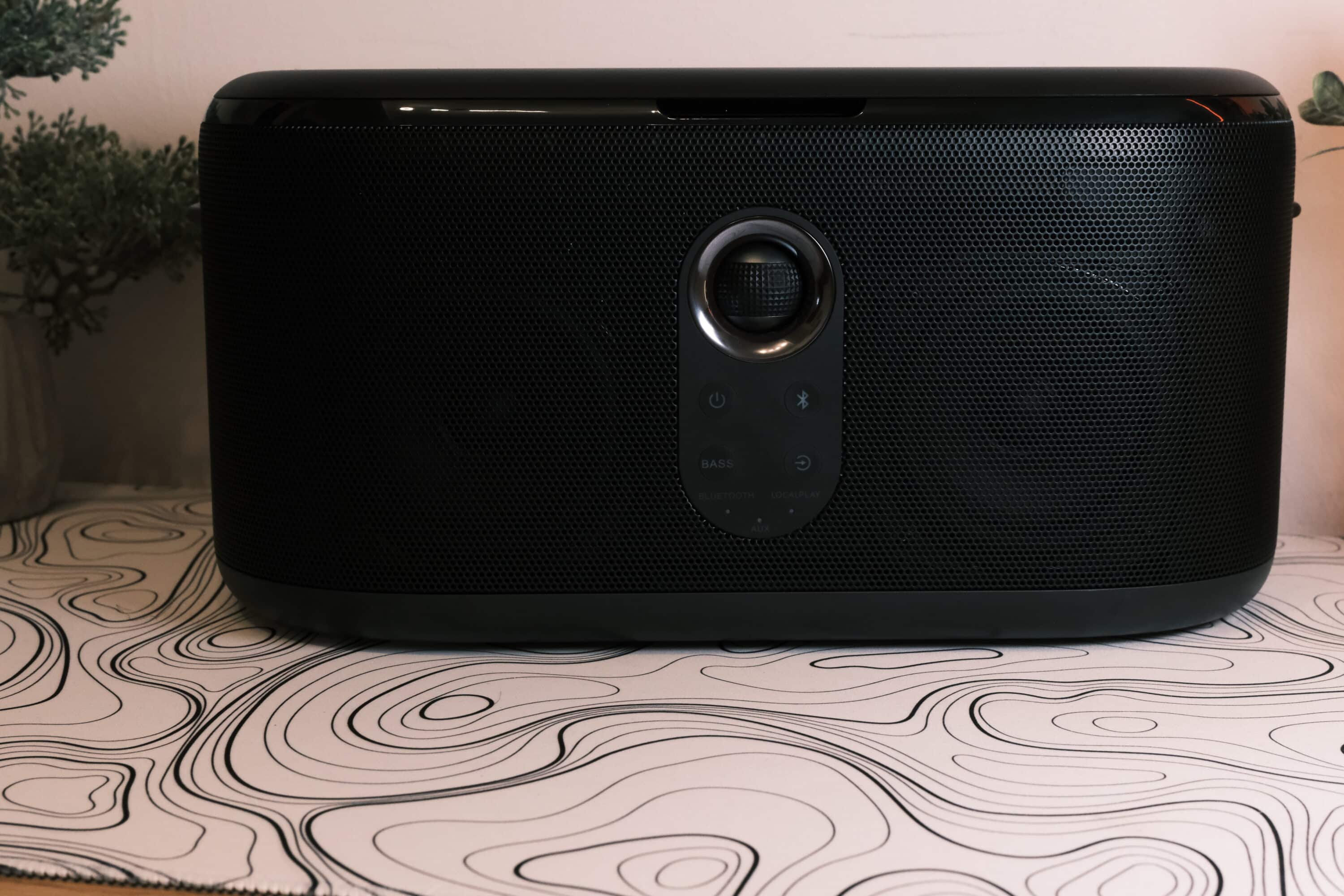 With its pill shape, the speaker is somewhat reminiscent of an old radio. A striking feature on the front is the handy, spherical control in the middle, which is framed by a ring of customizable RGB lighting. This reacts to the music, for example, shines in the desired color or changes the lighting.