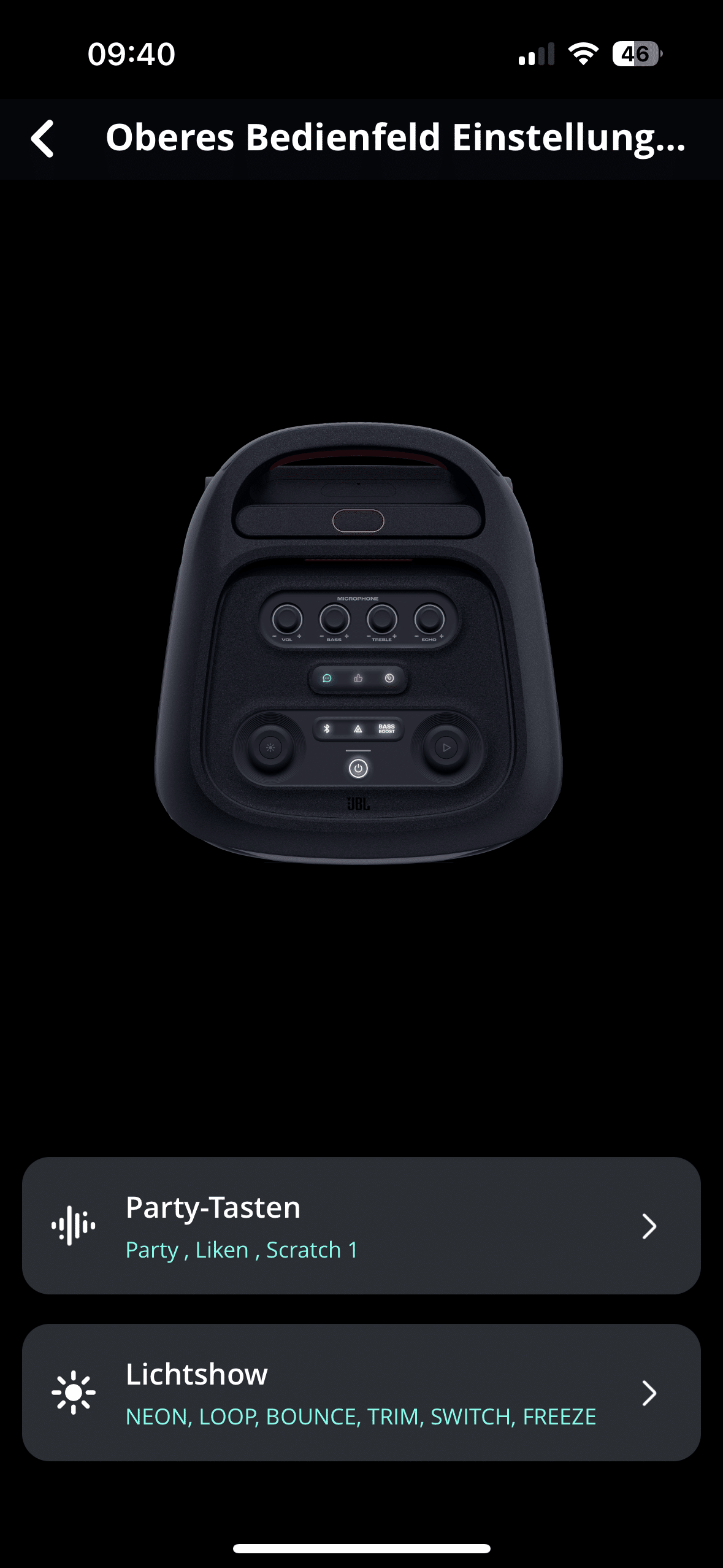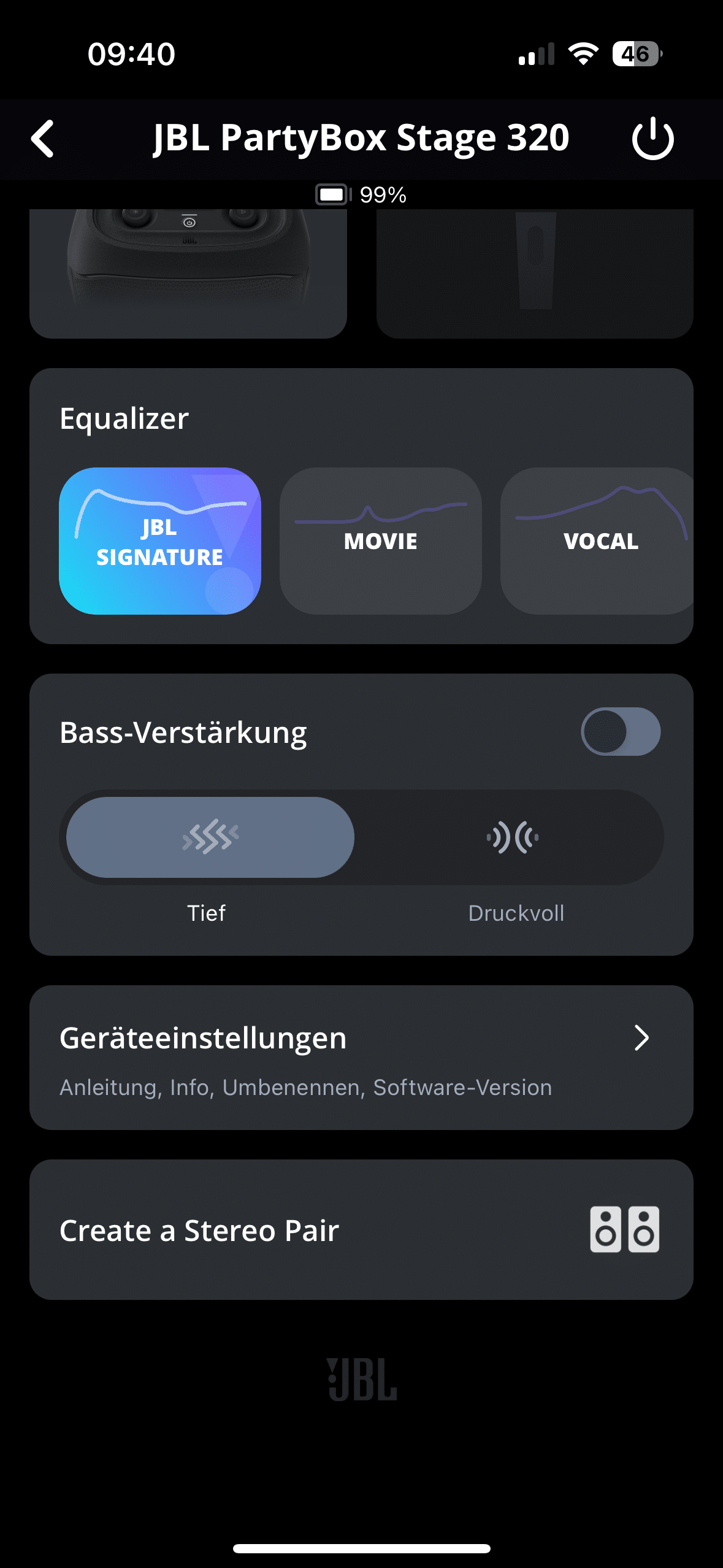 You can find even more options in the JBL Partybox app for Android and iOS. This scores with a clear, tidy design and offers, among other things, the option to control the RGB lighting or adjust the sound effects.