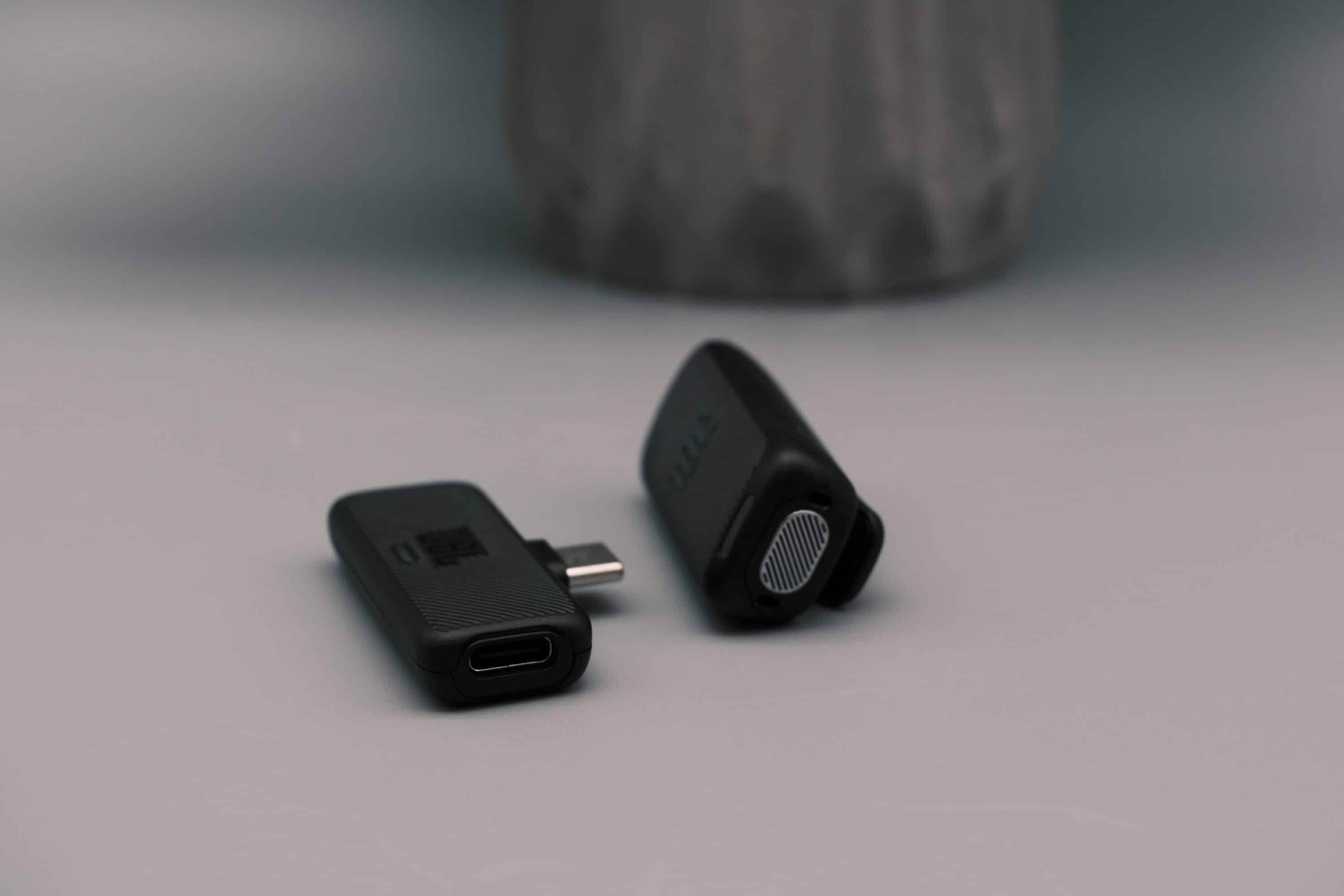The T-shaped USB-C receiver has an additional USB-C input on the side so that the smartphone can be charged while streaming or recording, for example. Very practical. The duo is housed in an equally handy charging case, which is charged via USB-C and has a three-stage charging LED on the front.