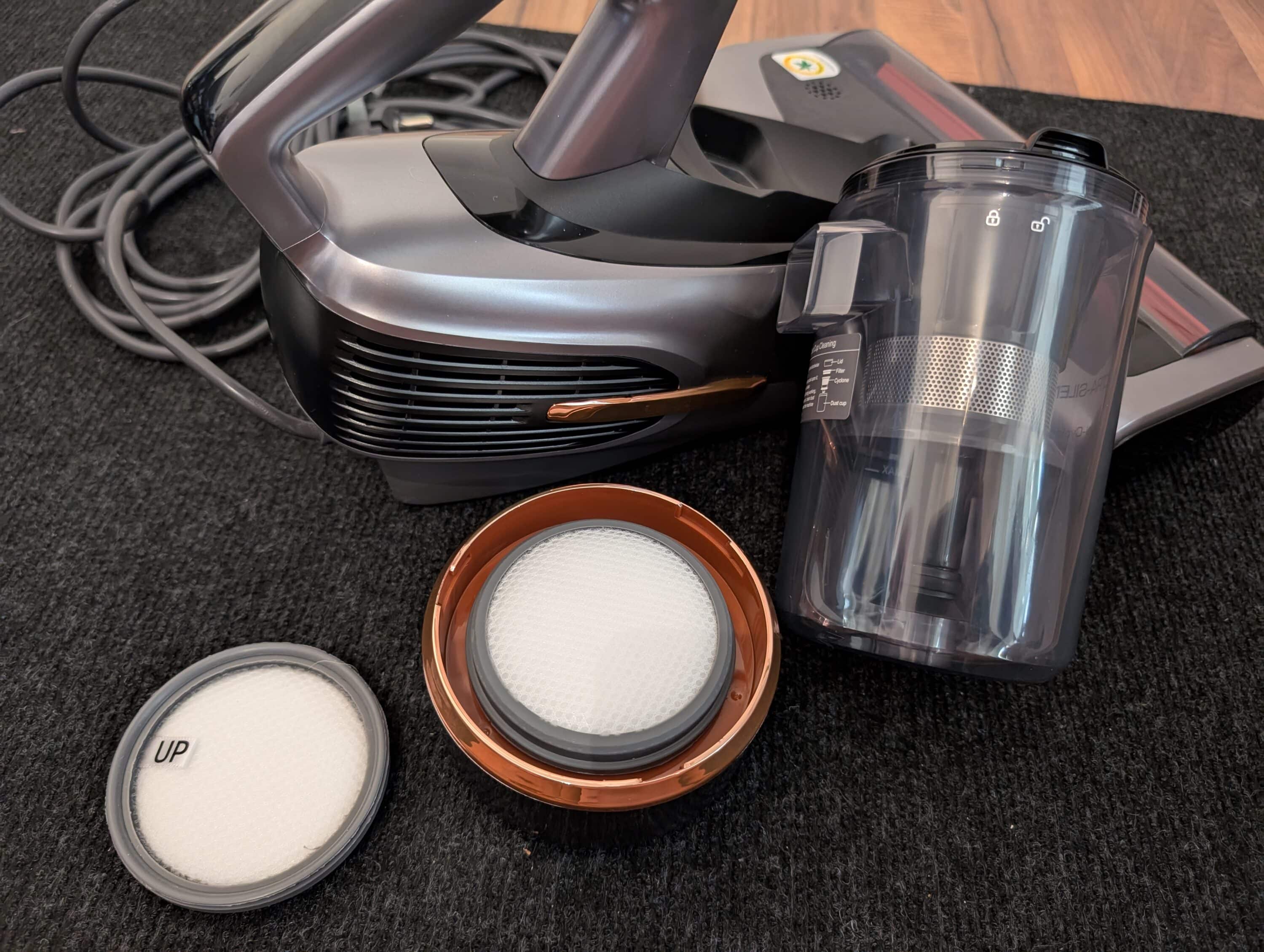 The modular design is practical: the transparent dust container can be removed at the touch of a button, as can the cyclone insert and the filters. Everything can be cleaned under running water. The mechanisms work precisely – the parts fit tightly when they should, but can be released without effort when they are needed. This makes subsequent maintenance uncomplicated.