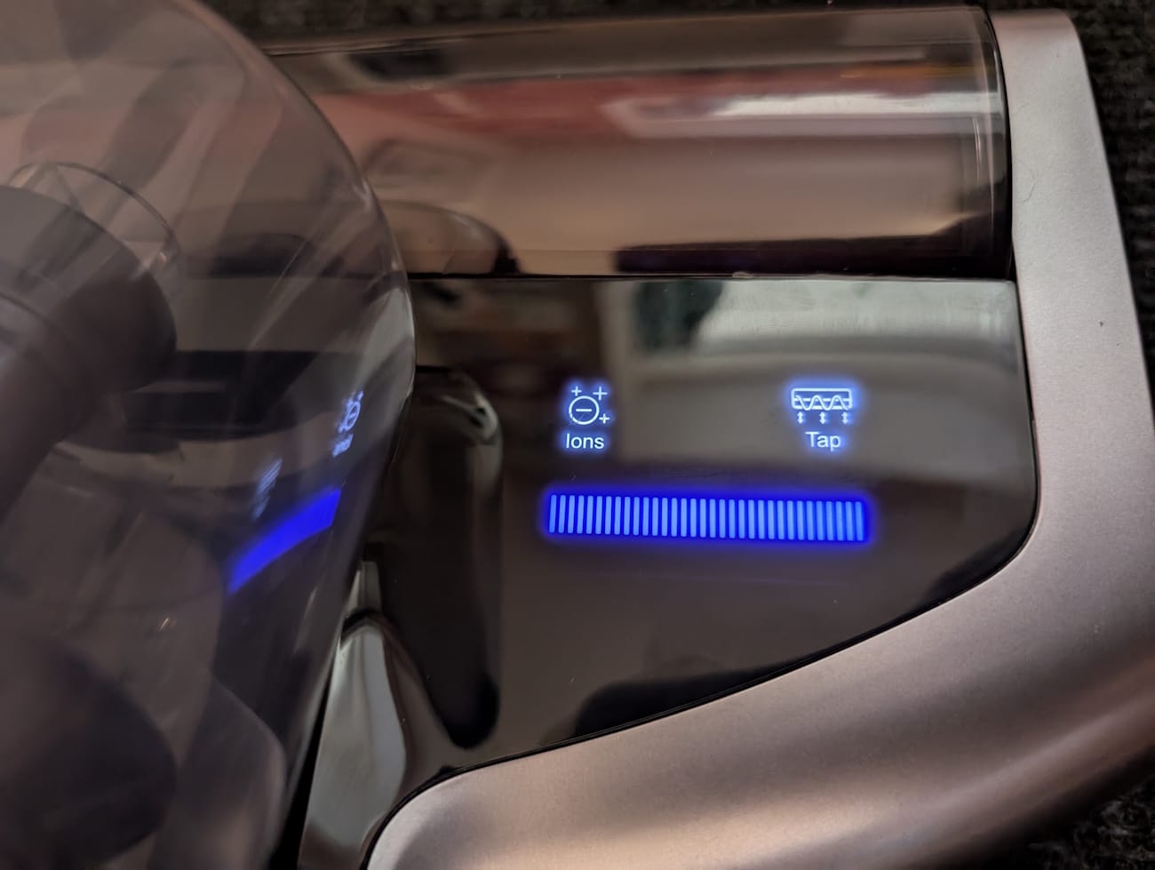 It is operated using two buttons on the handle: on/off and mode. The small display on the nozzle provides clear information about the active status and also shows the dust sensor indicator.