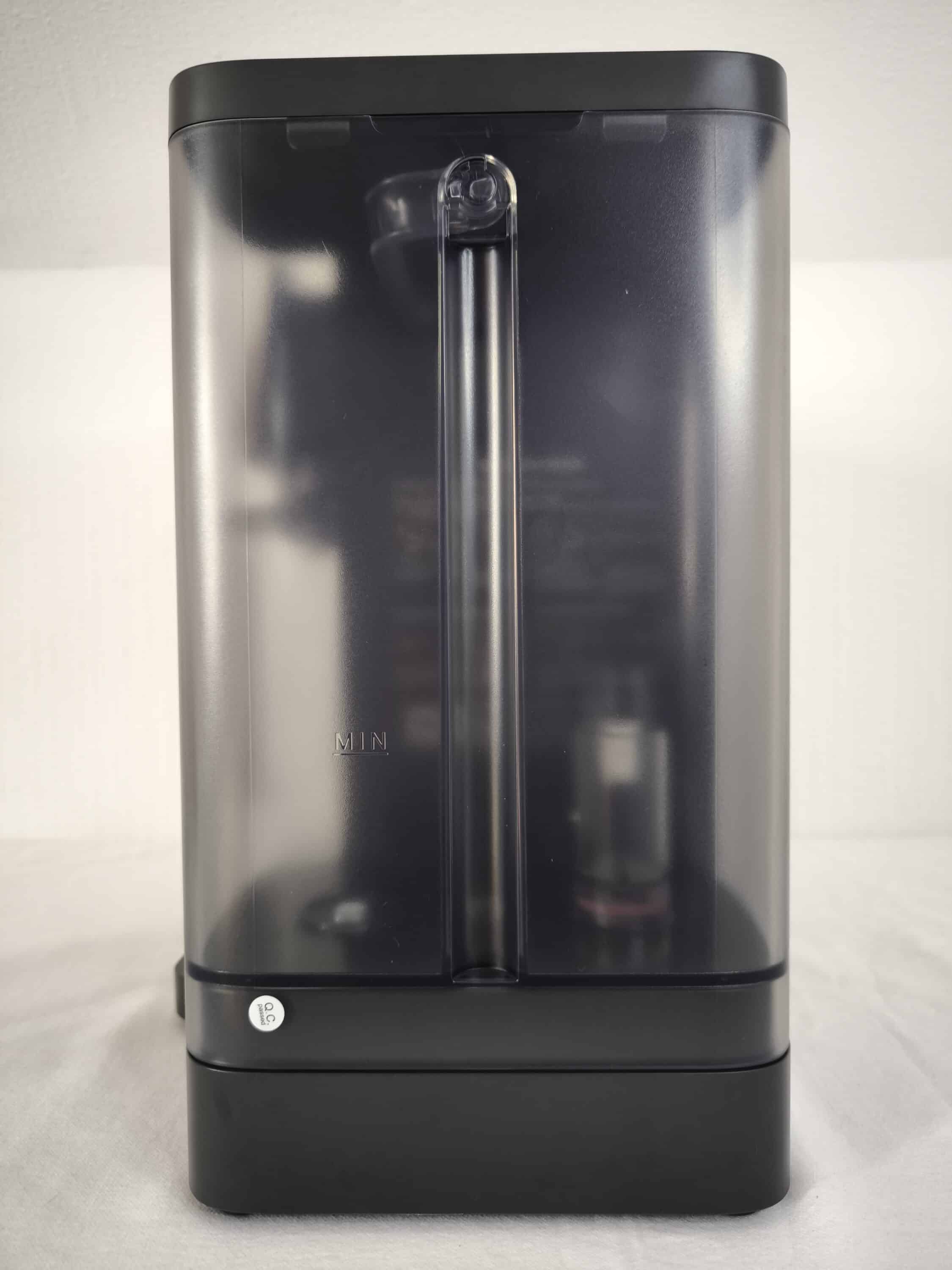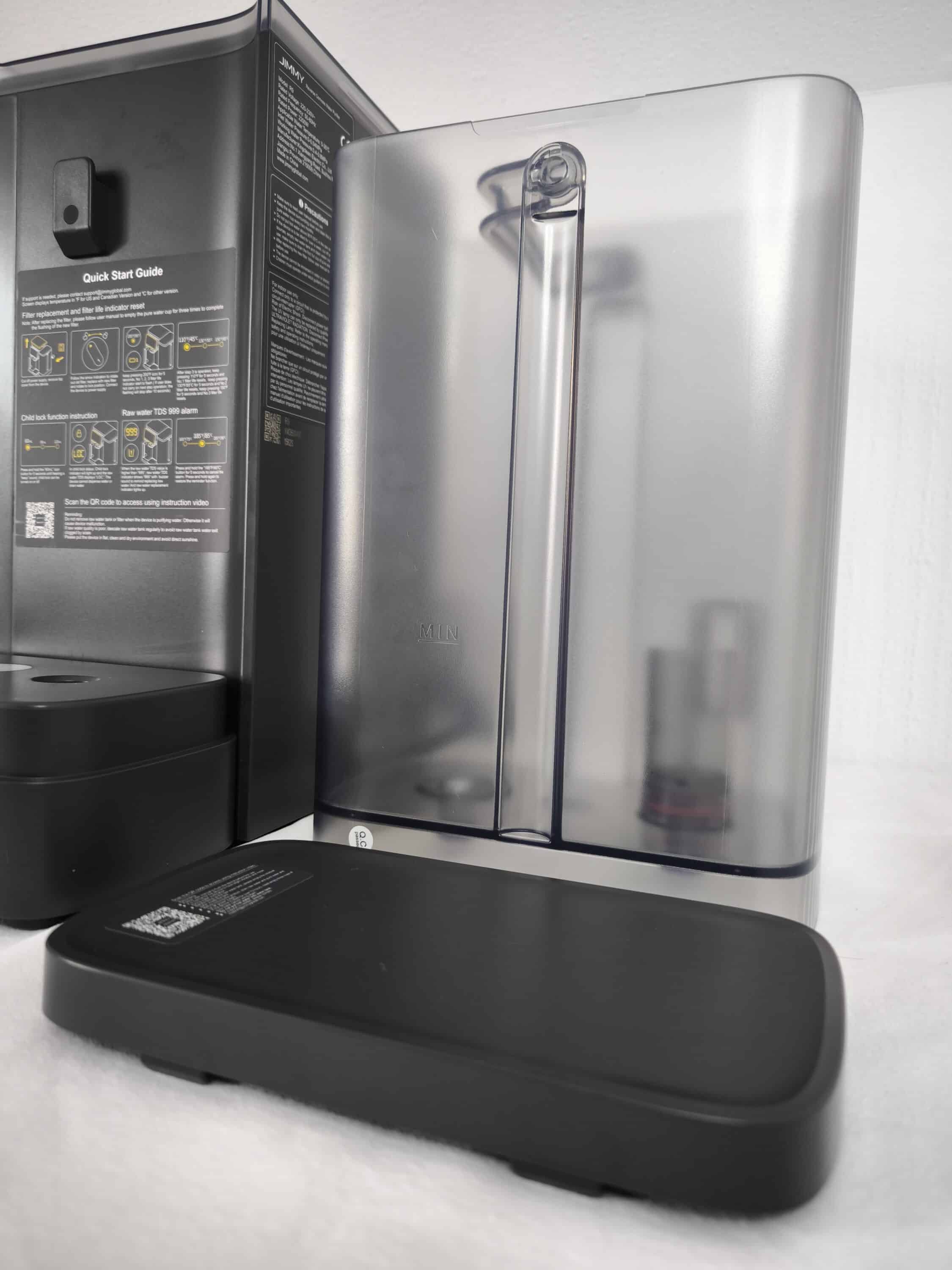 As far as the housing is concerned, high-quality plastic is predominantly used, thanks to which the machine appears both robust and easy to clean. The two BPA-free Tritan carafes, each with a capacity of 1 liter, also give the impression of durability and have a practical UV sterilization function when inserted. This prevents the problem that often occurs with classic jugs if they are left standing for a long period of time. This is when bacteria build up and increase in number. The three integrated filters have different lifespans: filters 1 and 3 last for around 1,800 liters or 12 months, filter 2 even lasts for 3,600 liters or 24 months.