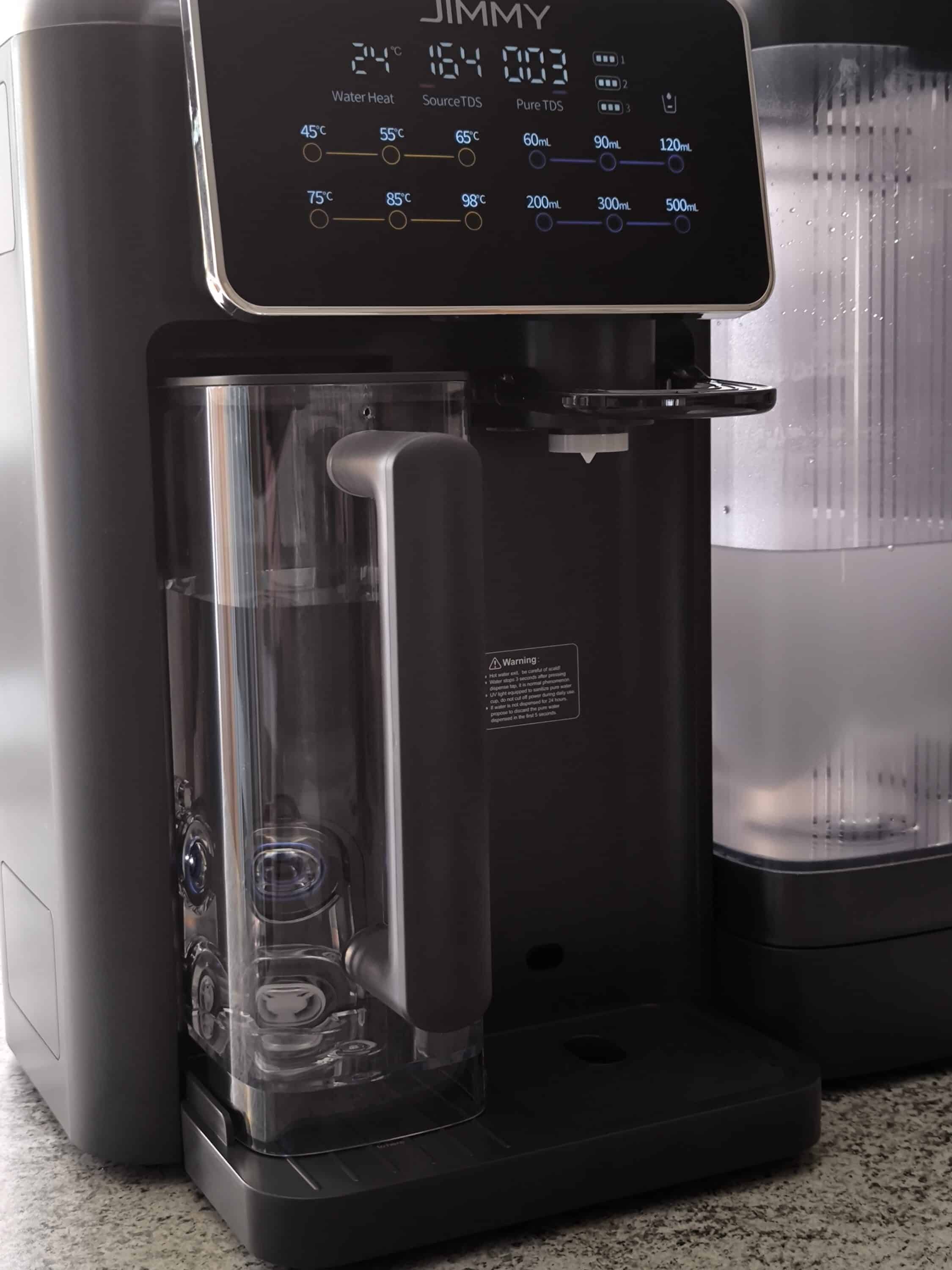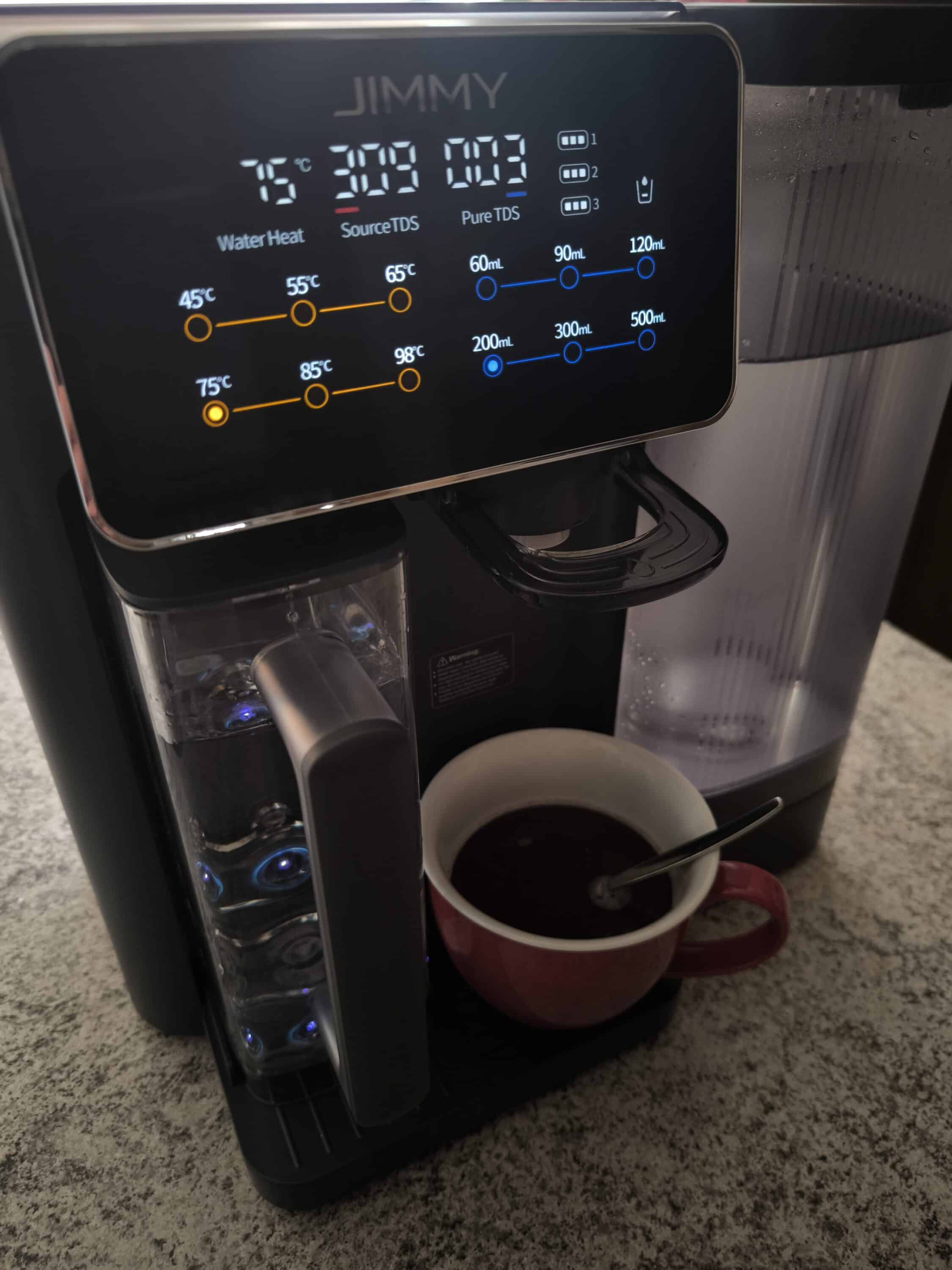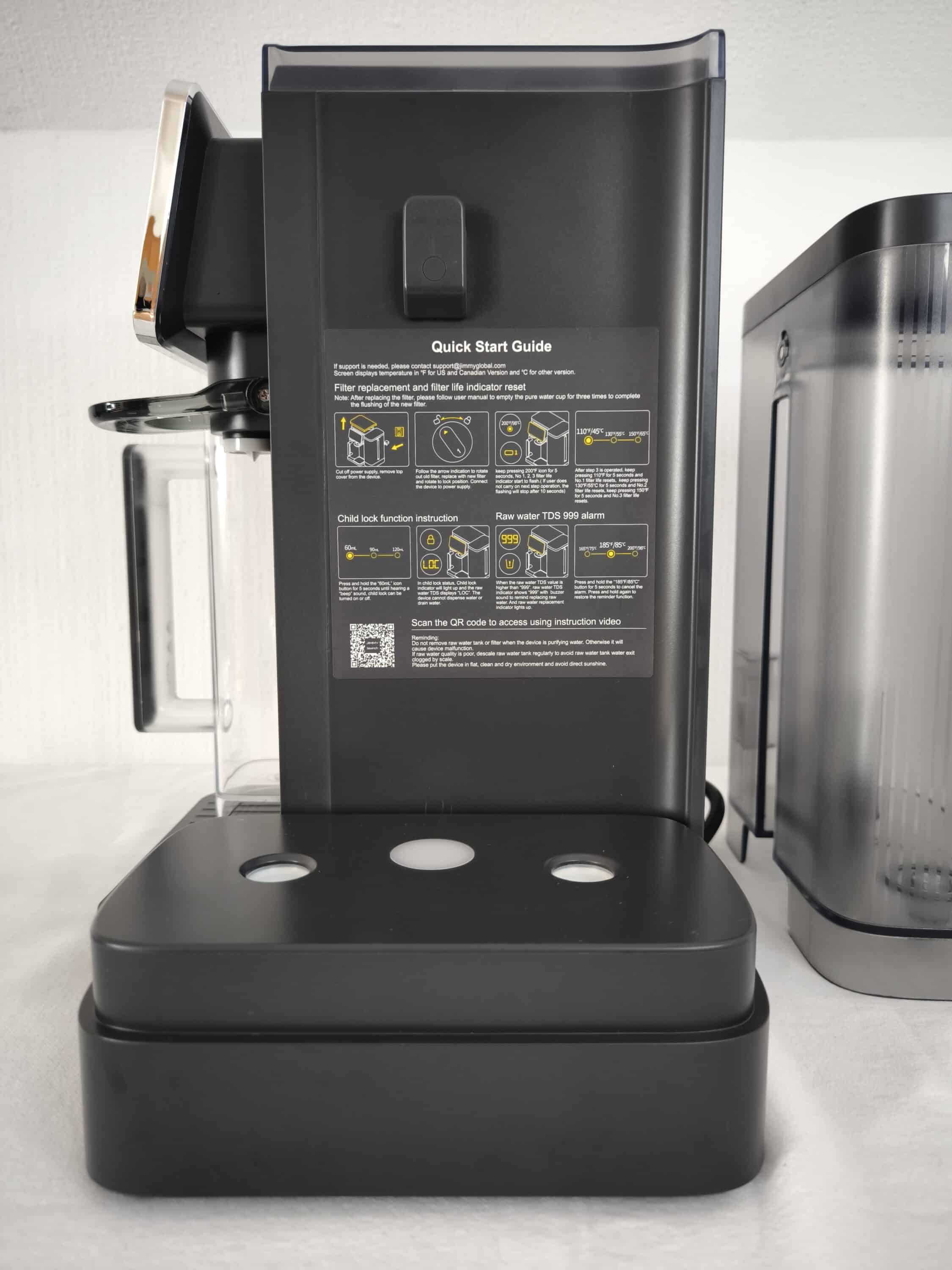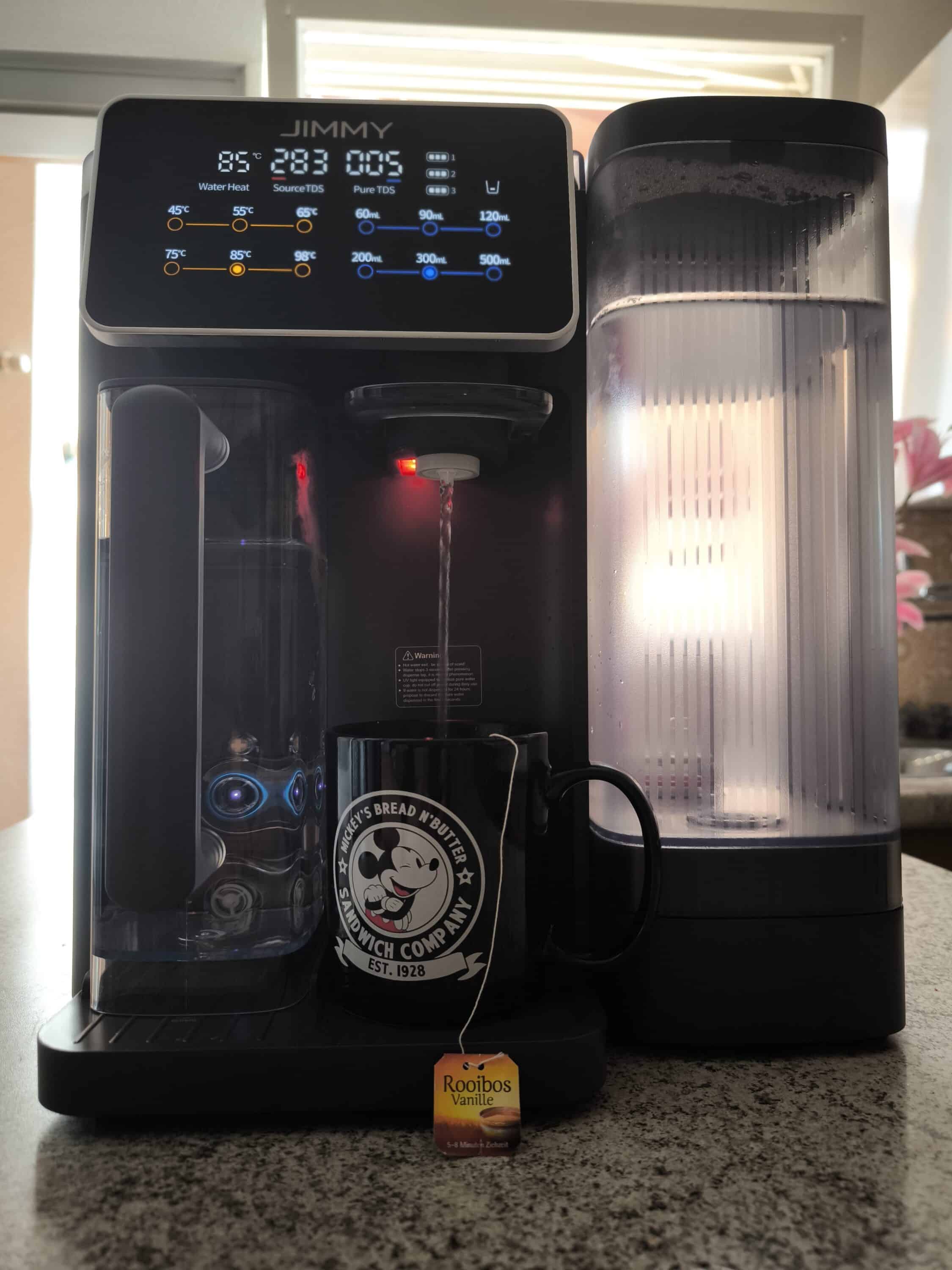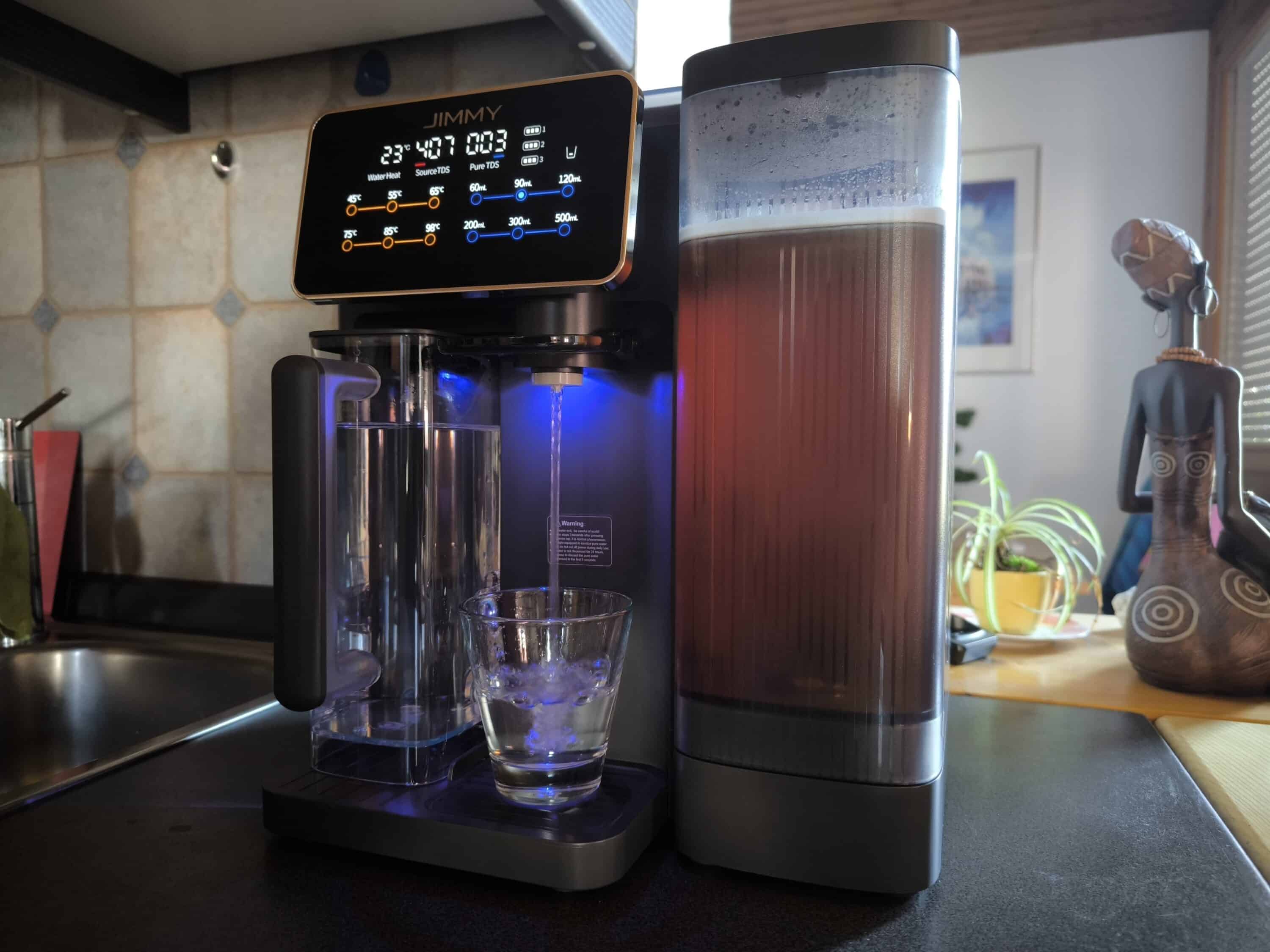 In terms of use, it is extremely easy to prepare both drinking water and hot water for tea or coffee. This is ensured by the easy-to-read smart touch display, which allows you to set the temperature as well as the amount of water. The real-time display of the TDS values is particularly exciting: we originally assumed that the “Source TDS” value would be very low at our location in Germany anyway, but we were convinced otherwise. In the end, the filtered water reached a significantly lower value – the JIMMY R9 therefore performed effective filtering work.