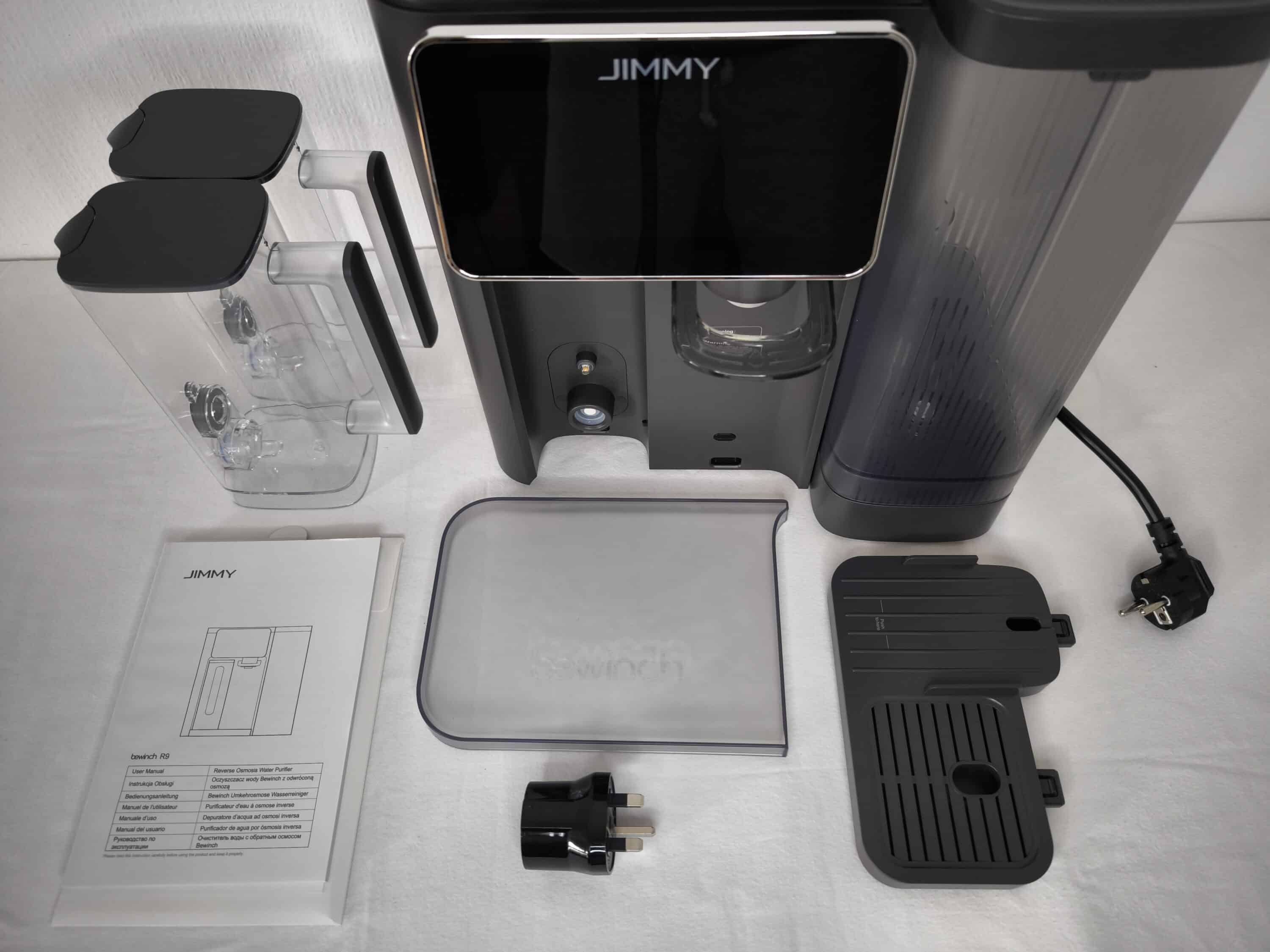 In addition to the water filter machine itself, the scope of delivery also includes two water carafes, a power adapter and, of course, the operating instructions. The JIMMY R9 is initially made up of individual parts ex works, meaning that the top cover and water tray still need to be inserted at the start. There are no further work steps, which is why the machine is ready for use in no time.