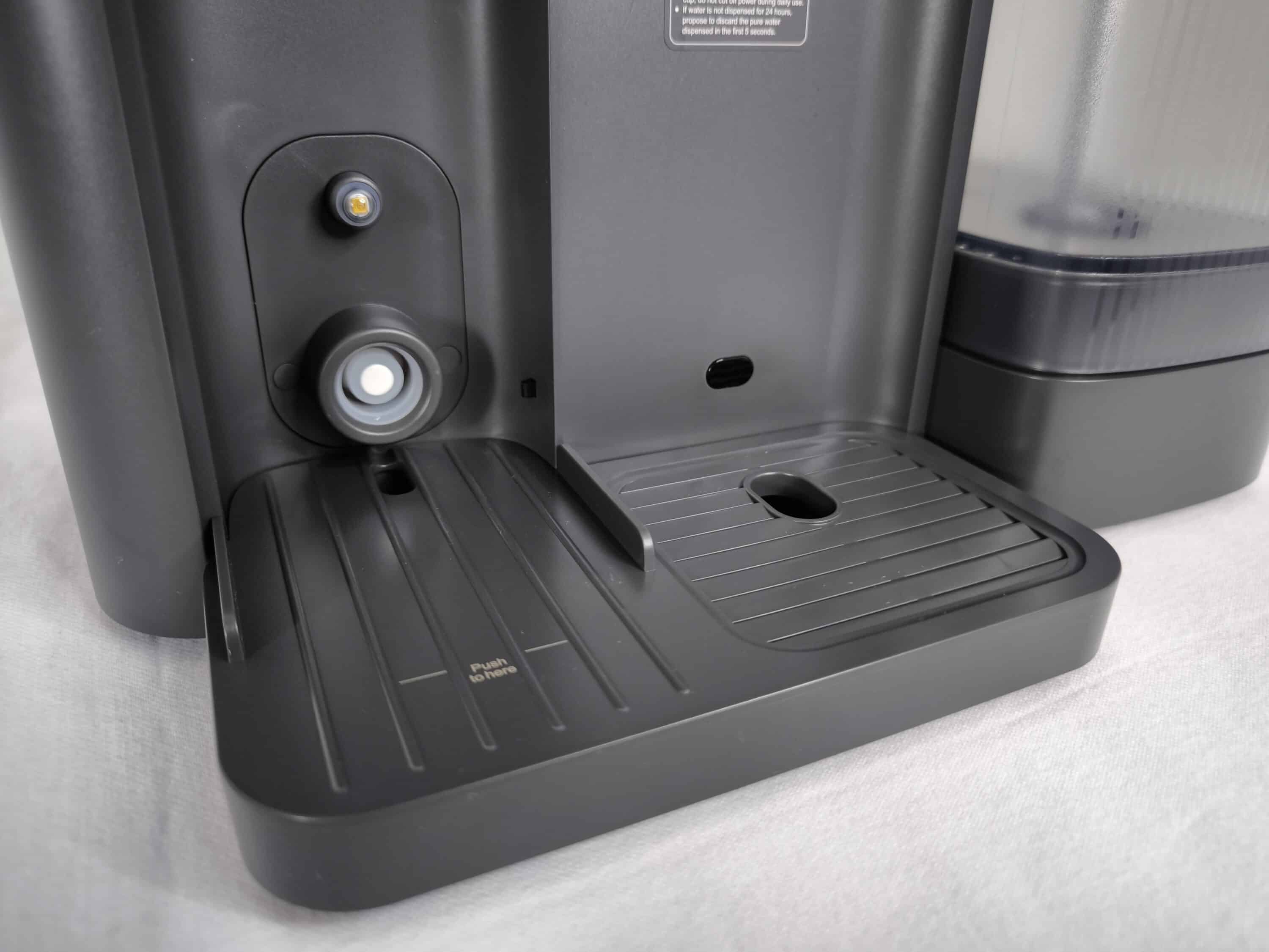 It is also used to set the temperature, which can be adjusted in seven stages. The standard output is at room temperature, while six further levels can be selected by touch. The same applies to the fill level, which covers six levels from 60 ml to 500 ml. In addition, information such as the service life of the three filters and other indicators can be viewed. The integrated child safety lock should also be exciting for families, so that no more water is left out after activation – this reduces the risk of scalding with hot water. To switch it on, simply press and hold the button for 60 ml for a few seconds. Pressing it again for several seconds deactivates the childproof lock.