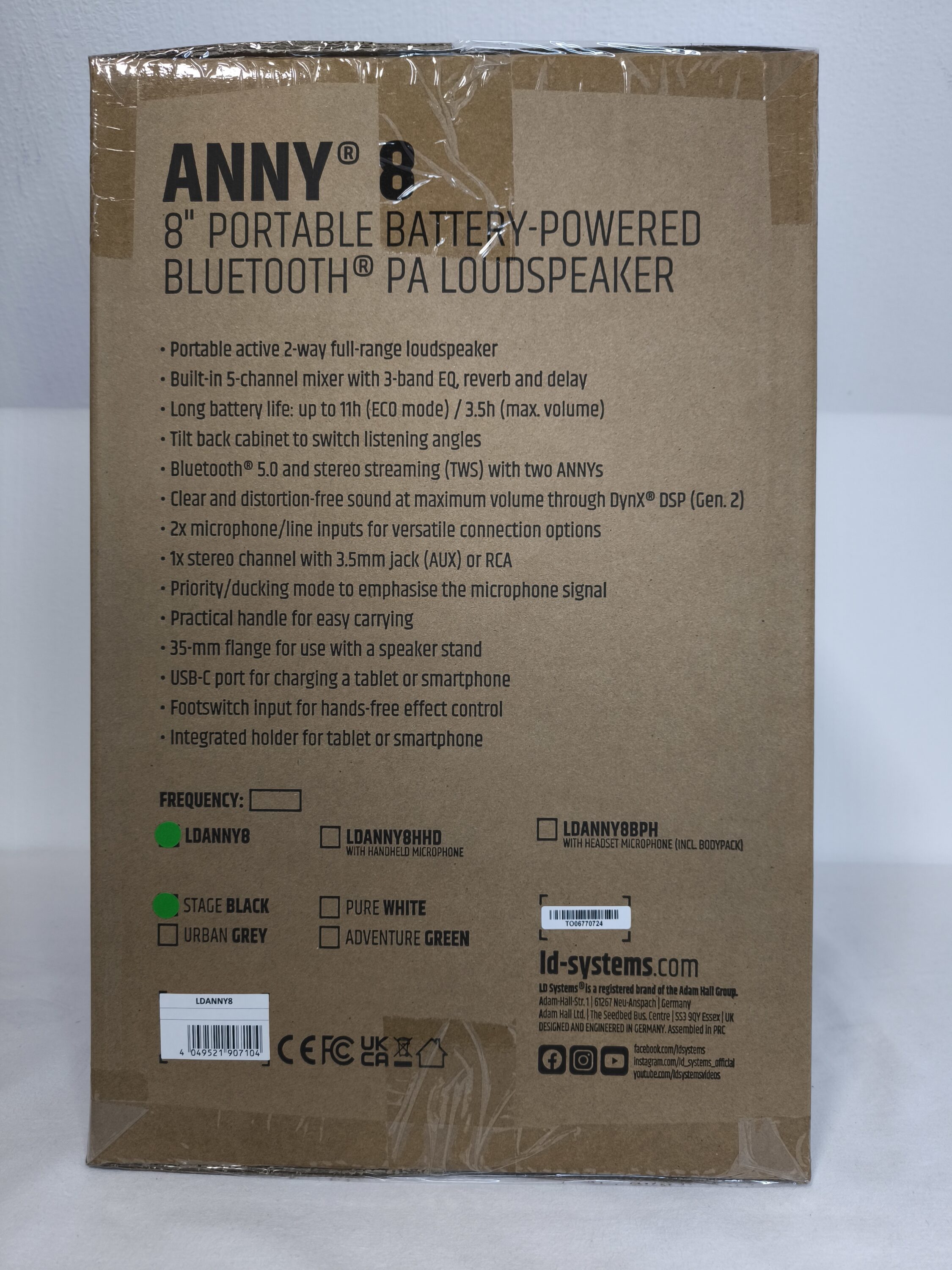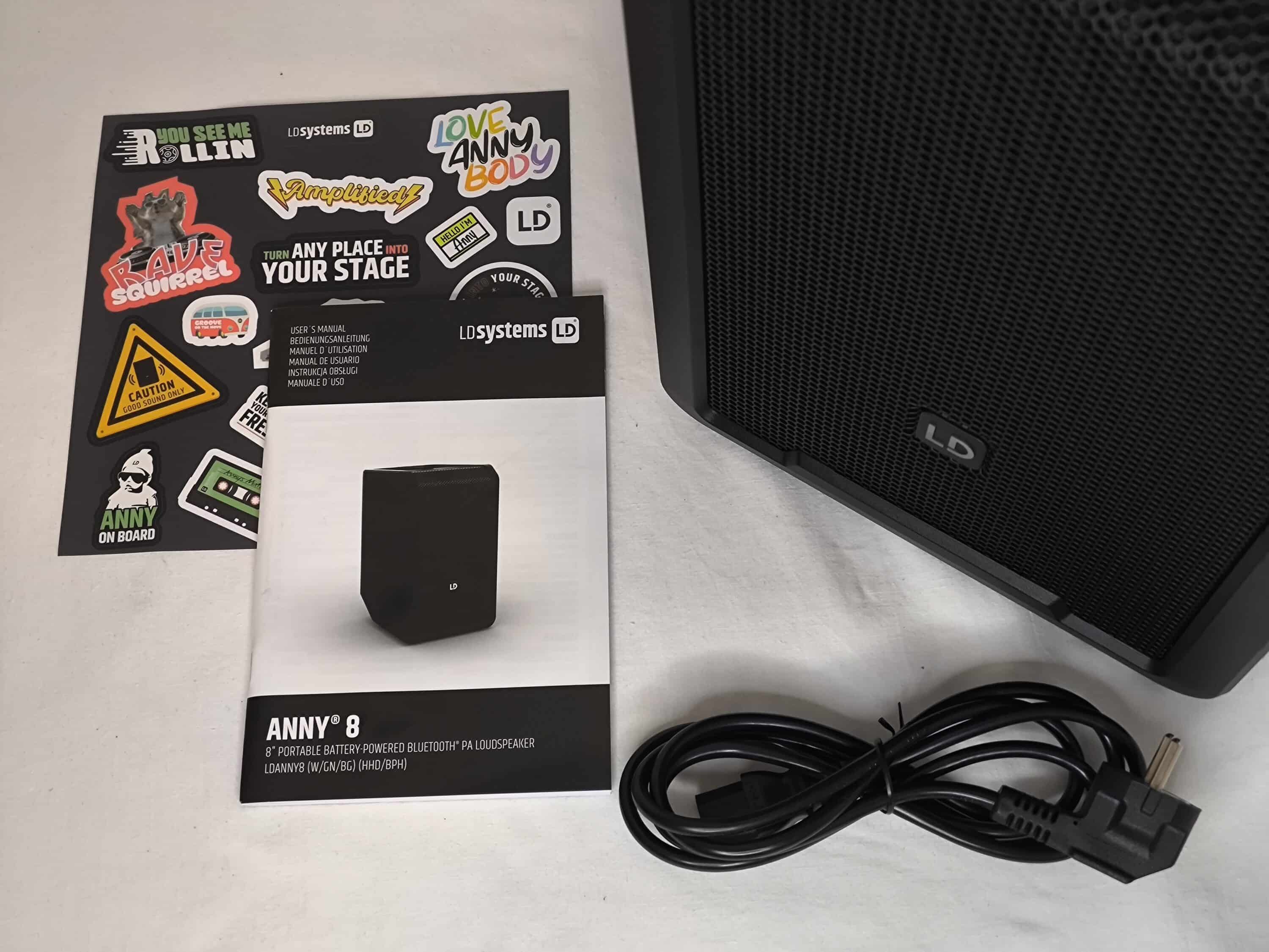 The LD Systems ANNY 8 is transported in a double box to ensure that the contents of the packaging are adequately protected. In addition to the ANNY 8 itself, the scope of delivery also includes the associated mains cable with operating instructions and a set of stickers.