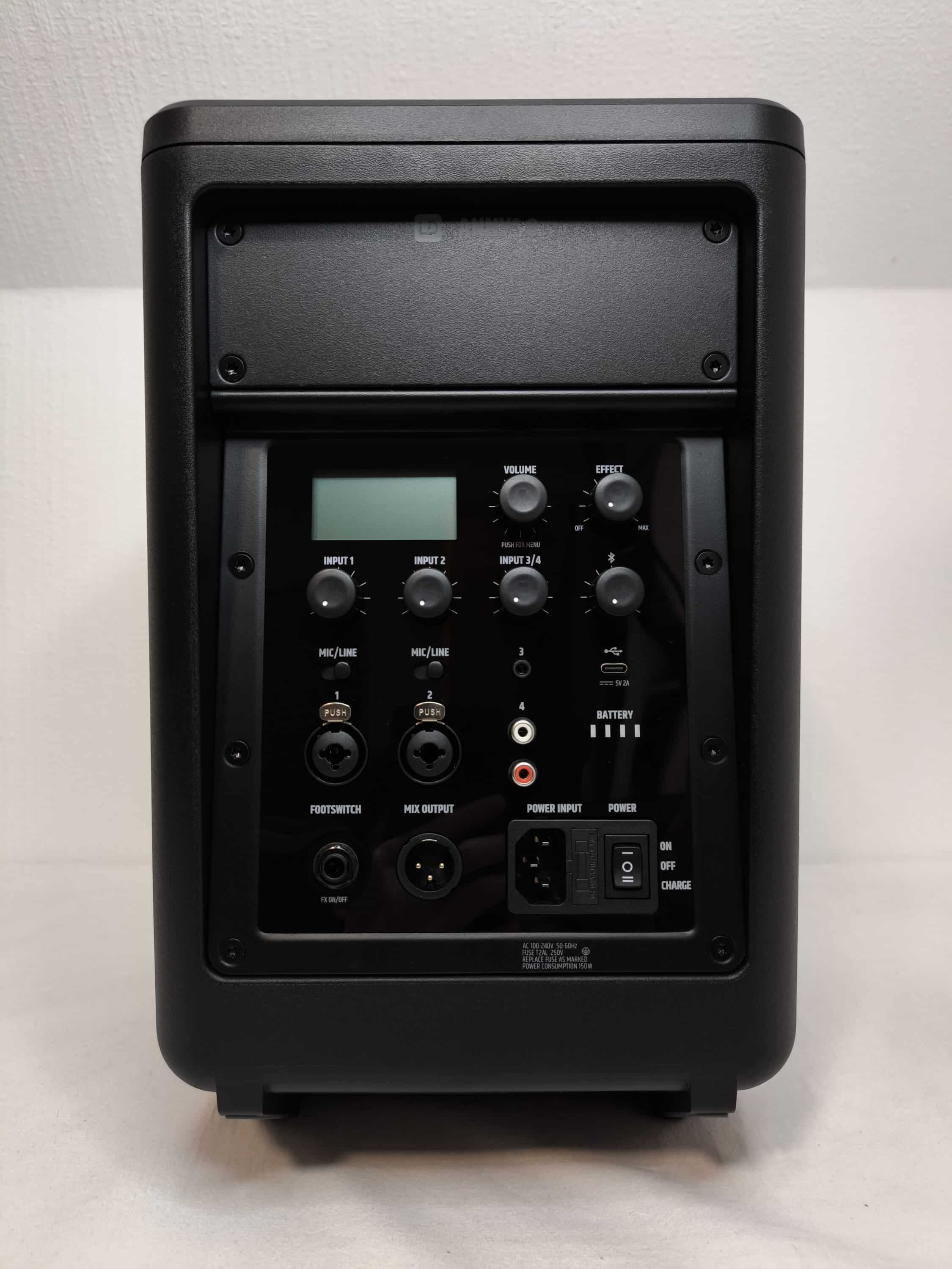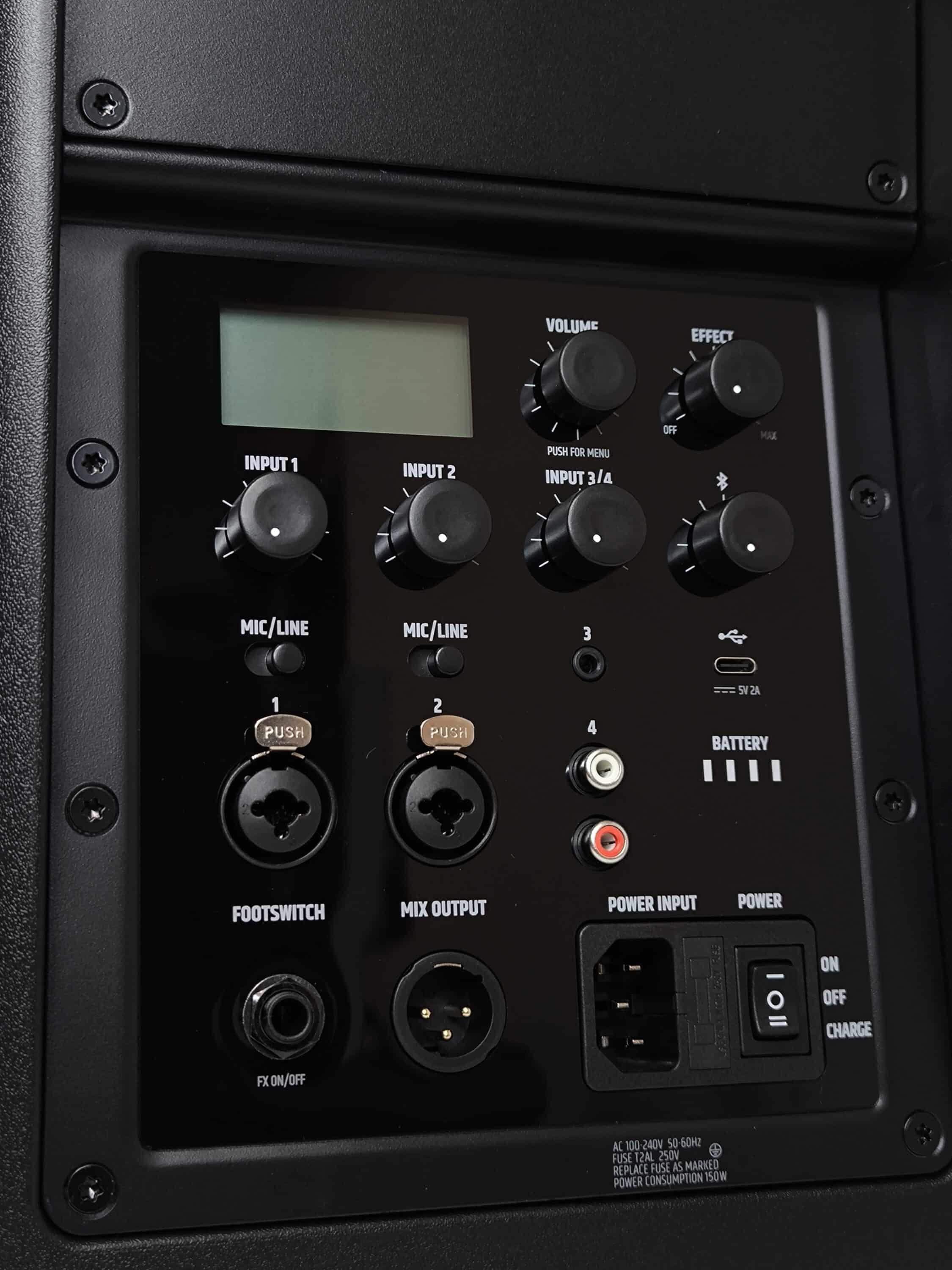 The LD Systems ANNY 8 is controlled via the volume control, which is located to the right of the LCD display. Unlike the other controls, this can also be pressed to navigate through the menus. In addition, there are dedicated rotary controls in the second row, which can be used specifically to influence the volume of the respective input. The next row contains two combo sockets for mic/line and a stereo channel with 3.5 mm jack and AUX respectively. There are also two connections for RCA and an XLR mix output next to the mains connection. This gives the ANNY 8 a total of five physical inputs and one mix output.